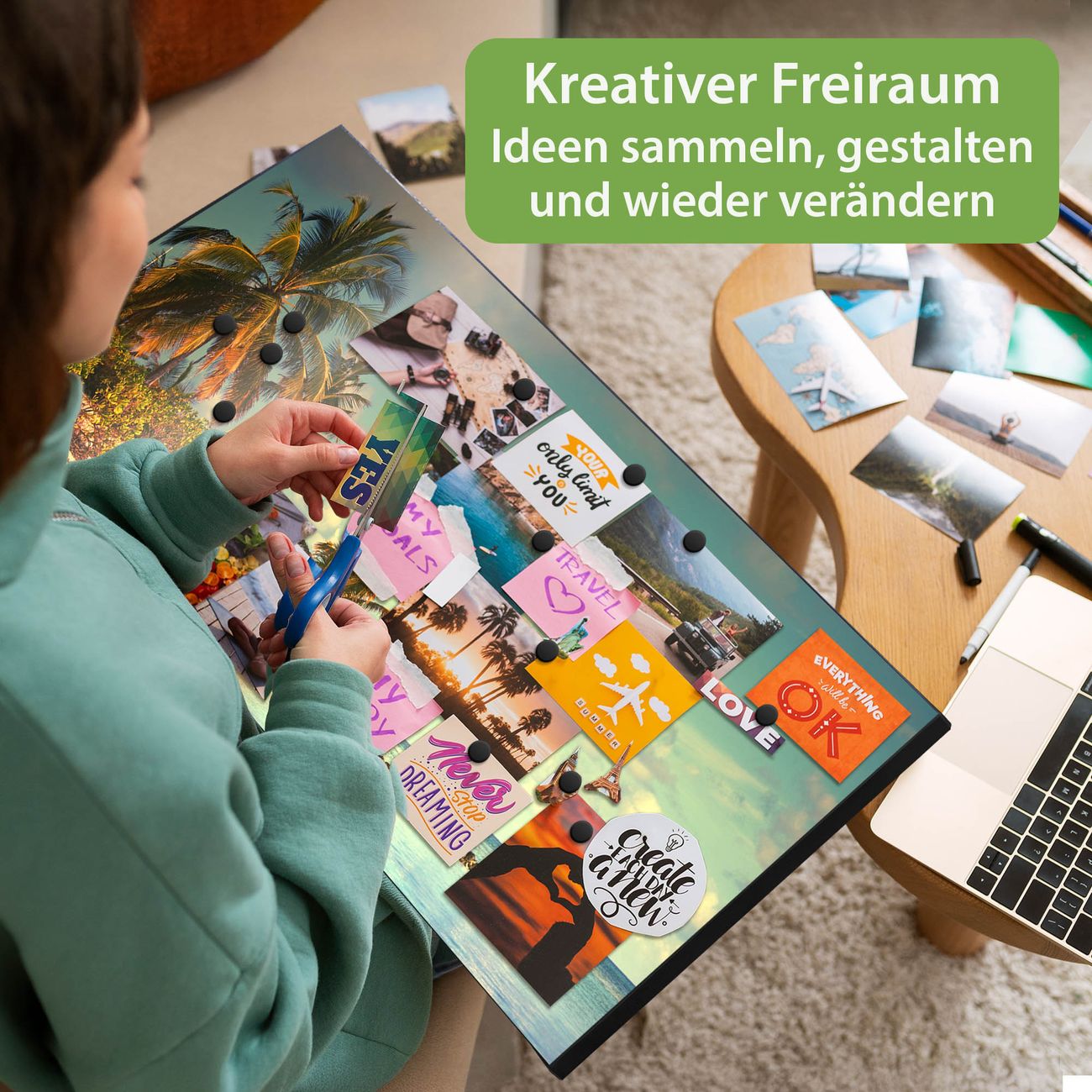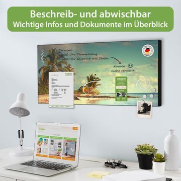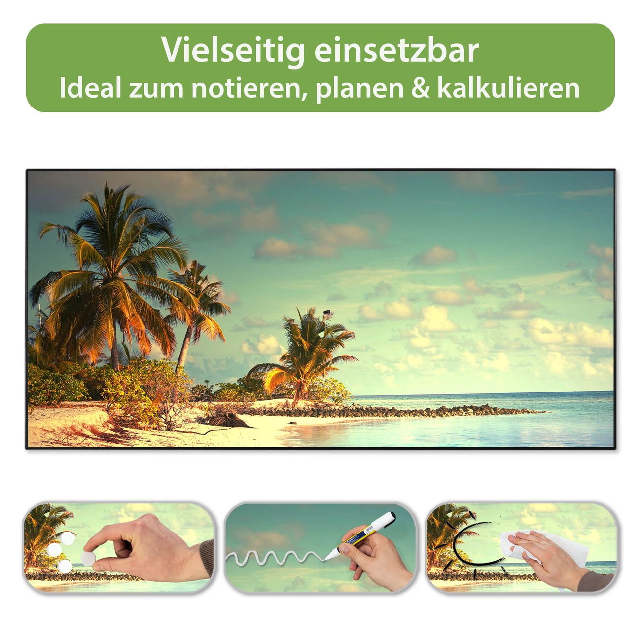 FUNKTION: Die banjado Magnettafel 78x37 cm im Design Motiv Einsame Insel vereint Funktionalität und modernes Wohndesign auf stilvolle Weise. Diese hochwertige Magnetwand aus Metall hilft Ihnen dabei, Notizen, Fotos, Termine, Einkaufslisten oder Rezepte übersichtlich zu organisieren. Als praktisches Memoboard sorgt sie für Struktur im Alltag und setzt gleichzeitig einen dekorativen Akzent an Ihrer Wand. DESIGN: Die Metalltafel besteht aus robustem, lackiertem Stahl und ist mit allen handelsüblichen Magneten nutzbar. Besonders praktisch ist die beschreibbare Oberfläche. Sie können die Magnettafel ganz einfach mit Kreidestiften beschriften und die Inhalte bei Bedarf mit einem feuchten Tuch wieder entfernen. So eignet sich das Memoboard ideal für Wochenpläne, Menüpläne, To Do Listen oder kreative Botschaften. DETAILS: Mit ihrem großzügigen Querformat von 78x37 cm bietet die Magnettafel ausreichend Platz für Ihre Organisation. Das Motiv Motiv Einsame Insel bringt eine warme, natürliche Optik in Küche, Flur, Büro oder Homeoffice und wirkt auch ohne Magnete oder Beschriftung wie ein modernes Wandbild. NUTZEN: Auf der Rückseite befinden sich vorgefertigte Löcher für eine schnelle und unkomplizierte Wandmontage. Jede banjado Magnettafel wird in Deutschland gefertigt und steht für Qualität, Langlebigkeit und liebevolle Verarbeitung. Dieses beschreibbare Memoboard ist die perfekte Kombination aus Metalltafel, Designobjekt und praktischer Magnetwand für Ihren Alltag. BANJADO: Wir sind ein kleines Team aus dem Herzen von Sachsen. Wir fertigen alle Artikel von Hand für Sie an, Sie erhalten keine preiswerte Importware. Auf Wunsch können Sie auch Ihr eigenes Foto auf die Magnettafel aufbringen, schreiben Sie uns an. Herzlichst, Ihr banjado-Team
