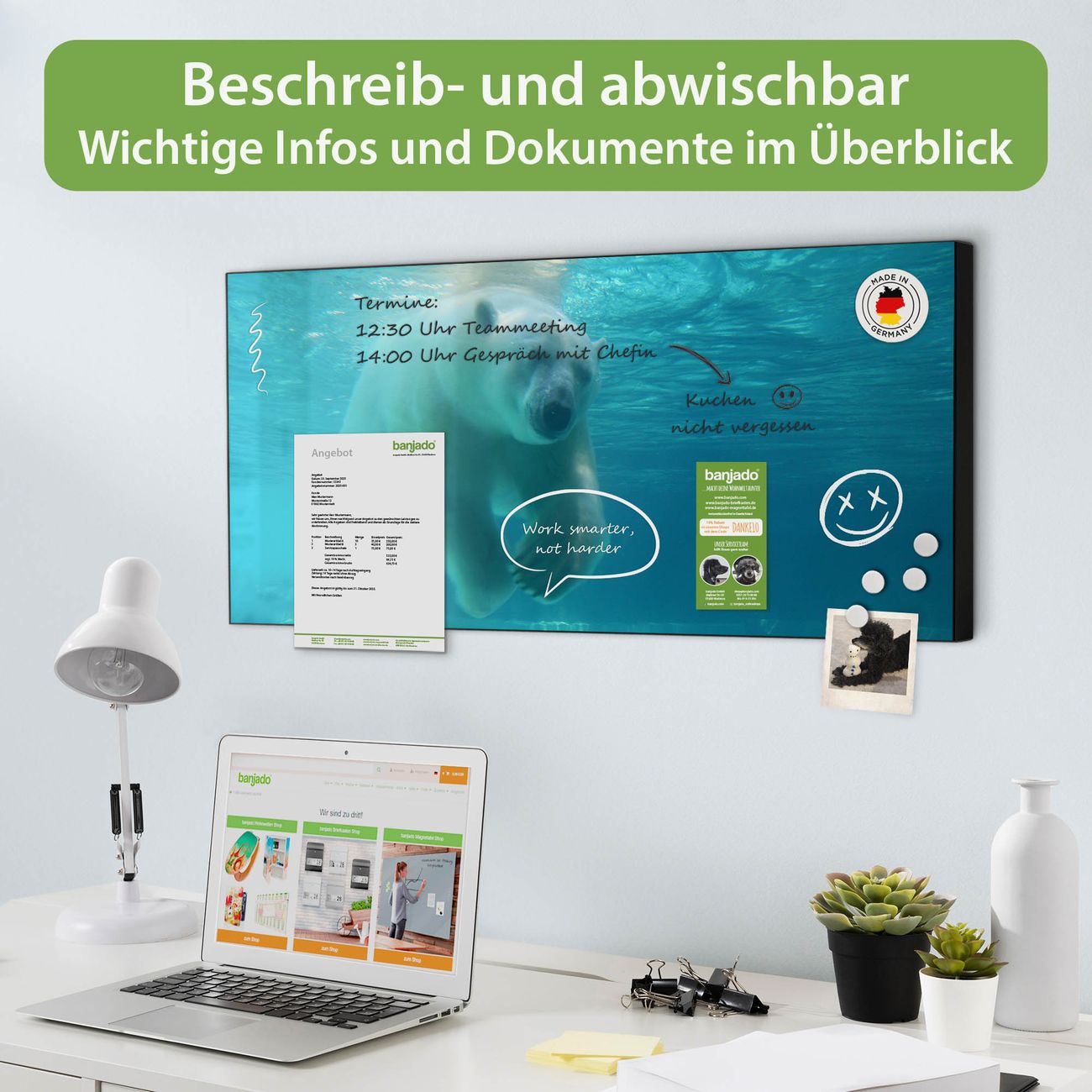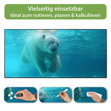 FUNKTION: Die banjado Magnettafel 78x37 cm im Design Motiv Eisbär unter Wasser vereint Funktionalität und modernes Wohndesign auf stilvolle Weise. Diese hochwertige Magnetwand aus Metall hilft Ihnen dabei, Notizen, Fotos, Termine, Einkaufslisten oder Rezepte übersichtlich zu organisieren. Als praktisches Memoboard sorgt sie für Struktur im Alltag und setzt gleichzeitig einen dekorativen Akzent an Ihrer Wand. DESIGN: Die Metalltafel besteht aus robustem, lackiertem Stahl und ist mit allen handelsüblichen Magneten nutzbar. Besonders praktisch ist die beschreibbare Oberfläche. Sie können die Magnettafel ganz einfach mit Kreidestiften beschriften und die Inhalte bei Bedarf mit einem feuchten Tuch wieder entfernen. So eignet sich das Memoboard ideal für Wochenpläne, Menüpläne, To Do Listen oder kreative Botschaften. DETAILS: Mit ihrem großzügigen Querformat von 78x37 cm bietet die Magnettafel ausreichend Platz für Ihre Organisation. Das Motiv Motiv Eisbär unter Wasser bringt eine warme, natürliche Optik in Küche, Flur, Büro oder Homeoffice und wirkt auch ohne Magnete oder Beschriftung wie ein modernes Wandbild. NUTZEN: Auf der Rückseite befinden sich vorgefertigte Löcher für eine schnelle und unkomplizierte Wandmontage. Jede banjado Magnettafel wird in Deutschland gefertigt und steht für Qualität, Langlebigkeit und liebevolle Verarbeitung. Dieses beschreibbare Memoboard ist die perfekte Kombination aus Metalltafel, Designobjekt und praktischer Magnetwand für Ihren Alltag. BANJADO: Wir sind ein kleines Team aus dem Herzen von Sachsen. Wir fertigen alle Artikel von Hand für Sie an, Sie erhalten keine preiswerte Importware. Auf Wunsch können Sie auch Ihr eigenes Foto auf die Magnettafel aufbringen, schreiben Sie uns an. Herzlichst, Ihr banjado-Team