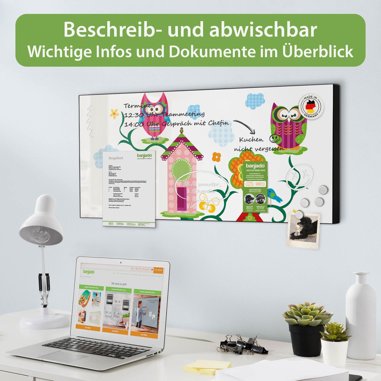 FUNKTION: Die banjado Magnettafel 78x37 cm im Design Motiv Eulenfamilie vereint Funktionalität und modernes Wohndesign auf stilvolle Weise. Diese hochwertige Magnetwand aus Metall hilft Ihnen dabei, Notizen, Fotos, Termine, Einkaufslisten oder Rezepte übersichtlich zu organisieren. Als praktisches Memoboard sorgt sie für Struktur im Alltag und setzt gleichzeitig einen dekorativen Akzent an Ihrer Wand. DESIGN: Die Metalltafel besteht aus robustem, lackiertem Stahl und ist mit allen handelsüblichen Magneten nutzbar. Besonders praktisch ist die beschreibbare Oberfläche. Sie können die Magnettafel ganz einfach mit Kreidestiften beschriften und die Inhalte bei Bedarf mit einem feuchten Tuch wieder entfernen. So eignet sich das Memoboard ideal für Wochenpläne, Menüpläne, To Do Listen oder kreative Botschaften. DETAILS: Mit ihrem großzügigen Querformat von 78x37 cm bietet die Magnettafel ausreichend Platz für Ihre Organisation. Das Motiv Motiv Eulenfamilie bringt eine warme, natürliche Optik in Küche, Flur, Büro oder Homeoffice und wirkt auch ohne Magnete oder Beschriftung wie ein modernes Wandbild. NUTZEN: Auf der Rückseite befinden sich vorgefertigte Löcher für eine schnelle und unkomplizierte Wandmontage. Jede banjado Magnettafel wird in Deutschland gefertigt und steht für Qualität, Langlebigkeit und liebevolle Verarbeitung. Dieses beschreibbare Memoboard ist die perfekte Kombination aus Metalltafel, Designobjekt und praktischer Magnetwand für Ihren Alltag. BANJADO: Wir sind ein kleines Team aus dem Herzen von Sachsen. Wir fertigen alle Artikel von Hand für Sie an, Sie erhalten keine preiswerte Importware. Auf Wunsch können Sie auch Ihr eigenes Foto auf die Magnettafel aufbringen, schreiben Sie uns an. Herzlichst, Ihr banjado-Team