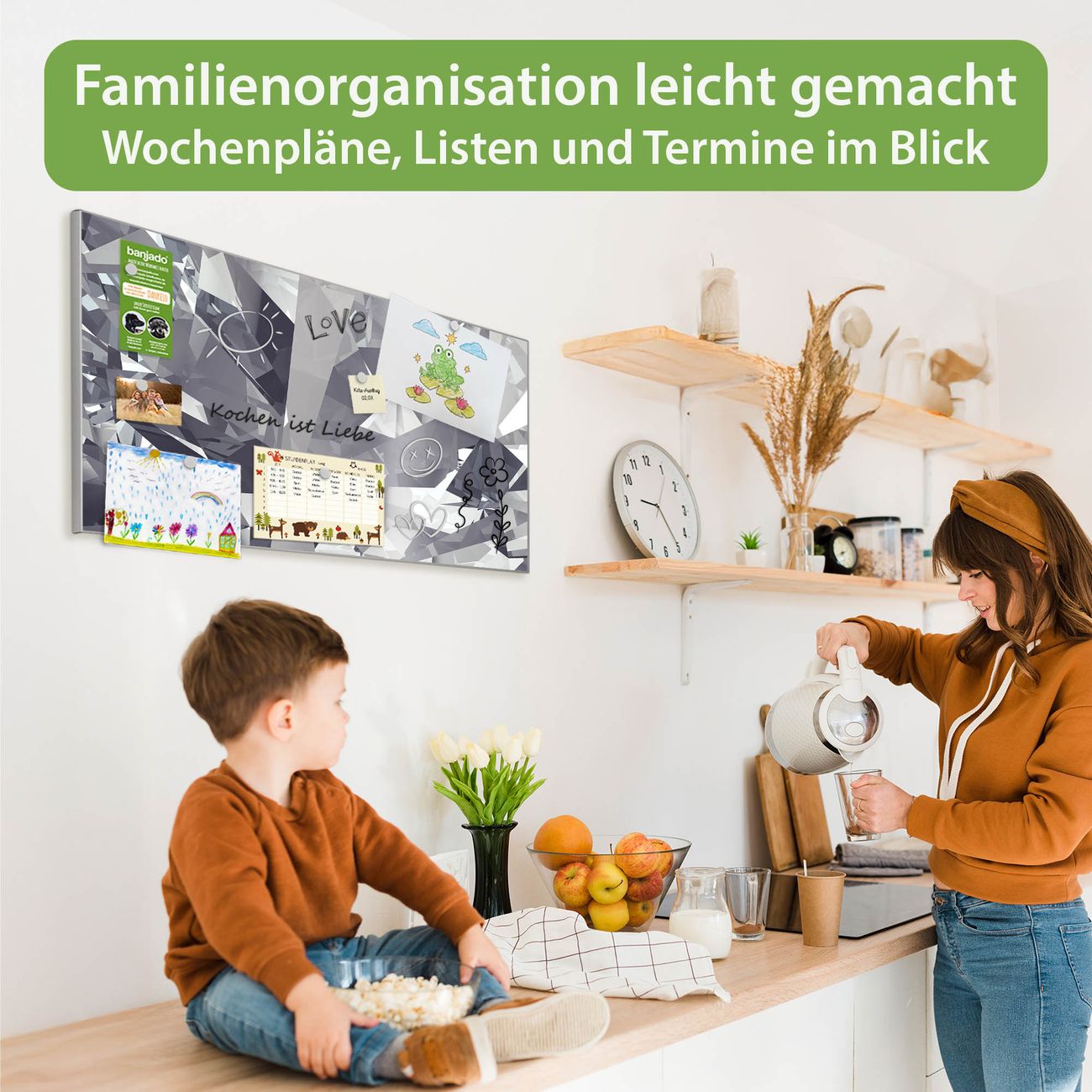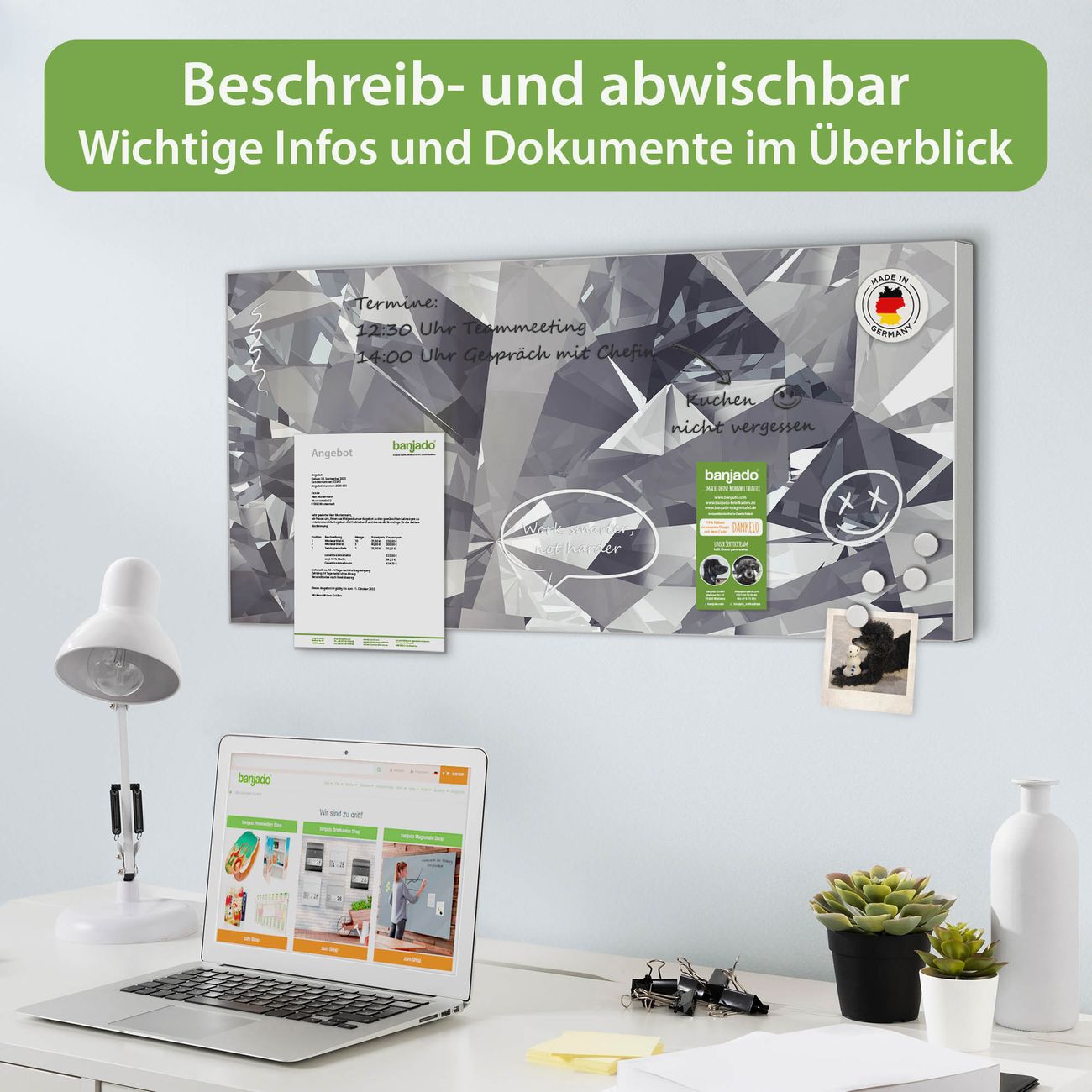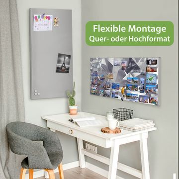 FUNKTION: Die banjado Magnettafel 78x37 cm im Design Motiv Facetten Monochrome vereint Funktionalität und modernes Wohndesign auf stilvolle Weise. Diese hochwertige Magnetwand aus Metall hilft Ihnen dabei, Notizen, Fotos, Termine, Einkaufslisten oder Rezepte übersichtlich zu organisieren. Als praktisches Memoboard sorgt sie für Struktur im Alltag und setzt gleichzeitig einen dekorativen Akzent an Ihrer Wand. DESIGN: Die Metalltafel besteht aus robustem, lackiertem Stahl und ist mit allen handelsüblichen Magneten nutzbar. Besonders praktisch ist die beschreibbare Oberfläche. Sie können die Magnettafel ganz einfach mit Kreidestiften beschriften und die Inhalte bei Bedarf mit einem feuchten Tuch wieder entfernen. So eignet sich das Memoboard ideal für Wochenpläne, Menüpläne, To Do Listen oder kreative Botschaften. DETAILS: Mit ihrem großzügigen Querformat von 78x37 cm bietet die Magnettafel ausreichend Platz für Ihre Organisation. Das Motiv Motiv Facetten Monochrome bringt eine warme, natürliche Optik in Küche, Flur, Büro oder Homeoffice und wirkt auch ohne Magnete oder Beschriftung wie ein modernes Wandbild. NUTZEN: Auf der Rückseite befinden sich vorgefertigte Löcher für eine schnelle und unkomplizierte Wandmontage. Jede banjado Magnettafel wird in Deutschland gefertigt und steht für Qualität, Langlebigkeit und liebevolle Verarbeitung. Dieses beschreibbare Memoboard ist die perfekte Kombination aus Metalltafel, Designobjekt und praktischer Magnetwand für Ihren Alltag. BANJADO: Wir sind ein kleines Team aus dem Herzen von Sachsen. Wir fertigen alle Artikel von Hand für Sie an, Sie erhalten keine preiswerte Importware. Auf Wunsch können Sie auch Ihr eigenes Foto auf die Magnettafel aufbringen, schreiben Sie uns an. Herzlichst, Ihr banjado-Team