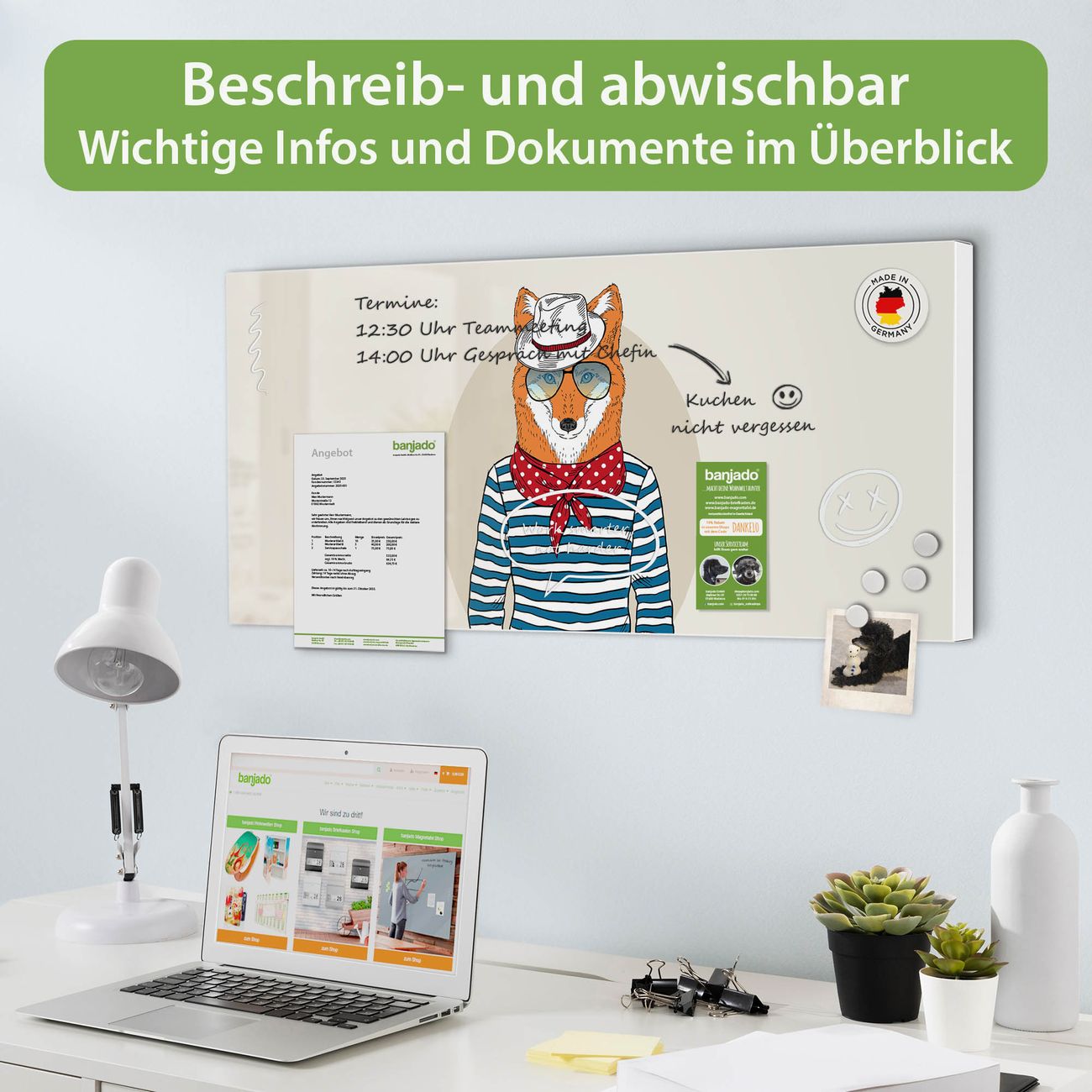 FUNKTION: Die banjado Magnettafel 78x37 cm im Design Motiv Fancy Fox vereint Funktionalität und modernes Wohndesign auf stilvolle Weise. Diese hochwertige Magnetwand aus Metall hilft Ihnen dabei, Notizen, Fotos, Termine, Einkaufslisten oder Rezepte übersichtlich zu organisieren. Als praktisches Memoboard sorgt sie für Struktur im Alltag und setzt gleichzeitig einen dekorativen Akzent an Ihrer Wand. DESIGN: Die Metalltafel besteht aus robustem, lackiertem Stahl und ist mit allen handelsüblichen Magneten nutzbar. Besonders praktisch ist die beschreibbare Oberfläche. Sie können die Magnettafel ganz einfach mit Kreidestiften beschriften und die Inhalte bei Bedarf mit einem feuchten Tuch wieder entfernen. So eignet sich das Memoboard ideal für Wochenpläne, Menüpläne, To Do Listen oder kreative Botschaften. DETAILS: Mit ihrem großzügigen Querformat von 78x37 cm bietet die Magnettafel ausreichend Platz für Ihre Organisation. Das Motiv Motiv Fancy Fox bringt eine warme, natürliche Optik in Küche, Flur, Büro oder Homeoffice und wirkt auch ohne Magnete oder Beschriftung wie ein modernes Wandbild. NUTZEN: Auf der Rückseite befinden sich vorgefertigte Löcher für eine schnelle und unkomplizierte Wandmontage. Jede banjado Magnettafel wird in Deutschland gefertigt und steht für Qualität, Langlebigkeit und liebevolle Verarbeitung. Dieses beschreibbare Memoboard ist die perfekte Kombination aus Metalltafel, Designobjekt und praktischer Magnetwand für Ihren Alltag. BANJADO: Wir sind ein kleines Team aus dem Herzen von Sachsen. Wir fertigen alle Artikel von Hand für Sie an, Sie erhalten keine preiswerte Importware. Auf Wunsch können Sie auch Ihr eigenes Foto auf die Magnettafel aufbringen, schreiben Sie uns an. Herzlichst, Ihr banjado-Team