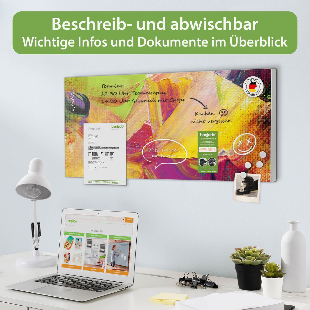FUNKTION: Die banjado Magnettafel 78x37 cm im Design Motiv Farbe auf Leinwand vereint Funktionalität und modernes Wohndesign auf stilvolle Weise. Diese hochwertige Magnetwand aus Metall hilft Ihnen dabei, Notizen, Fotos, Termine, Einkaufslisten oder Rezepte übersichtlich zu organisieren. Als praktisches Memoboard sorgt sie für Struktur im Alltag und setzt gleichzeitig einen dekorativen Akzent an Ihrer Wand. DESIGN: Die Metalltafel besteht aus robustem, lackiertem Stahl und ist mit allen handelsüblichen Magneten nutzbar. Besonders praktisch ist die beschreibbare Oberfläche. Sie können die Magnettafel ganz einfach mit Kreidestiften beschriften und die Inhalte bei Bedarf mit einem feuchten Tuch wieder entfernen. So eignet sich das Memoboard ideal für Wochenpläne, Menüpläne, To Do Listen oder kreative Botschaften. DETAILS: Mit ihrem großzügigen Querformat von 78x37 cm bietet die Magnettafel ausreichend Platz für Ihre Organisation. Das Motiv Motiv Farbe auf Leinwand bringt eine warme, natürliche Optik in Küche, Flur, Büro oder Homeoffice und wirkt auch ohne Magnete oder Beschriftung wie ein modernes Wandbild. NUTZEN: Auf der Rückseite befinden sich vorgefertigte Löcher für eine schnelle und unkomplizierte Wandmontage. Jede banjado Magnettafel wird in Deutschland gefertigt und steht für Qualität, Langlebigkeit und liebevolle Verarbeitung. Dieses beschreibbare Memoboard ist die perfekte Kombination aus Metalltafel, Designobjekt und praktischer Magnetwand für Ihren Alltag. BANJADO: Wir sind ein kleines Team aus dem Herzen von Sachsen. Wir fertigen alle Artikel von Hand für Sie an, Sie erhalten keine preiswerte Importware. Auf Wunsch können Sie auch Ihr eigenes Foto auf die Magnettafel aufbringen, schreiben Sie uns an. Herzlichst, Ihr banjado-Team