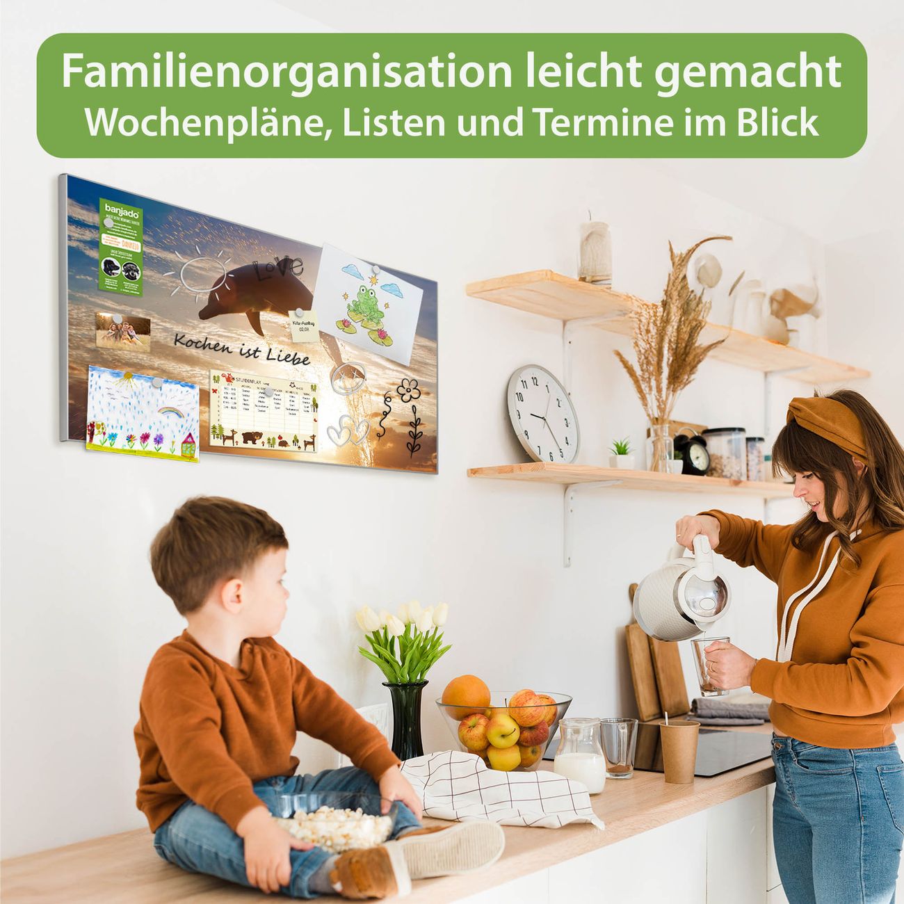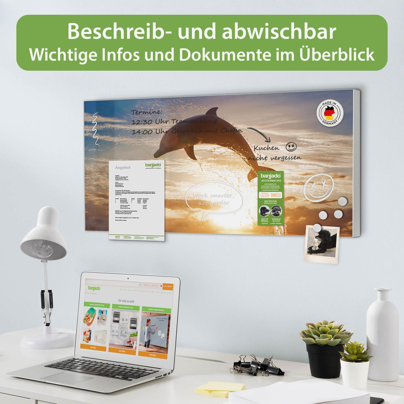 FUNKTION: Die banjado Magnettafel 78x37 cm im Design Motiv Filippo vereint Funktionalität und modernes Wohndesign auf stilvolle Weise. Diese hochwertige Magnetwand aus Metall hilft Ihnen dabei, Notizen, Fotos, Termine, Einkaufslisten oder Rezepte übersichtlich zu organisieren. Als praktisches Memoboard sorgt sie für Struktur im Alltag und setzt gleichzeitig einen dekorativen Akzent an Ihrer Wand. DESIGN: Die Metalltafel besteht aus robustem, lackiertem Stahl und ist mit allen handelsüblichen Magneten nutzbar. Besonders praktisch ist die beschreibbare Oberfläche. Sie können die Magnettafel ganz einfach mit Kreidestiften beschriften und die Inhalte bei Bedarf mit einem feuchten Tuch wieder entfernen. So eignet sich das Memoboard ideal für Wochenpläne, Menüpläne, To Do Listen oder kreative Botschaften. DETAILS: Mit ihrem großzügigen Querformat von 78x37 cm bietet die Magnettafel ausreichend Platz für Ihre Organisation. Das Motiv Motiv Filippo bringt eine warme, natürliche Optik in Küche, Flur, Büro oder Homeoffice und wirkt auch ohne Magnete oder Beschriftung wie ein modernes Wandbild. NUTZEN: Auf der Rückseite befinden sich vorgefertigte Löcher für eine schnelle und unkomplizierte Wandmontage. Jede banjado Magnettafel wird in Deutschland gefertigt und steht für Qualität, Langlebigkeit und liebevolle Verarbeitung. Dieses beschreibbare Memoboard ist die perfekte Kombination aus Metalltafel, Designobjekt und praktischer Magnetwand für Ihren Alltag. BANJADO: Wir sind ein kleines Team aus dem Herzen von Sachsen. Wir fertigen alle Artikel von Hand für Sie an, Sie erhalten keine preiswerte Importware. Auf Wunsch können Sie auch Ihr eigenes Foto auf die Magnettafel aufbringen, schreiben Sie uns an. Herzlichst, Ihr banjado-Team