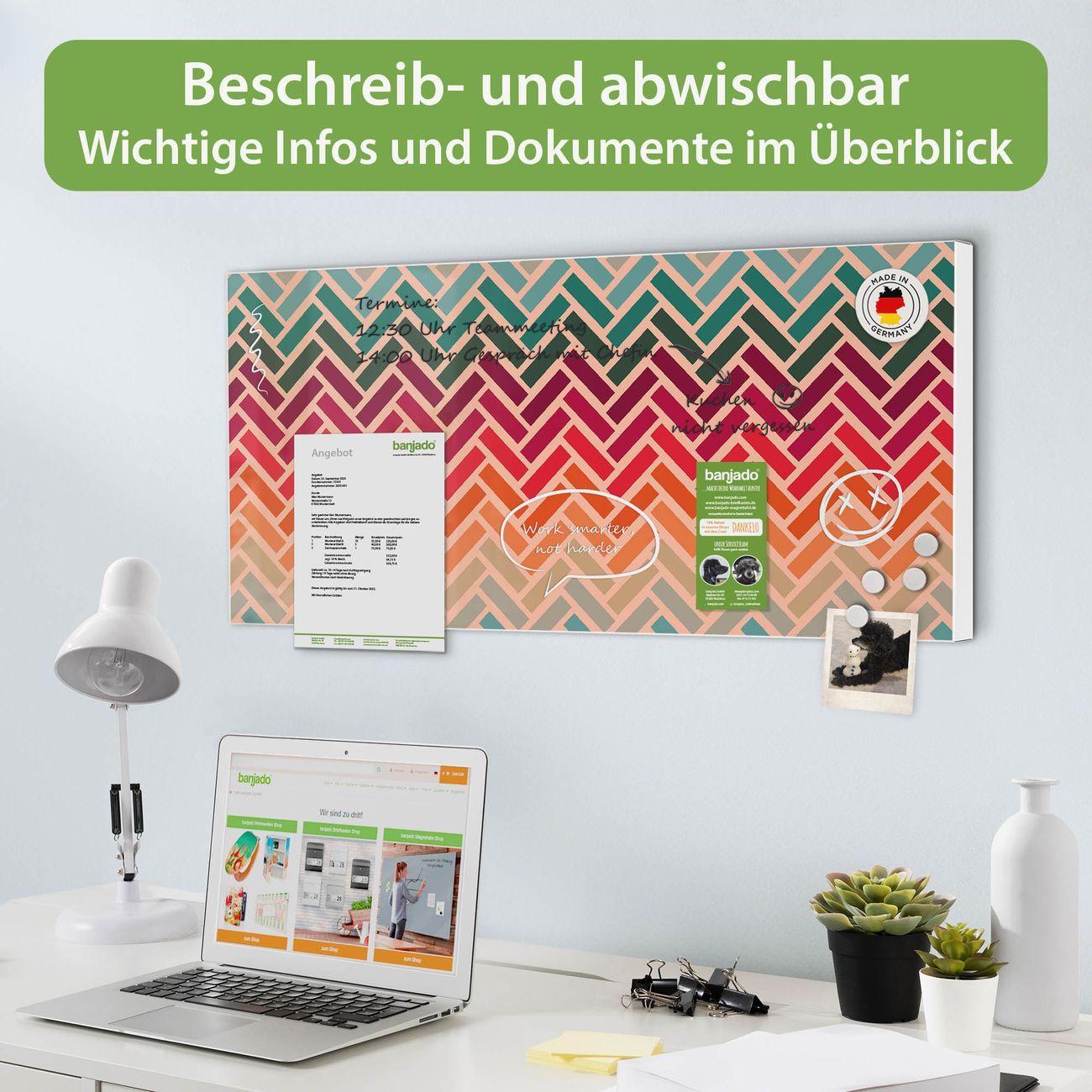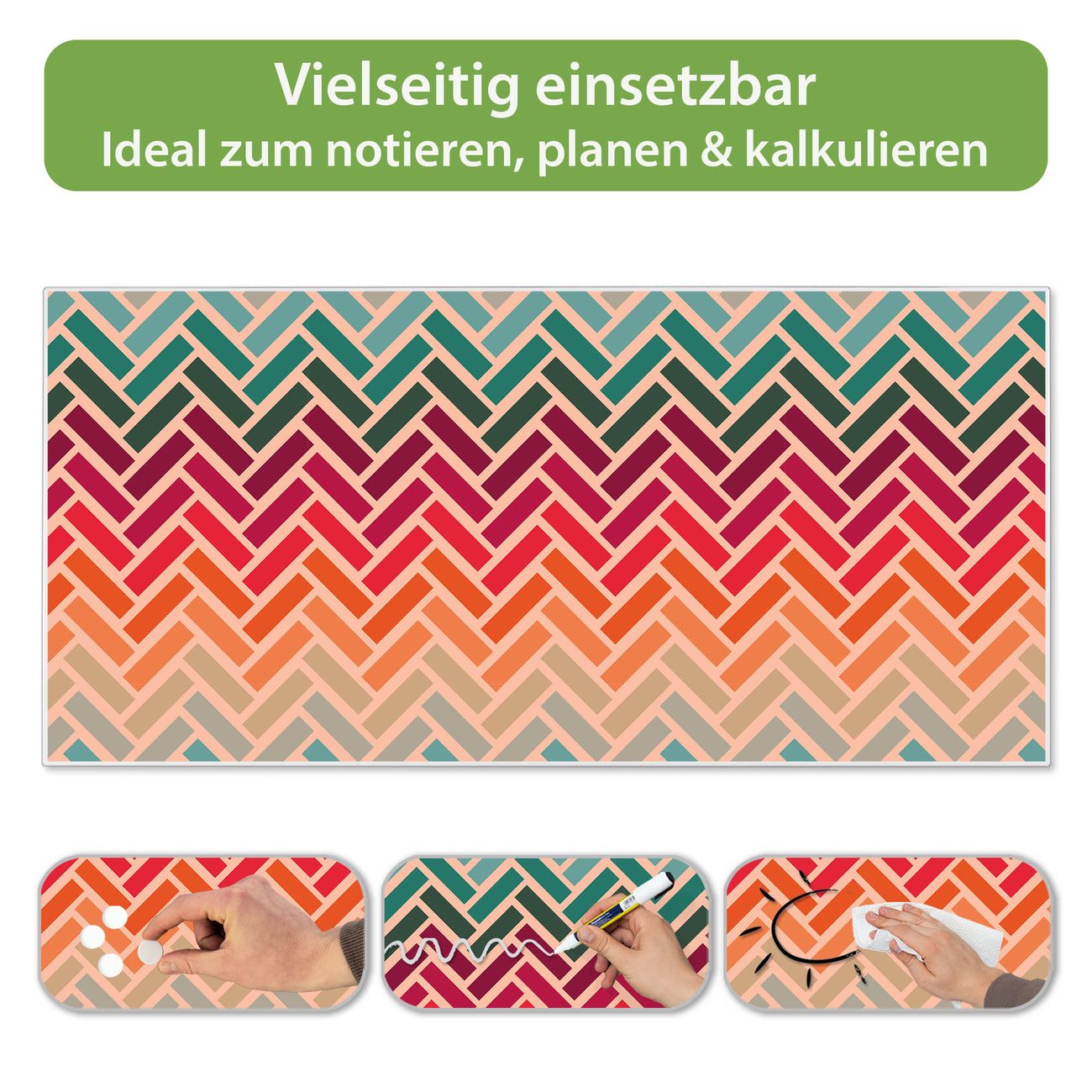 FUNKTION: Die banjado Magnettafel 78x37 cm im Design Motiv Fischgräten vereint Funktionalität und modernes Wohndesign auf stilvolle Weise. Diese hochwertige Magnetwand aus Metall hilft Ihnen dabei, Notizen, Fotos, Termine, Einkaufslisten oder Rezepte übersichtlich zu organisieren. Als praktisches Memoboard sorgt sie für Struktur im Alltag und setzt gleichzeitig einen dekorativen Akzent an Ihrer Wand. DESIGN: Die Metalltafel besteht aus robustem, lackiertem Stahl und ist mit allen handelsüblichen Magneten nutzbar. Besonders praktisch ist die beschreibbare Oberfläche. Sie können die Magnettafel ganz einfach mit Kreidestiften beschriften und die Inhalte bei Bedarf mit einem feuchten Tuch wieder entfernen. So eignet sich das Memoboard ideal für Wochenpläne, Menüpläne, To Do Listen oder kreative Botschaften. DETAILS: Mit ihrem großzügigen Querformat von 78x37 cm bietet die Magnettafel ausreichend Platz für Ihre Organisation. Das Motiv Motiv Fischgräten bringt eine warme, natürliche Optik in Küche, Flur, Büro oder Homeoffice und wirkt auch ohne Magnete oder Beschriftung wie ein modernes Wandbild. NUTZEN: Auf der Rückseite befinden sich vorgefertigte Löcher für eine schnelle und unkomplizierte Wandmontage. Jede banjado Magnettafel wird in Deutschland gefertigt und steht für Qualität, Langlebigkeit und liebevolle Verarbeitung. Dieses beschreibbare Memoboard ist die perfekte Kombination aus Metalltafel, Designobjekt und praktischer Magnetwand für Ihren Alltag. BANJADO: Wir sind ein kleines Team aus dem Herzen von Sachsen. Wir fertigen alle Artikel von Hand für Sie an, Sie erhalten keine preiswerte Importware. Auf Wunsch können Sie auch Ihr eigenes Foto auf die Magnettafel aufbringen, schreiben Sie uns an. Herzlichst, Ihr banjado-Team