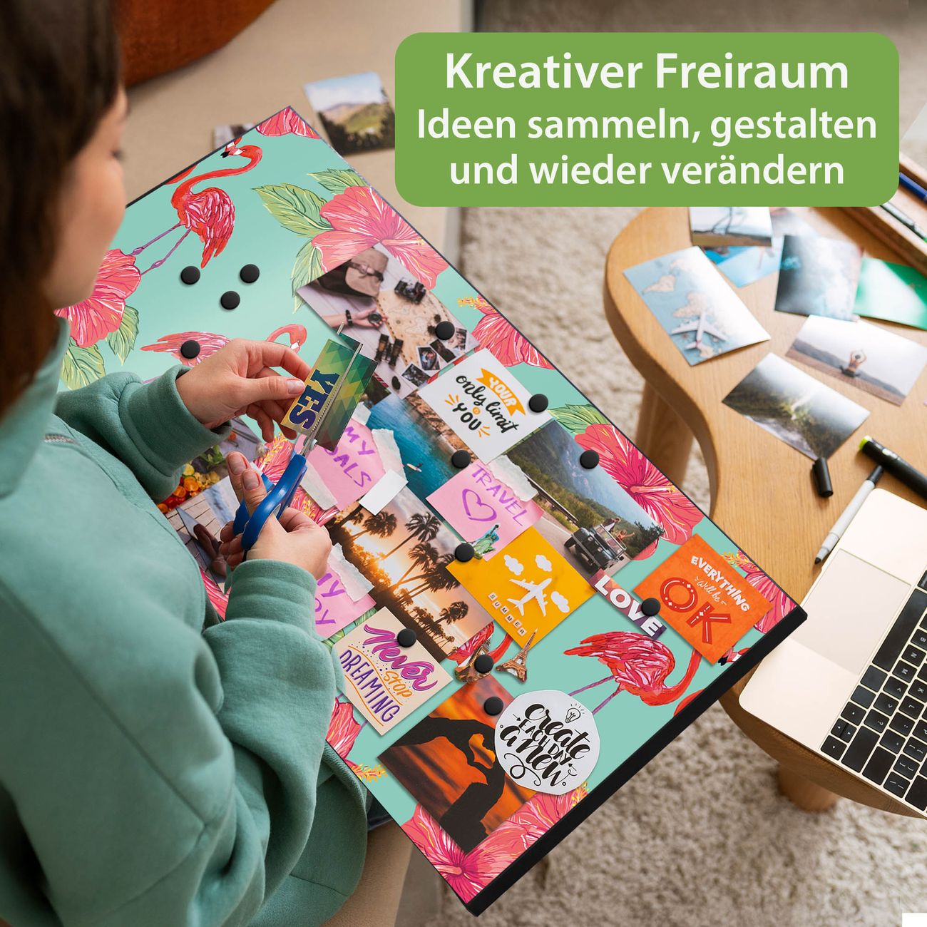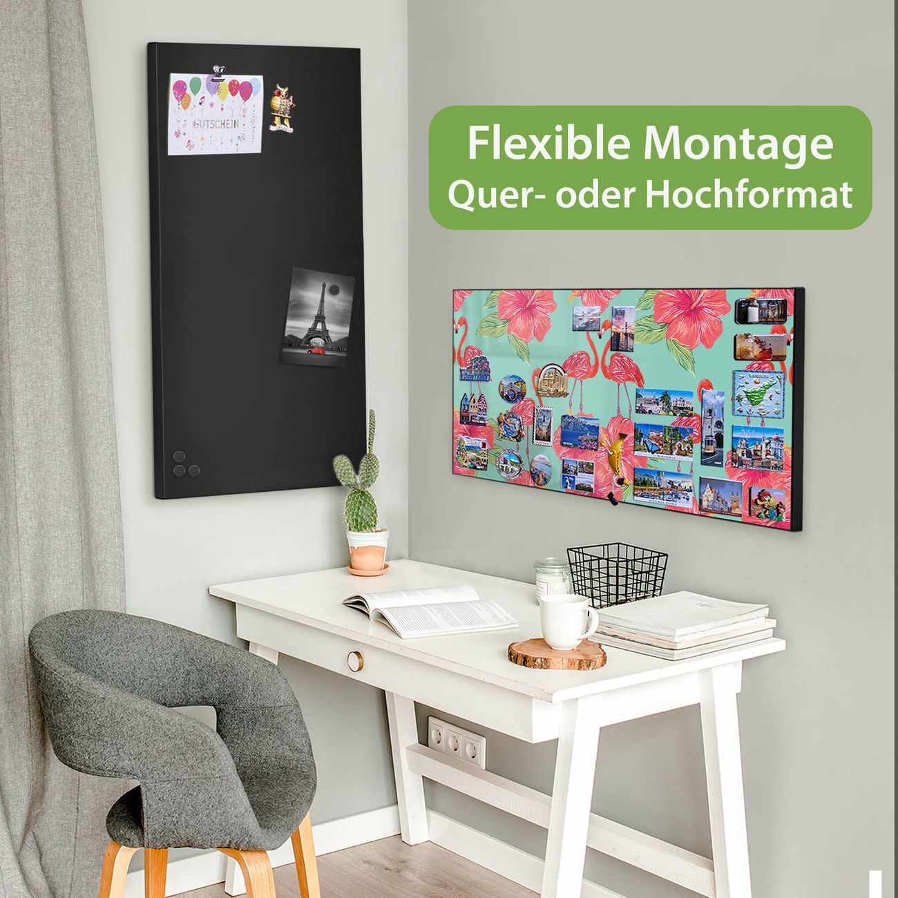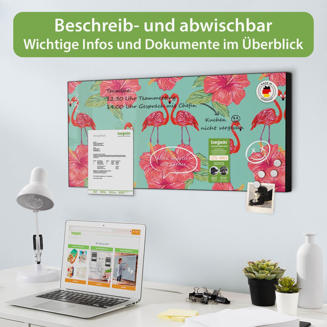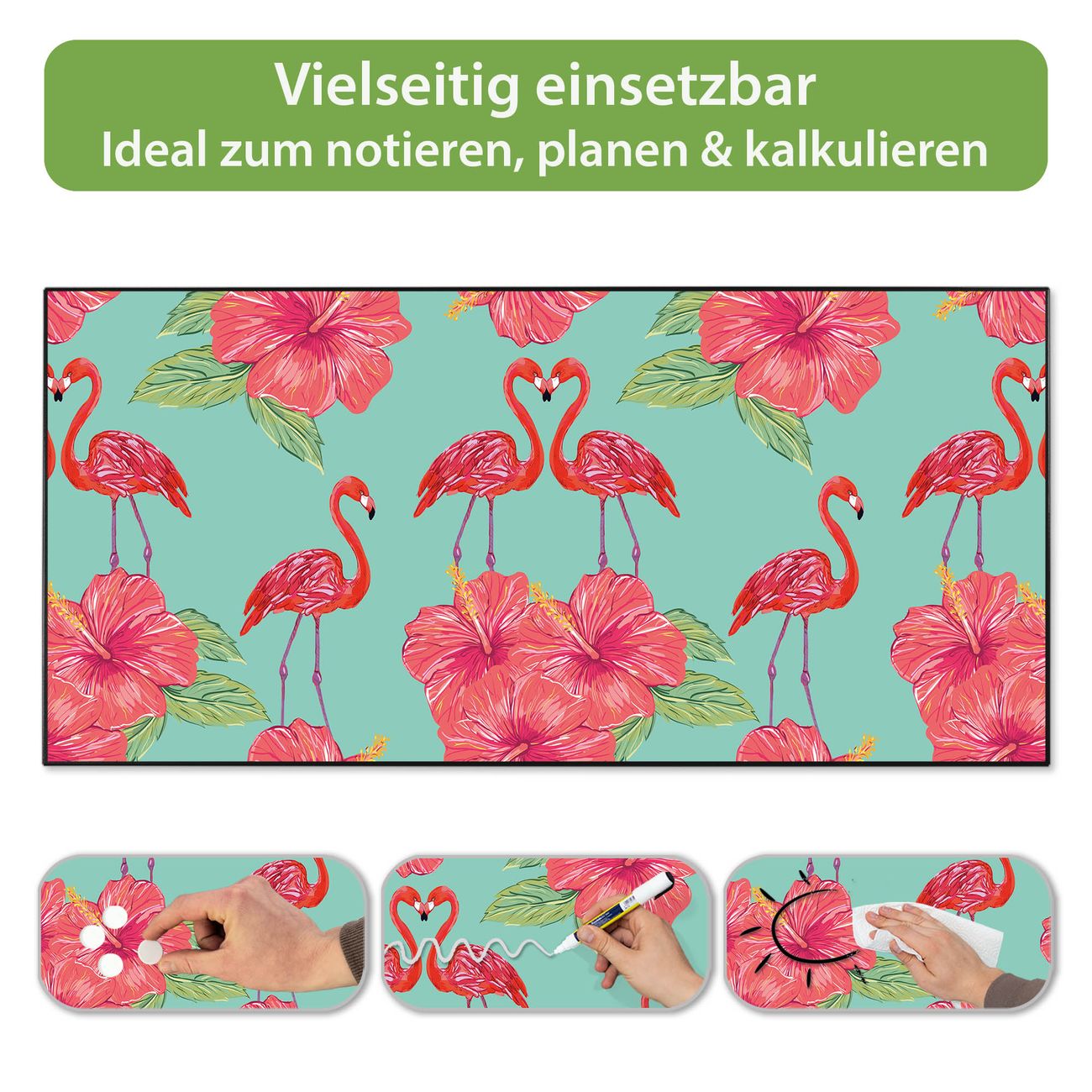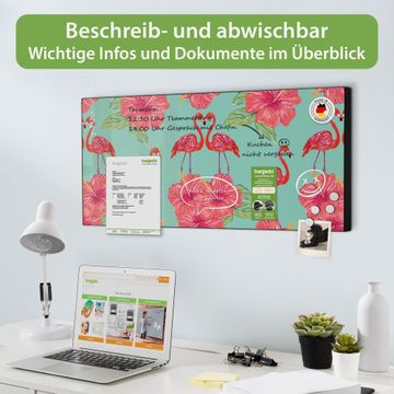 FUNKTION: Die banjado Magnettafel 78x37 cm im Design Motiv Flamingo Liebe vereint Funktionalität und modernes Wohndesign auf stilvolle Weise. Diese hochwertige Magnetwand aus Metall hilft Ihnen dabei, Notizen, Fotos, Termine, Einkaufslisten oder Rezepte übersichtlich zu organisieren. Als praktisches Memoboard sorgt sie für Struktur im Alltag und setzt gleichzeitig einen dekorativen Akzent an Ihrer Wand. DESIGN: Die Metalltafel besteht aus robustem, lackiertem Stahl und ist mit allen handelsüblichen Magneten nutzbar. Besonders praktisch ist die beschreibbare Oberfläche. Sie können die Magnettafel ganz einfach mit Kreidestiften beschriften und die Inhalte bei Bedarf mit einem feuchten Tuch wieder entfernen. So eignet sich das Memoboard ideal für Wochenpläne, Menüpläne, To Do Listen oder kreative Botschaften. DETAILS: Mit ihrem großzügigen Querformat von 78x37 cm bietet die Magnettafel ausreichend Platz für Ihre Organisation. Das Motiv Motiv Flamingo Liebe bringt eine warme, natürliche Optik in Küche, Flur, Büro oder Homeoffice und wirkt auch ohne Magnete oder Beschriftung wie ein modernes Wandbild. NUTZEN: Auf der Rückseite befinden sich vorgefertigte Löcher für eine schnelle und unkomplizierte Wandmontage. Jede banjado Magnettafel wird in Deutschland gefertigt und steht für Qualität, Langlebigkeit und liebevolle Verarbeitung. Dieses beschreibbare Memoboard ist die perfekte Kombination aus Metalltafel, Designobjekt und praktischer Magnetwand für Ihren Alltag. BANJADO: Wir sind ein kleines Team aus dem Herzen von Sachsen. Wir fertigen alle Artikel von Hand für Sie an, Sie erhalten keine preiswerte Importware. Auf Wunsch können Sie auch Ihr eigenes Foto auf die Magnettafel aufbringen, schreiben Sie uns an. Herzlichst, Ihr banjado-Team