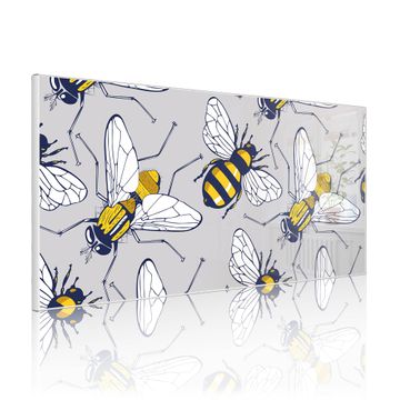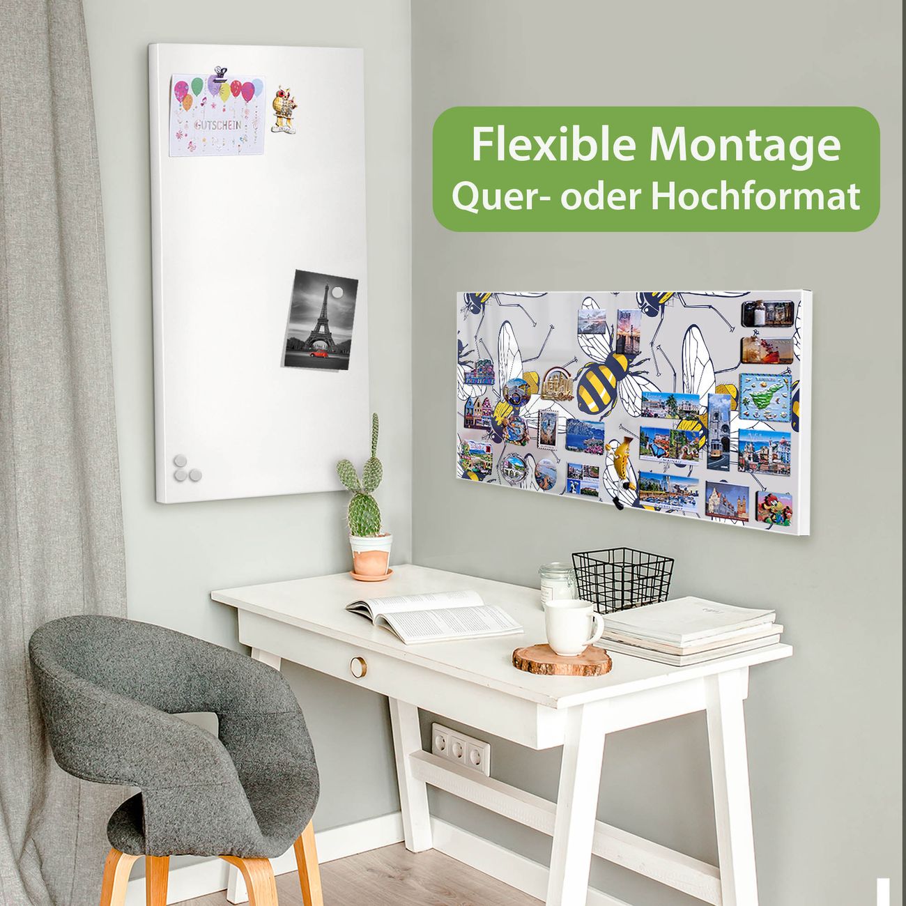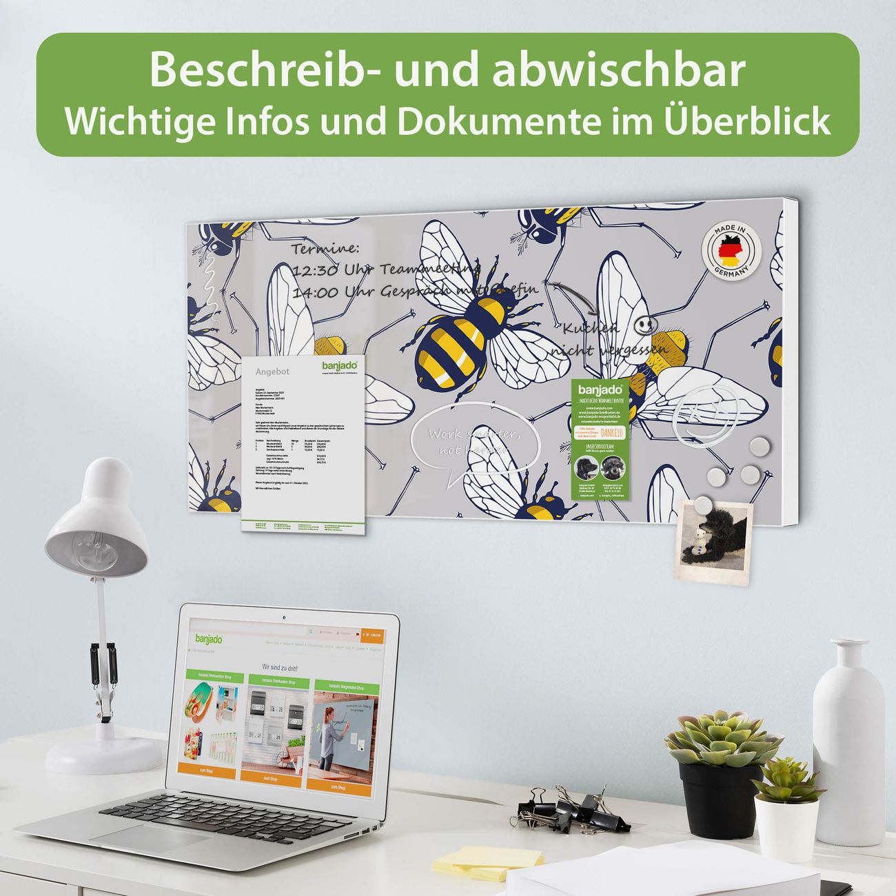 FUNKTION: Die banjado Magnettafel 78x37 cm im Design Motiv Fliegen und Bienen vereint Funktionalität und modernes Wohndesign auf stilvolle Weise. Diese hochwertige Magnetwand aus Metall hilft Ihnen dabei, Notizen, Fotos, Termine, Einkaufslisten oder Rezepte übersichtlich zu organisieren. Als praktisches Memoboard sorgt sie für Struktur im Alltag und setzt gleichzeitig einen dekorativen Akzent an Ihrer Wand. DESIGN: Die Metalltafel besteht aus robustem, lackiertem Stahl und ist mit allen handelsüblichen Magneten nutzbar. Besonders praktisch ist die beschreibbare Oberfläche. Sie können die Magnettafel ganz einfach mit Kreidestiften beschriften und die Inhalte bei Bedarf mit einem feuchten Tuch wieder entfernen. So eignet sich das Memoboard ideal für Wochenpläne, Menüpläne, To Do Listen oder kreative Botschaften. DETAILS: Mit ihrem großzügigen Querformat von 78x37 cm bietet die Magnettafel ausreichend Platz für Ihre Organisation. Das Motiv Motiv Fliegen und Bienen bringt eine warme, natürliche Optik in Küche, Flur, Büro oder Homeoffice und wirkt auch ohne Magnete oder Beschriftung wie ein modernes Wandbild. NUTZEN: Auf der Rückseite befinden sich vorgefertigte Löcher für eine schnelle und unkomplizierte Wandmontage. Jede banjado Magnettafel wird in Deutschland gefertigt und steht für Qualität, Langlebigkeit und liebevolle Verarbeitung. Dieses beschreibbare Memoboard ist die perfekte Kombination aus Metalltafel, Designobjekt und praktischer Magnetwand für Ihren Alltag. BANJADO: Wir sind ein kleines Team aus dem Herzen von Sachsen. Wir fertigen alle Artikel von Hand für Sie an, Sie erhalten keine preiswerte Importware. Auf Wunsch können Sie auch Ihr eigenes Foto auf die Magnettafel aufbringen, schreiben Sie uns an. Herzlichst, Ihr banjado-Team
