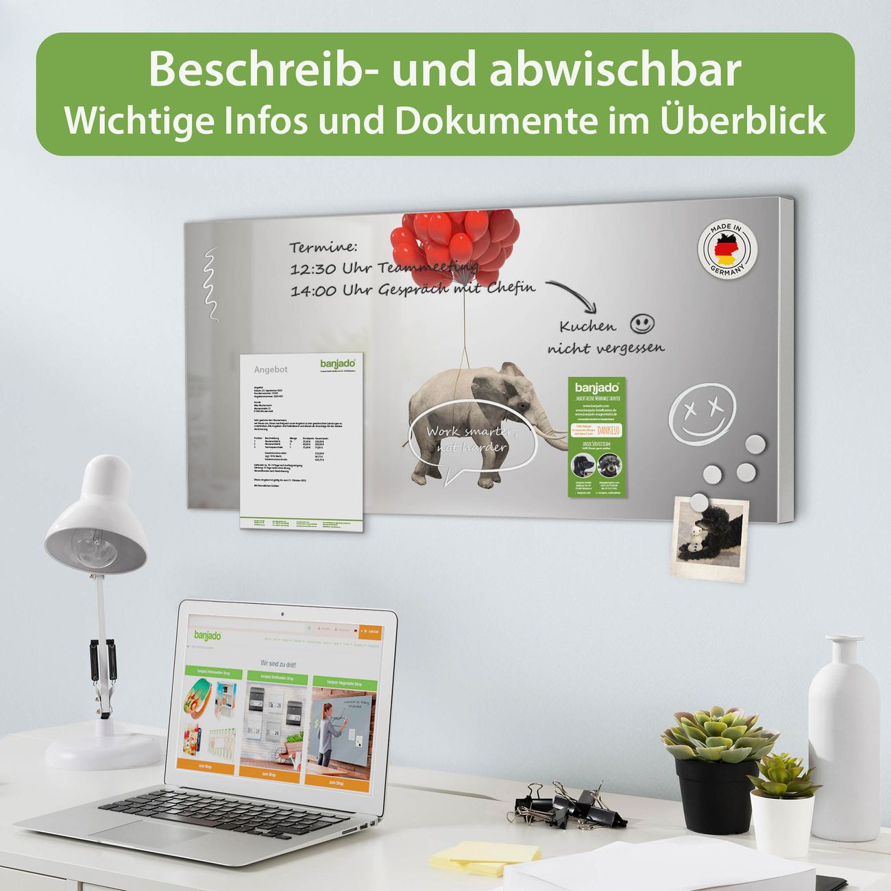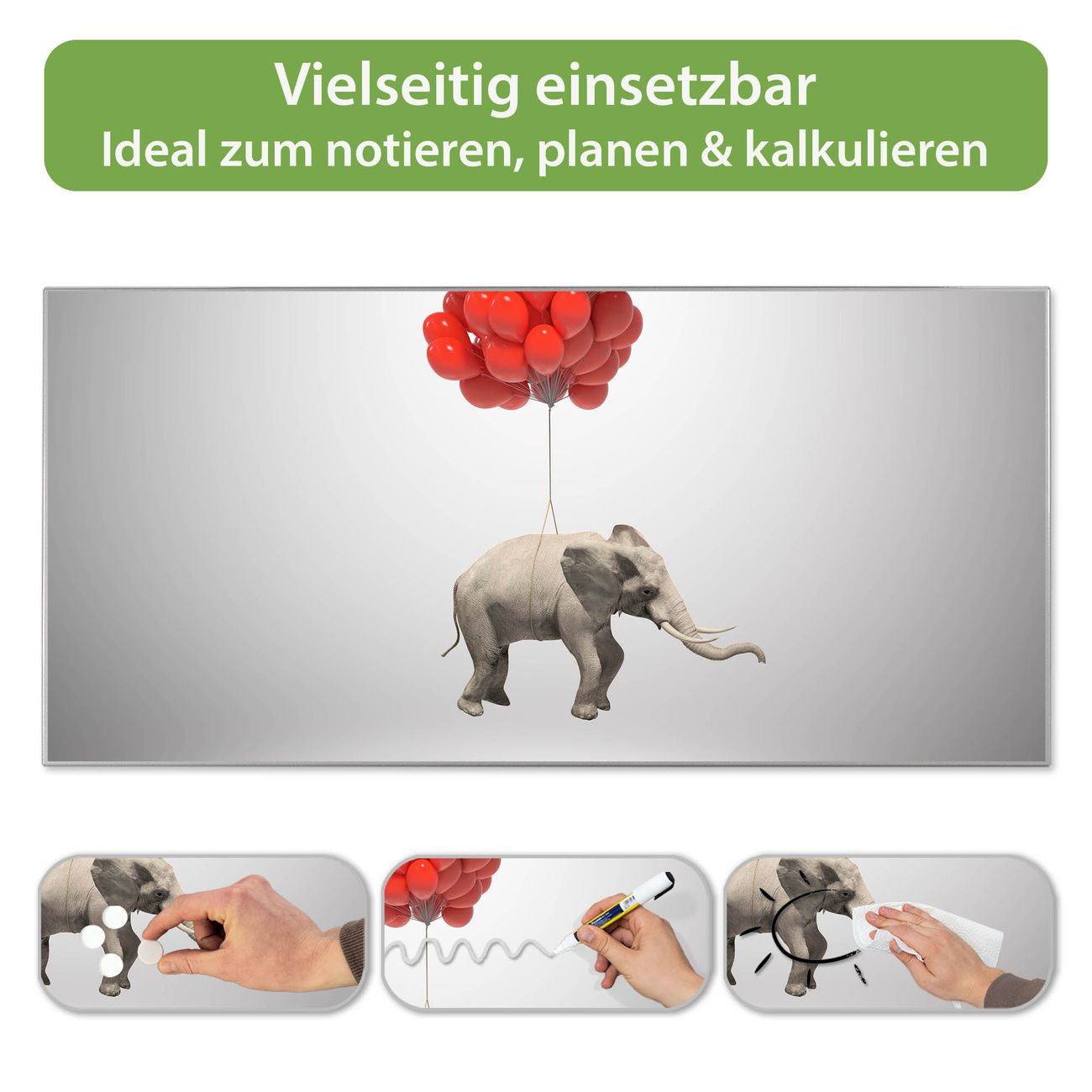 FUNKTION: Die banjado Magnettafel 78x37 cm im Design Motiv Fliegender Elefant vereint Funktionalität und modernes Wohndesign auf stilvolle Weise. Diese hochwertige Magnetwand aus Metall hilft Ihnen dabei, Notizen, Fotos, Termine, Einkaufslisten oder Rezepte übersichtlich zu organisieren. Als praktisches Memoboard sorgt sie für Struktur im Alltag und setzt gleichzeitig einen dekorativen Akzent an Ihrer Wand. DESIGN: Die Metalltafel besteht aus robustem, lackiertem Stahl und ist mit allen handelsüblichen Magneten nutzbar. Besonders praktisch ist die beschreibbare Oberfläche. Sie können die Magnettafel ganz einfach mit Kreidestiften beschriften und die Inhalte bei Bedarf mit einem feuchten Tuch wieder entfernen. So eignet sich das Memoboard ideal für Wochenpläne, Menüpläne, To Do Listen oder kreative Botschaften. DETAILS: Mit ihrem großzügigen Querformat von 78x37 cm bietet die Magnettafel ausreichend Platz für Ihre Organisation. Das Motiv Motiv Fliegender Elefant bringt eine warme, natürliche Optik in Küche, Flur, Büro oder Homeoffice und wirkt auch ohne Magnete oder Beschriftung wie ein modernes Wandbild. NUTZEN: Auf der Rückseite befinden sich vorgefertigte Löcher für eine schnelle und unkomplizierte Wandmontage. Jede banjado Magnettafel wird in Deutschland gefertigt und steht für Qualität, Langlebigkeit und liebevolle Verarbeitung. Dieses beschreibbare Memoboard ist die perfekte Kombination aus Metalltafel, Designobjekt und praktischer Magnetwand für Ihren Alltag. BANJADO: Wir sind ein kleines Team aus dem Herzen von Sachsen. Wir fertigen alle Artikel von Hand für Sie an, Sie erhalten keine preiswerte Importware. Auf Wunsch können Sie auch Ihr eigenes Foto auf die Magnettafel aufbringen, schreiben Sie uns an. Herzlichst, Ihr banjado-Team