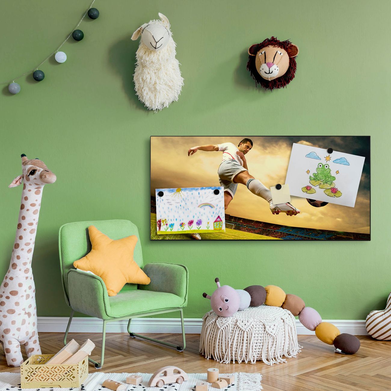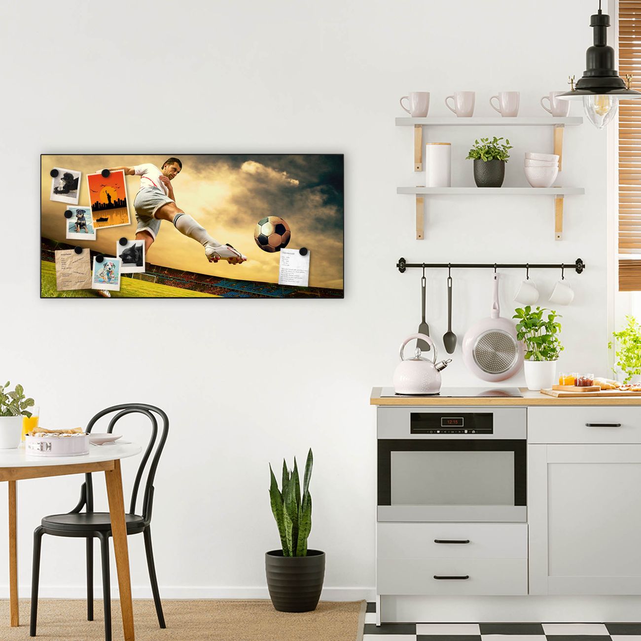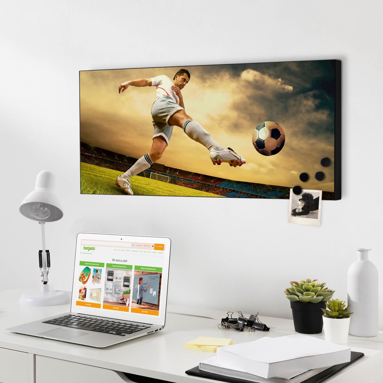 FUNKTION:  Die banjado Magnettafel mit Motiv Football Motiv bringt Ordnung in Ihr Zettelchaos. Fotos, Termine, Notizen oder Rezepte lassen Sich hier stilvoll mit Magneten ordnen, Sie behalten alles im Blick. An der Design Magnetwand halten alle handesüblichen Magnete. DESIGN:  Die Metall Pinnwand mit dem Motiv Motiv Football ist ein eleganter Begleiter im Alltag. Mit dieser Magnettafel haben Sie auch ohne Notizen und Magnete ein schönes Dekoelement. Das Format bietet Ihnen ausreichend Platz um alle wichtigen Informationen im Blick zu behalten. DETAILS: Die magnetische Pinnwand besteht aus silber-grau, weiß oder schwarz lackiertem Stahl. Sie hat eine Größe von 78cm x 37cm. Es befinden sich auf der Rückseite vorgefertigte Löcher die eine schnelle und unkomplizierte Anbringung ermöglichen. Das Motiv ist mit einem seidenmatten Laminat versehen und schützt so zusätzlich vor Kratzern. NUTZEN:  Sie können diese Magnettafel wunderbar als Wandbild nutzen, es halten alle handelsüblichen Magneten daran. Das Memoboard ist mit einem feuchten Lappen oder Schwamm abwischbar. Sie finden bei uns eine große Auswahl an passenden Magneten. BANJADO:  Wir sind ein kleines Team aus dem Herzen von Sachsen. Wir fertigen alle Artikel von Hand für Sie an, Sie erhalten keine preiswerte Importware. Auf Wunsch können Sie auch Ihr eigenes Foto auf die Magnettafel aufbringen, schreiben Sie uns an. Herzlichst, Ihr banjado-Team