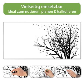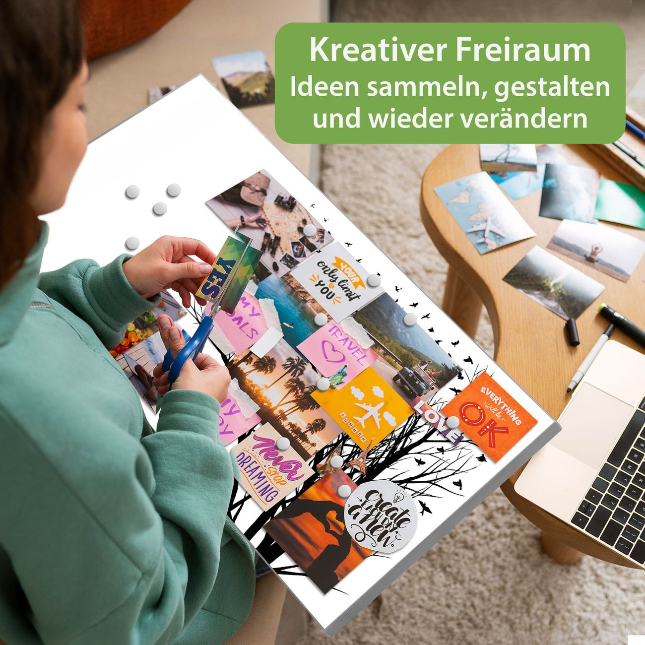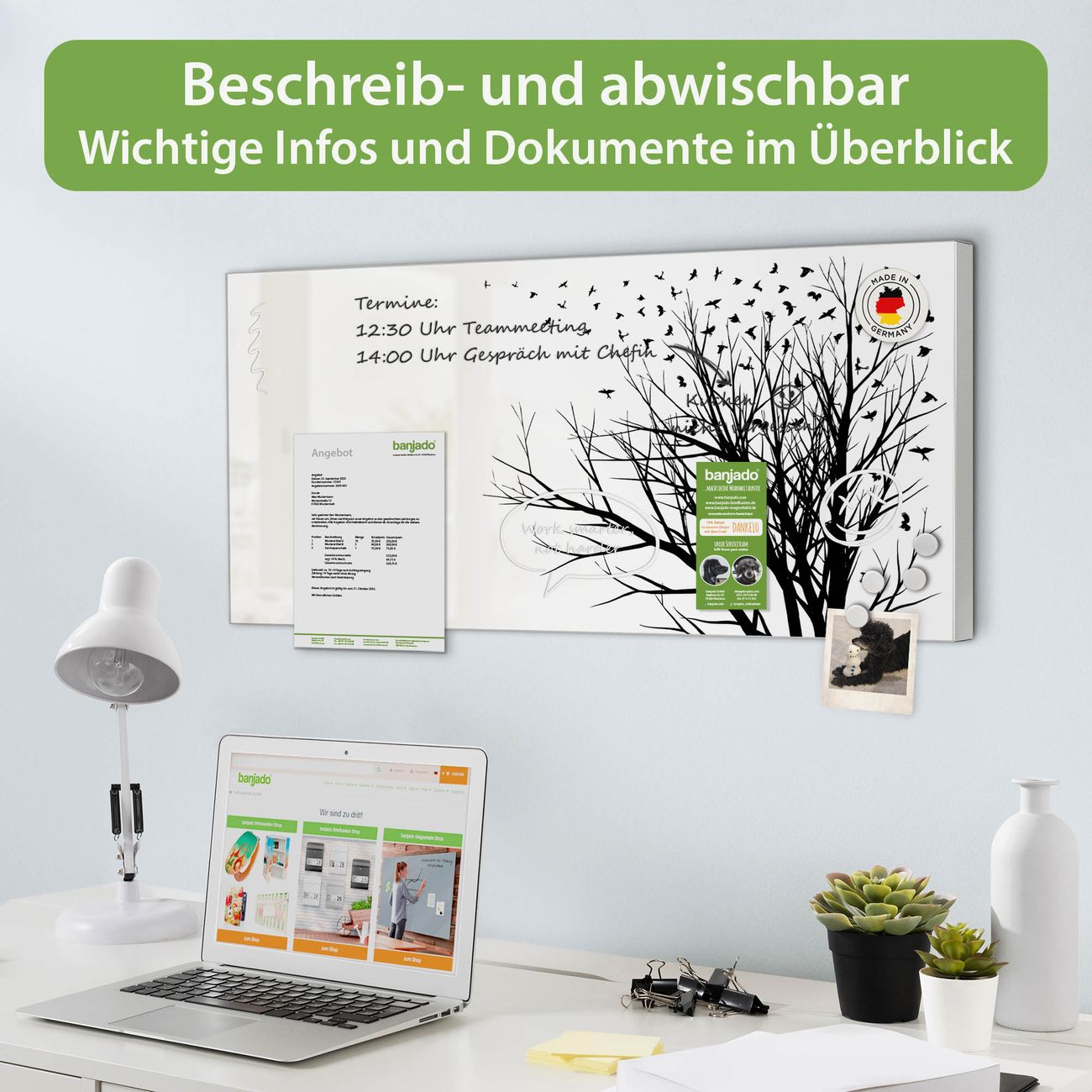 FUNKTION: Die banjado Magnettafel 78x37 cm im Design Motiv Fortfliegen vereint Funktionalität und modernes Wohndesign auf stilvolle Weise. Diese hochwertige Magnetwand aus Metall hilft Ihnen dabei, Notizen, Fotos, Termine, Einkaufslisten oder Rezepte übersichtlich zu organisieren. Als praktisches Memoboard sorgt sie für Struktur im Alltag und setzt gleichzeitig einen dekorativen Akzent an Ihrer Wand. DESIGN: Die Metalltafel besteht aus robustem, lackiertem Stahl und ist mit allen handelsüblichen Magneten nutzbar. Besonders praktisch ist die beschreibbare Oberfläche. Sie können die Magnettafel ganz einfach mit Kreidestiften beschriften und die Inhalte bei Bedarf mit einem feuchten Tuch wieder entfernen. So eignet sich das Memoboard ideal für Wochenpläne, Menüpläne, To Do Listen oder kreative Botschaften. DETAILS: Mit ihrem großzügigen Querformat von 78x37 cm bietet die Magnettafel ausreichend Platz für Ihre Organisation. Das Motiv Motiv Fortfliegen bringt eine warme, natürliche Optik in Küche, Flur, Büro oder Homeoffice und wirkt auch ohne Magnete oder Beschriftung wie ein modernes Wandbild. NUTZEN: Auf der Rückseite befinden sich vorgefertigte Löcher für eine schnelle und unkomplizierte Wandmontage. Jede banjado Magnettafel wird in Deutschland gefertigt und steht für Qualität, Langlebigkeit und liebevolle Verarbeitung. Dieses beschreibbare Memoboard ist die perfekte Kombination aus Metalltafel, Designobjekt und praktischer Magnetwand für Ihren Alltag. BANJADO: Wir sind ein kleines Team aus dem Herzen von Sachsen. Wir fertigen alle Artikel von Hand für Sie an, Sie erhalten keine preiswerte Importware. Auf Wunsch können Sie auch Ihr eigenes Foto auf die Magnettafel aufbringen, schreiben Sie uns an. Herzlichst, Ihr banjado-Team