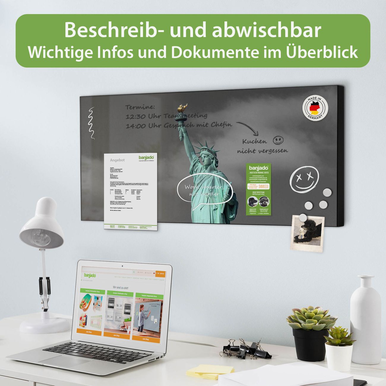 FUNKTION: Die banjado Magnettafel 78x37 cm im Design Motiv Freiheitsstatue vereint Funktionalität und modernes Wohndesign auf stilvolle Weise. Diese hochwertige Magnetwand aus Metall hilft Ihnen dabei, Notizen, Fotos, Termine, Einkaufslisten oder Rezepte übersichtlich zu organisieren. Als praktisches Memoboard sorgt sie für Struktur im Alltag und setzt gleichzeitig einen dekorativen Akzent an Ihrer Wand. DESIGN: Die Metalltafel besteht aus robustem, lackiertem Stahl und ist mit allen handelsüblichen Magneten nutzbar. Besonders praktisch ist die beschreibbare Oberfläche. Sie können die Magnettafel ganz einfach mit Kreidestiften beschriften und die Inhalte bei Bedarf mit einem feuchten Tuch wieder entfernen. So eignet sich das Memoboard ideal für Wochenpläne, Menüpläne, To Do Listen oder kreative Botschaften. DETAILS: Mit ihrem großzügigen Querformat von 78x37 cm bietet die Magnettafel ausreichend Platz für Ihre Organisation. Das Motiv Motiv Freiheitsstatue bringt eine warme, natürliche Optik in Küche, Flur, Büro oder Homeoffice und wirkt auch ohne Magnete oder Beschriftung wie ein modernes Wandbild. NUTZEN: Auf der Rückseite befinden sich vorgefertigte Löcher für eine schnelle und unkomplizierte Wandmontage. Jede banjado Magnettafel wird in Deutschland gefertigt und steht für Qualität, Langlebigkeit und liebevolle Verarbeitung. Dieses beschreibbare Memoboard ist die perfekte Kombination aus Metalltafel, Designobjekt und praktischer Magnetwand für Ihren Alltag. BANJADO: Wir sind ein kleines Team aus dem Herzen von Sachsen. Wir fertigen alle Artikel von Hand für Sie an, Sie erhalten keine preiswerte Importware. Auf Wunsch können Sie auch Ihr eigenes Foto auf die Magnettafel aufbringen, schreiben Sie uns an. Herzlichst, Ihr banjado-Team