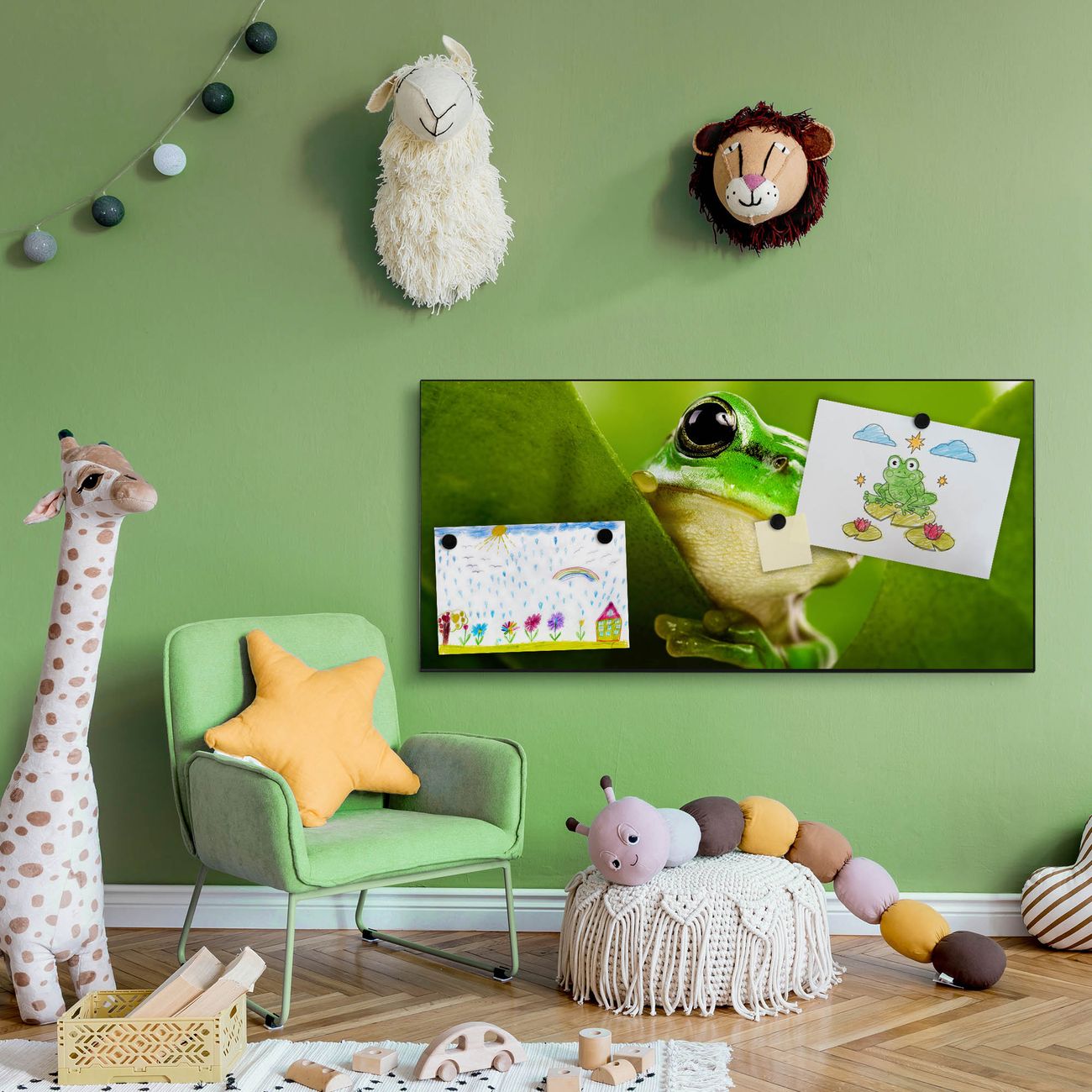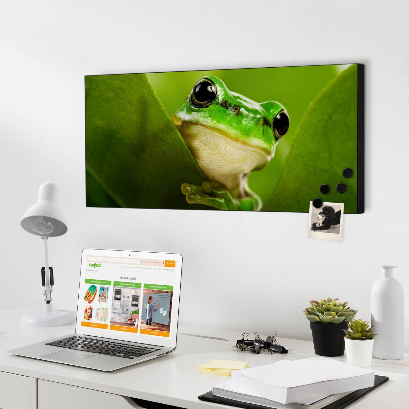FUNKTION:  Die banjado Magnettafel mit Motiv Frosch Motiv bringt Ordnung in Ihr Zettelchaos. Fotos, Termine, Notizen oder Rezepte lassen Sich hier stilvoll mit Magneten ordnen, Sie behalten alles im Blick. An der Design Magnetwand halten alle handesüblichen Magnete. DESIGN:  Die Metall Pinnwand mit dem Motiv Motiv Frosch ist ein eleganter Begleiter im Alltag. Mit dieser Magnettafel haben Sie auch ohne Notizen und Magnete ein schönes Dekoelement. Das Format bietet Ihnen ausreichend Platz um alle wichtigen Informationen im Blick zu behalten. DETAILS: Die magnetische Pinnwand besteht aus silber-grau, weiß oder schwarz lackiertem Stahl. Sie hat eine Größe von 78cm x 37cm. Es befinden sich auf der Rückseite vorgefertigte Löcher die eine schnelle und unkomplizierte Anbringung ermöglichen. Das Motiv ist mit einem seidenmatten Laminat versehen und schützt so zusätzlich vor Kratzern. NUTZEN:  Sie können diese Magnettafel wunderbar als Wandbild nutzen, es halten alle handelsüblichen Magneten daran. Das Memoboard ist mit einem feuchten Lappen oder Schwamm abwischbar. Sie finden bei uns eine große Auswahl an passenden Magneten. BANJADO:  Wir sind ein kleines Team aus dem Herzen von Sachsen. Wir fertigen alle Artikel von Hand für Sie an, Sie erhalten keine preiswerte Importware. Auf Wunsch können Sie auch Ihr eigenes Foto auf die Magnettafel aufbringen, schreiben Sie uns an. Herzlichst, Ihr banjado-Team