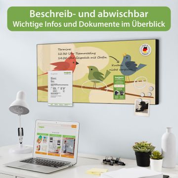 FUNKTION: Die banjado Magnettafel 78x37 cm im Design Motiv Fünf Vögel vereint Funktionalität und modernes Wohndesign auf stilvolle Weise. Diese hochwertige Magnetwand aus Metall hilft Ihnen dabei, Notizen, Fotos, Termine, Einkaufslisten oder Rezepte übersichtlich zu organisieren. Als praktisches Memoboard sorgt sie für Struktur im Alltag und setzt gleichzeitig einen dekorativen Akzent an Ihrer Wand. DESIGN: Die Metalltafel besteht aus robustem, lackiertem Stahl und ist mit allen handelsüblichen Magneten nutzbar. Besonders praktisch ist die beschreibbare Oberfläche. Sie können die Magnettafel ganz einfach mit Kreidestiften beschriften und die Inhalte bei Bedarf mit einem feuchten Tuch wieder entfernen. So eignet sich das Memoboard ideal für Wochenpläne, Menüpläne, To Do Listen oder kreative Botschaften. DETAILS: Mit ihrem großzügigen Querformat von 78x37 cm bietet die Magnettafel ausreichend Platz für Ihre Organisation. Das Motiv Motiv Fünf Vögel bringt eine warme, natürliche Optik in Küche, Flur, Büro oder Homeoffice und wirkt auch ohne Magnete oder Beschriftung wie ein modernes Wandbild. NUTZEN: Auf der Rückseite befinden sich vorgefertigte Löcher für eine schnelle und unkomplizierte Wandmontage. Jede banjado Magnettafel wird in Deutschland gefertigt und steht für Qualität, Langlebigkeit und liebevolle Verarbeitung. Dieses beschreibbare Memoboard ist die perfekte Kombination aus Metalltafel, Designobjekt und praktischer Magnetwand für Ihren Alltag. BANJADO: Wir sind ein kleines Team aus dem Herzen von Sachsen. Wir fertigen alle Artikel von Hand für Sie an, Sie erhalten keine preiswerte Importware. Auf Wunsch können Sie auch Ihr eigenes Foto auf die Magnettafel aufbringen, schreiben Sie uns an. Herzlichst, Ihr banjado-Team