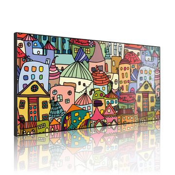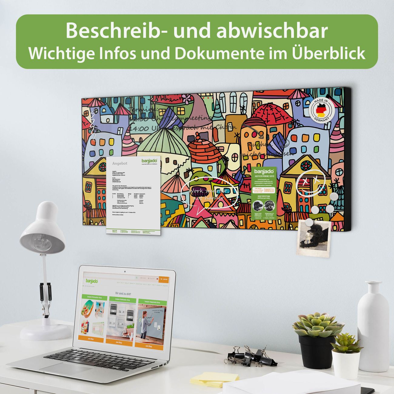 FUNKTION: Die banjado Magnettafel 78x37 cm im Design Motiv Funky Town vereint Funktionalität und modernes Wohndesign auf stilvolle Weise. Diese hochwertige Magnetwand aus Metall hilft Ihnen dabei, Notizen, Fotos, Termine, Einkaufslisten oder Rezepte übersichtlich zu organisieren. Als praktisches Memoboard sorgt sie für Struktur im Alltag und setzt gleichzeitig einen dekorativen Akzent an Ihrer Wand. DESIGN: Die Metalltafel besteht aus robustem, lackiertem Stahl und ist mit allen handelsüblichen Magneten nutzbar. Besonders praktisch ist die beschreibbare Oberfläche. Sie können die Magnettafel ganz einfach mit Kreidestiften beschriften und die Inhalte bei Bedarf mit einem feuchten Tuch wieder entfernen. So eignet sich das Memoboard ideal für Wochenpläne, Menüpläne, To Do Listen oder kreative Botschaften. DETAILS: Mit ihrem großzügigen Querformat von 78x37 cm bietet die Magnettafel ausreichend Platz für Ihre Organisation. Das Motiv Motiv Funky Town bringt eine warme, natürliche Optik in Küche, Flur, Büro oder Homeoffice und wirkt auch ohne Magnete oder Beschriftung wie ein modernes Wandbild. NUTZEN: Auf der Rückseite befinden sich vorgefertigte Löcher für eine schnelle und unkomplizierte Wandmontage. Jede banjado Magnettafel wird in Deutschland gefertigt und steht für Qualität, Langlebigkeit und liebevolle Verarbeitung. Dieses beschreibbare Memoboard ist die perfekte Kombination aus Metalltafel, Designobjekt und praktischer Magnetwand für Ihren Alltag. BANJADO: Wir sind ein kleines Team aus dem Herzen von Sachsen. Wir fertigen alle Artikel von Hand für Sie an, Sie erhalten keine preiswerte Importware. Auf Wunsch können Sie auch Ihr eigenes Foto auf die Magnettafel aufbringen, schreiben Sie uns an. Herzlichst, Ihr banjado-Team