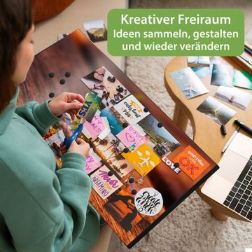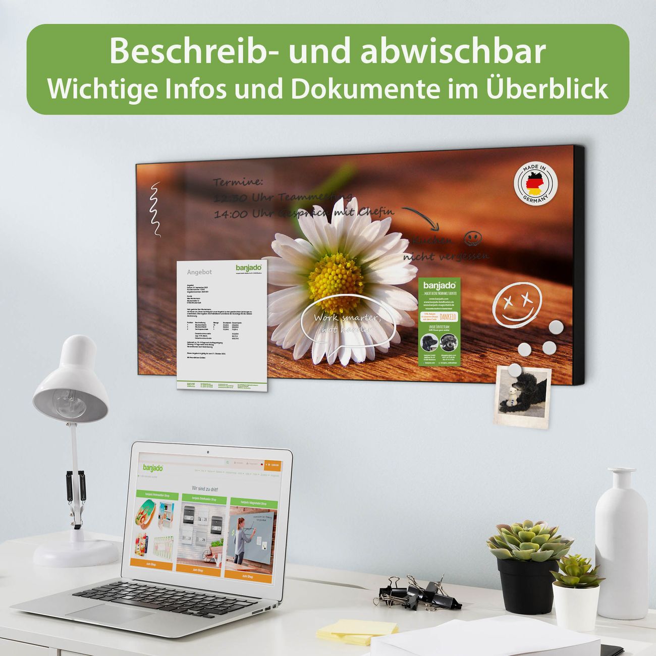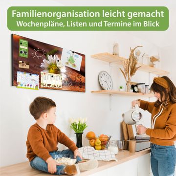 FUNKTION: Die banjado Magnettafel 78x37 cm im Design Motiv Gänseblümchen vereint Funktionalität und modernes Wohndesign auf stilvolle Weise. Diese hochwertige Magnetwand aus Metall hilft Ihnen dabei, Notizen, Fotos, Termine, Einkaufslisten oder Rezepte übersichtlich zu organisieren. Als praktisches Memoboard sorgt sie für Struktur im Alltag und setzt gleichzeitig einen dekorativen Akzent an Ihrer Wand. DESIGN: Die Metalltafel besteht aus robustem, lackiertem Stahl und ist mit allen handelsüblichen Magneten nutzbar. Besonders praktisch ist die beschreibbare Oberfläche. Sie können die Magnettafel ganz einfach mit Kreidestiften beschriften und die Inhalte bei Bedarf mit einem feuchten Tuch wieder entfernen. So eignet sich das Memoboard ideal für Wochenpläne, Menüpläne, To Do Listen oder kreative Botschaften. DETAILS: Mit ihrem großzügigen Querformat von 78x37 cm bietet die Magnettafel ausreichend Platz für Ihre Organisation. Das Motiv Motiv Gänseblümchen bringt eine warme, natürliche Optik in Küche, Flur, Büro oder Homeoffice und wirkt auch ohne Magnete oder Beschriftung wie ein modernes Wandbild. NUTZEN: Auf der Rückseite befinden sich vorgefertigte Löcher für eine schnelle und unkomplizierte Wandmontage. Jede banjado Magnettafel wird in Deutschland gefertigt und steht für Qualität, Langlebigkeit und liebevolle Verarbeitung. Dieses beschreibbare Memoboard ist die perfekte Kombination aus Metalltafel, Designobjekt und praktischer Magnetwand für Ihren Alltag. BANJADO: Wir sind ein kleines Team aus dem Herzen von Sachsen. Wir fertigen alle Artikel von Hand für Sie an, Sie erhalten keine preiswerte Importware. Auf Wunsch können Sie auch Ihr eigenes Foto auf die Magnettafel aufbringen, schreiben Sie uns an. Herzlichst, Ihr banjado-Team