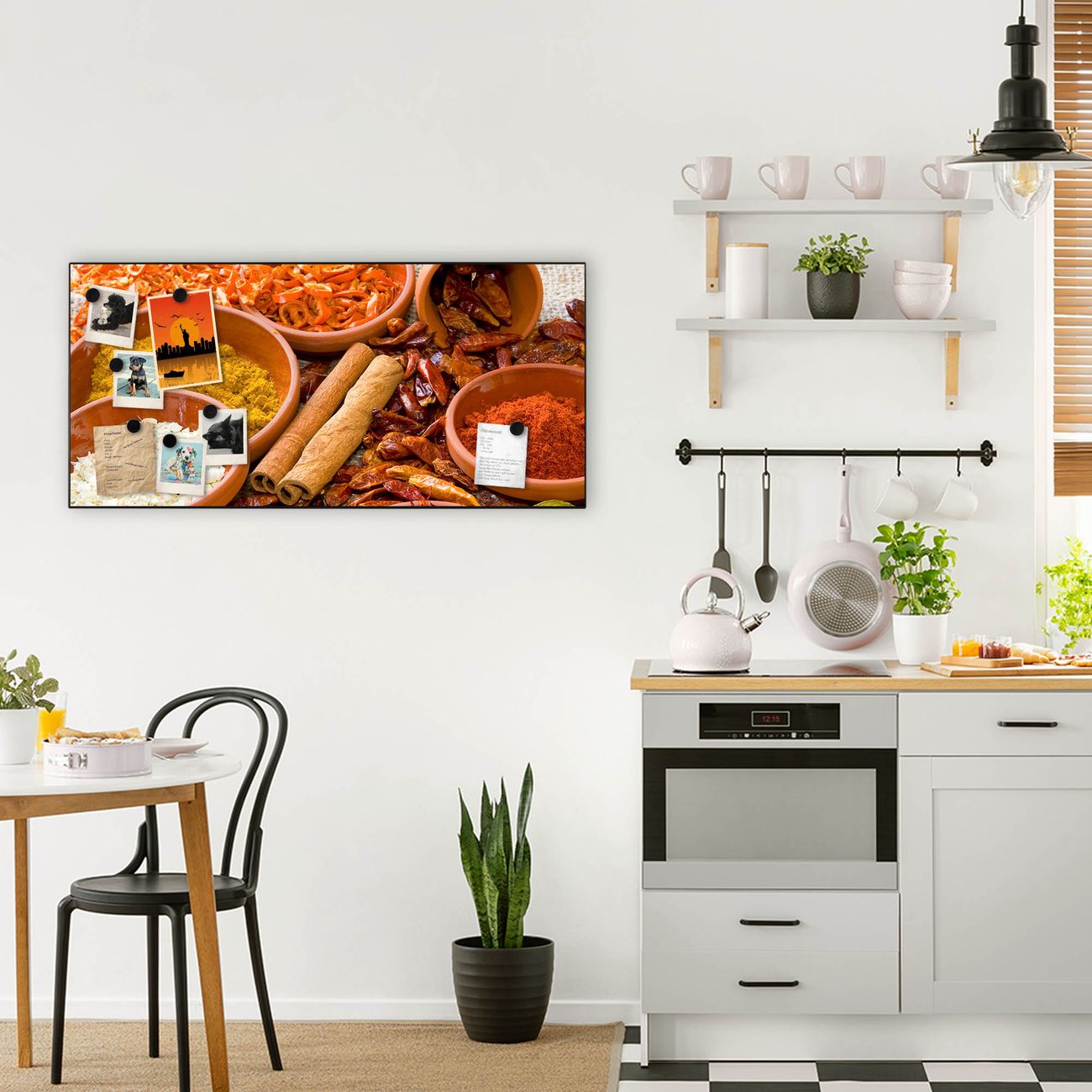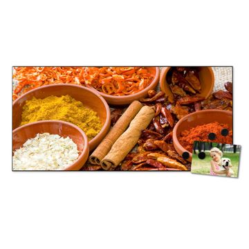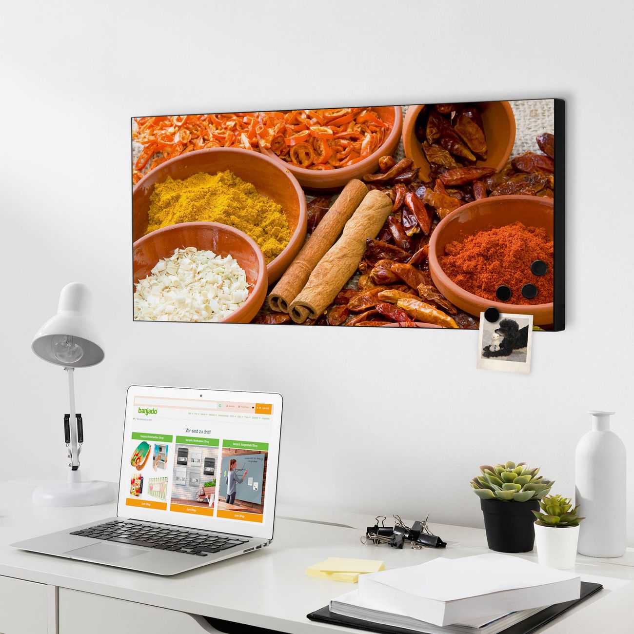 FUNKTION:  Die banjado Magnettafel mit Motiv Gewürze Motiv bringt Ordnung in Ihr Zettelchaos. Fotos, Termine, Notizen oder Rezepte lassen Sich hier stilvoll mit Magneten ordnen, Sie behalten alles im Blick. An der Design Magnetwand halten alle handesüblichen Magnete. DESIGN:  Die Metall Pinnwand mit dem Motiv Motiv Gewürze ist ein eleganter Begleiter im Alltag. Mit dieser Magnettafel haben Sie auch ohne Notizen und Magnete ein schönes Dekoelement. Das Format bietet Ihnen ausreichend Platz um alle wichtigen Informationen im Blick zu behalten. DETAILS: Die magnetische Pinnwand besteht aus silber-grau, weiß oder schwarz lackiertem Stahl. Sie hat eine Größe von 78cm x 37cm. Es befinden sich auf der Rückseite vorgefertigte Löcher die eine schnelle und unkomplizierte Anbringung ermöglichen. Das Motiv ist mit einem seidenmatten Laminat versehen und schützt so zusätzlich vor Kratzern. NUTZEN:  Sie können diese Magnettafel wunderbar als Wandbild nutzen, es halten alle handelsüblichen Magneten daran. Das Memoboard ist mit einem feuchten Lappen oder Schwamm abwischbar. Sie finden bei uns eine große Auswahl an passenden Magneten. BANJADO:  Wir sind ein kleines Team aus dem Herzen von Sachsen. Wir fertigen alle Artikel von Hand für Sie an, Sie erhalten keine preiswerte Importware. Auf Wunsch können Sie auch Ihr eigenes Foto auf die Magnettafel aufbringen, schreiben Sie uns an. Herzlichst, Ihr banjado-Team