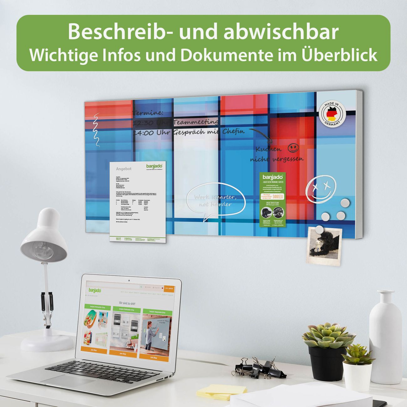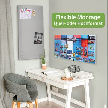FUNKTION: Die banjado Magnettafel 78x37 cm im Design Motiv Gläserne Stadt vereint Funktionalität und modernes Wohndesign auf stilvolle Weise. Diese hochwertige Magnetwand aus Metall hilft Ihnen dabei, Notizen, Fotos, Termine, Einkaufslisten oder Rezepte übersichtlich zu organisieren. Als praktisches Memoboard sorgt sie für Struktur im Alltag und setzt gleichzeitig einen dekorativen Akzent an Ihrer Wand. DESIGN: Die Metalltafel besteht aus robustem, lackiertem Stahl und ist mit allen handelsüblichen Magneten nutzbar. Besonders praktisch ist die beschreibbare Oberfläche. Sie können die Magnettafel ganz einfach mit Kreidestiften beschriften und die Inhalte bei Bedarf mit einem feuchten Tuch wieder entfernen. So eignet sich das Memoboard ideal für Wochenpläne, Menüpläne, To Do Listen oder kreative Botschaften. DETAILS: Mit ihrem großzügigen Querformat von 78x37 cm bietet die Magnettafel ausreichend Platz für Ihre Organisation. Das Motiv Motiv Gläserne Stadt bringt eine warme, natürliche Optik in Küche, Flur, Büro oder Homeoffice und wirkt auch ohne Magnete oder Beschriftung wie ein modernes Wandbild. NUTZEN: Auf der Rückseite befinden sich vorgefertigte Löcher für eine schnelle und unkomplizierte Wandmontage. Jede banjado Magnettafel wird in Deutschland gefertigt und steht für Qualität, Langlebigkeit und liebevolle Verarbeitung. Dieses beschreibbare Memoboard ist die perfekte Kombination aus Metalltafel, Designobjekt und praktischer Magnetwand für Ihren Alltag. BANJADO: Wir sind ein kleines Team aus dem Herzen von Sachsen. Wir fertigen alle Artikel von Hand für Sie an, Sie erhalten keine preiswerte Importware. Auf Wunsch können Sie auch Ihr eigenes Foto auf die Magnettafel aufbringen, schreiben Sie uns an. Herzlichst, Ihr banjado-Team
