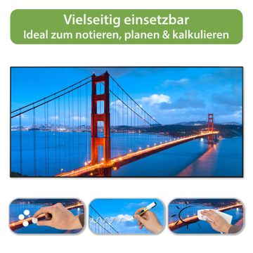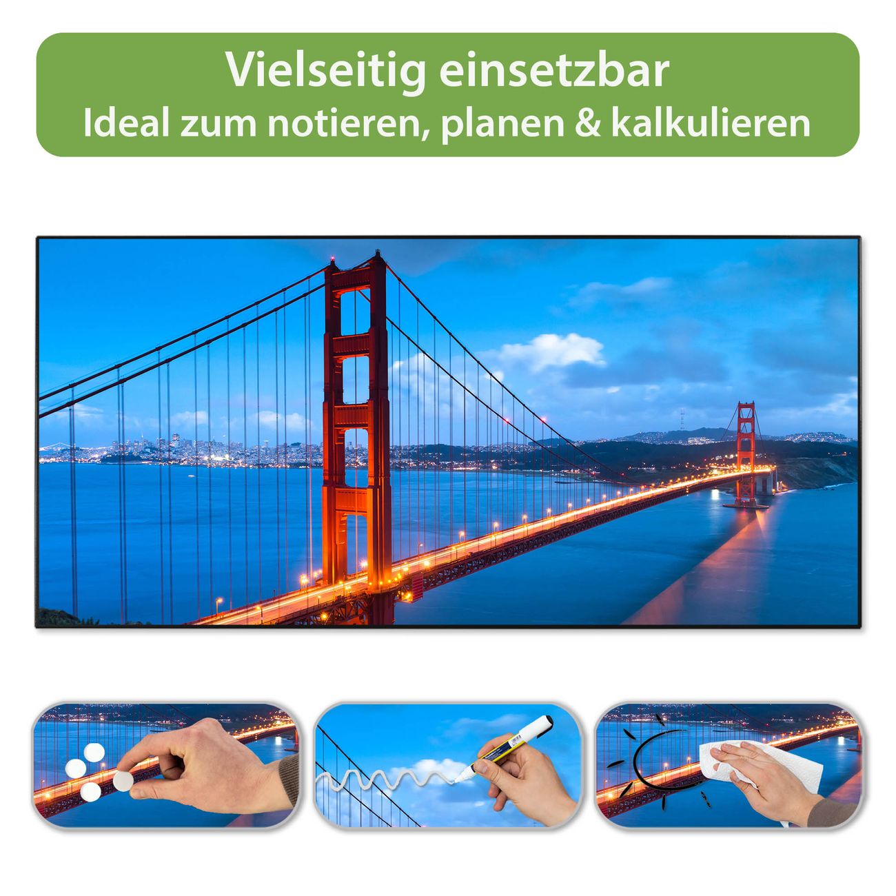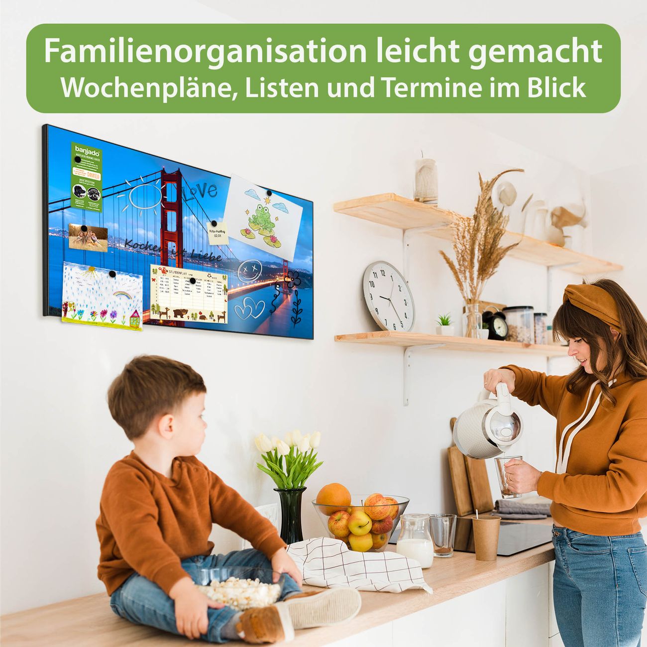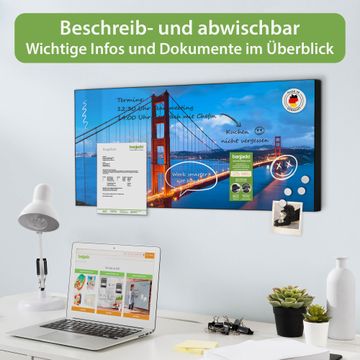 FUNKTION: Die banjado Magnettafel 78x37 cm im Design Motiv Golden Gate Bridge vereint Funktionalität und modernes Wohndesign auf stilvolle Weise. Diese hochwertige Magnetwand aus Metall hilft Ihnen dabei, Notizen, Fotos, Termine, Einkaufslisten oder Rezepte übersichtlich zu organisieren. Als praktisches Memoboard sorgt sie für Struktur im Alltag und setzt gleichzeitig einen dekorativen Akzent an Ihrer Wand. DESIGN: Die Metalltafel besteht aus robustem, lackiertem Stahl und ist mit allen handelsüblichen Magneten nutzbar. Besonders praktisch ist die beschreibbare Oberfläche. Sie können die Magnettafel ganz einfach mit Kreidestiften beschriften und die Inhalte bei Bedarf mit einem feuchten Tuch wieder entfernen. So eignet sich das Memoboard ideal für Wochenpläne, Menüpläne, To Do Listen oder kreative Botschaften. DETAILS: Mit ihrem großzügigen Querformat von 78x37 cm bietet die Magnettafel ausreichend Platz für Ihre Organisation. Das Motiv Motiv Golden Gate Bridge bringt eine warme, natürliche Optik in Küche, Flur, Büro oder Homeoffice und wirkt auch ohne Magnete oder Beschriftung wie ein modernes Wandbild. NUTZEN: Auf der Rückseite befinden sich vorgefertigte Löcher für eine schnelle und unkomplizierte Wandmontage. Jede banjado Magnettafel wird in Deutschland gefertigt und steht für Qualität, Langlebigkeit und liebevolle Verarbeitung. Dieses beschreibbare Memoboard ist die perfekte Kombination aus Metalltafel, Designobjekt und praktischer Magnetwand für Ihren Alltag. BANJADO: Wir sind ein kleines Team aus dem Herzen von Sachsen. Wir fertigen alle Artikel von Hand für Sie an, Sie erhalten keine preiswerte Importware. Auf Wunsch können Sie auch Ihr eigenes Foto auf die Magnettafel aufbringen, schreiben Sie uns an. Herzlichst, Ihr banjado-Team