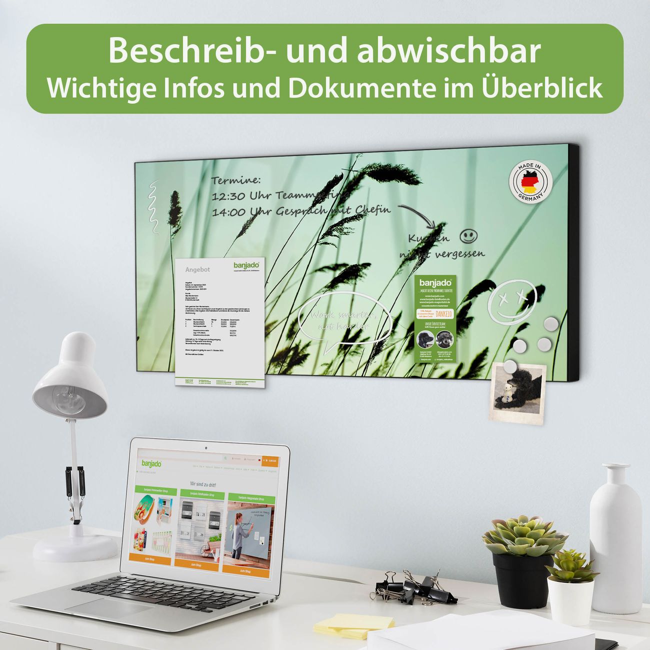 FUNKTION: Die banjado Magnettafel 78x37 cm im Design Motiv Gräser vereint Funktionalität und modernes Wohndesign auf stilvolle Weise. Diese hochwertige Magnetwand aus Metall hilft Ihnen dabei, Notizen, Fotos, Termine, Einkaufslisten oder Rezepte übersichtlich zu organisieren. Als praktisches Memoboard sorgt sie für Struktur im Alltag und setzt gleichzeitig einen dekorativen Akzent an Ihrer Wand. DESIGN: Die Metalltafel besteht aus robustem, lackiertem Stahl und ist mit allen handelsüblichen Magneten nutzbar. Besonders praktisch ist die beschreibbare Oberfläche. Sie können die Magnettafel ganz einfach mit Kreidestiften beschriften und die Inhalte bei Bedarf mit einem feuchten Tuch wieder entfernen. So eignet sich das Memoboard ideal für Wochenpläne, Menüpläne, To Do Listen oder kreative Botschaften. DETAILS: Mit ihrem großzügigen Querformat von 78x37 cm bietet die Magnettafel ausreichend Platz für Ihre Organisation. Das Motiv Motiv Gräser bringt eine warme, natürliche Optik in Küche, Flur, Büro oder Homeoffice und wirkt auch ohne Magnete oder Beschriftung wie ein modernes Wandbild. NUTZEN: Auf der Rückseite befinden sich vorgefertigte Löcher für eine schnelle und unkomplizierte Wandmontage. Jede banjado Magnettafel wird in Deutschland gefertigt und steht für Qualität, Langlebigkeit und liebevolle Verarbeitung. Dieses beschreibbare Memoboard ist die perfekte Kombination aus Metalltafel, Designobjekt und praktischer Magnetwand für Ihren Alltag. BANJADO: Wir sind ein kleines Team aus dem Herzen von Sachsen. Wir fertigen alle Artikel von Hand für Sie an, Sie erhalten keine preiswerte Importware. Auf Wunsch können Sie auch Ihr eigenes Foto auf die Magnettafel aufbringen, schreiben Sie uns an. Herzlichst, Ihr banjado-Team