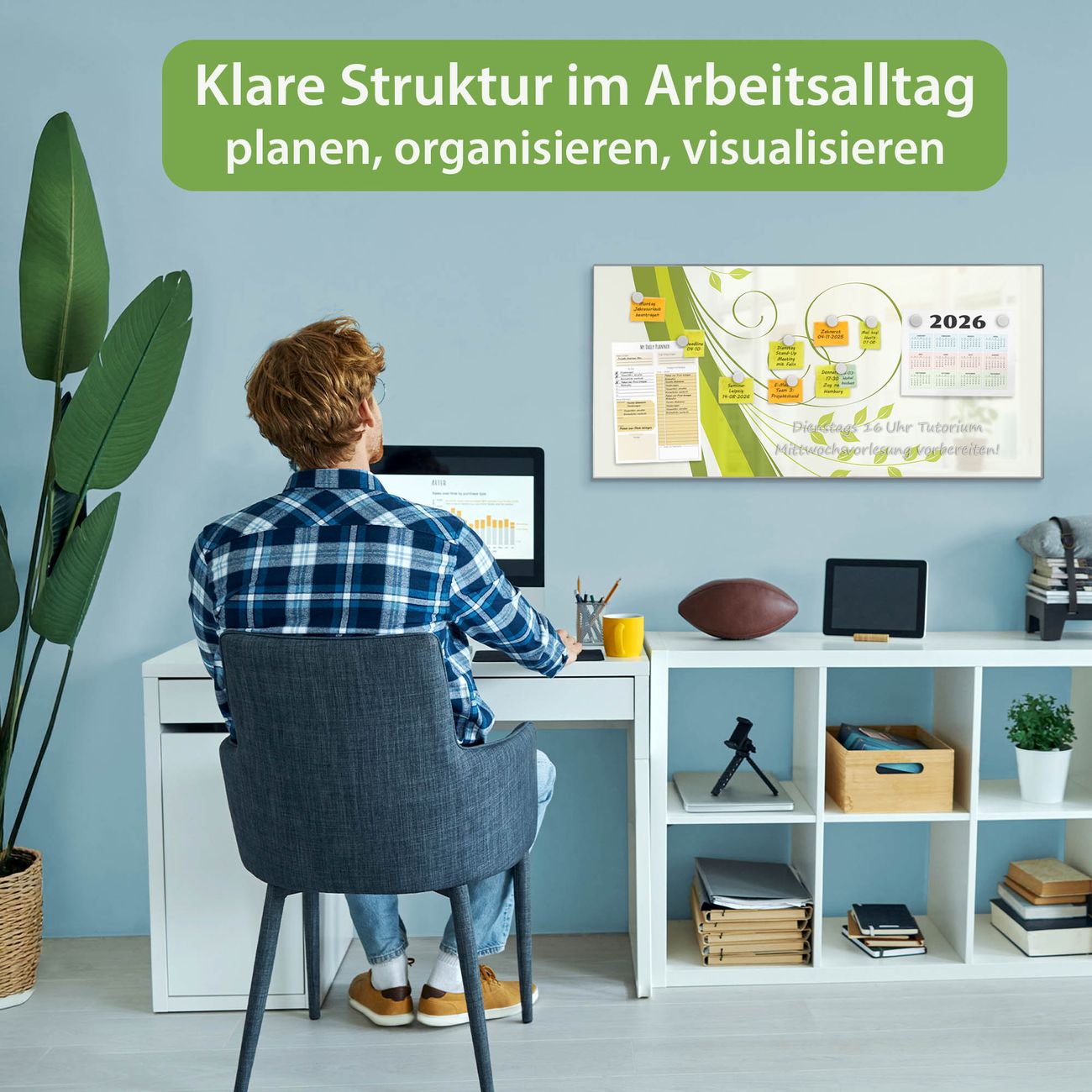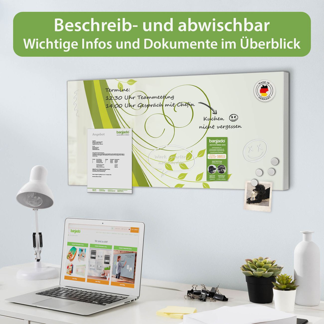 FUNKTION: Die banjado Magnettafel 78x37 cm im Design Motiv Green Swirl vereint Funktionalität und modernes Wohndesign auf stilvolle Weise. Diese hochwertige Magnetwand aus Metall hilft Ihnen dabei, Notizen, Fotos, Termine, Einkaufslisten oder Rezepte übersichtlich zu organisieren. Als praktisches Memoboard sorgt sie für Struktur im Alltag und setzt gleichzeitig einen dekorativen Akzent an Ihrer Wand. DESIGN: Die Metalltafel besteht aus robustem, lackiertem Stahl und ist mit allen handelsüblichen Magneten nutzbar. Besonders praktisch ist die beschreibbare Oberfläche. Sie können die Magnettafel ganz einfach mit Kreidestiften beschriften und die Inhalte bei Bedarf mit einem feuchten Tuch wieder entfernen. So eignet sich das Memoboard ideal für Wochenpläne, Menüpläne, To Do Listen oder kreative Botschaften. DETAILS: Mit ihrem großzügigen Querformat von 78x37 cm bietet die Magnettafel ausreichend Platz für Ihre Organisation. Das Motiv Motiv Green Swirl bringt eine warme, natürliche Optik in Küche, Flur, Büro oder Homeoffice und wirkt auch ohne Magnete oder Beschriftung wie ein modernes Wandbild. NUTZEN: Auf der Rückseite befinden sich vorgefertigte Löcher für eine schnelle und unkomplizierte Wandmontage. Jede banjado Magnettafel wird in Deutschland gefertigt und steht für Qualität, Langlebigkeit und liebevolle Verarbeitung. Dieses beschreibbare Memoboard ist die perfekte Kombination aus Metalltafel, Designobjekt und praktischer Magnetwand für Ihren Alltag. BANJADO: Wir sind ein kleines Team aus dem Herzen von Sachsen. Wir fertigen alle Artikel von Hand für Sie an, Sie erhalten keine preiswerte Importware. Auf Wunsch können Sie auch Ihr eigenes Foto auf die Magnettafel aufbringen, schreiben Sie uns an. Herzlichst, Ihr banjado-Team