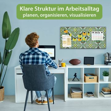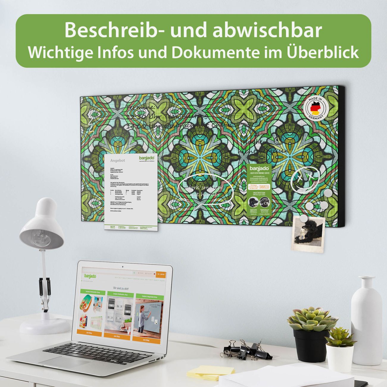 FUNKTION: Die banjado Magnettafel 78x37 cm im Design Motiv Grünes Muster vereint Funktionalität und modernes Wohndesign auf stilvolle Weise. Diese hochwertige Magnetwand aus Metall hilft Ihnen dabei, Notizen, Fotos, Termine, Einkaufslisten oder Rezepte übersichtlich zu organisieren. Als praktisches Memoboard sorgt sie für Struktur im Alltag und setzt gleichzeitig einen dekorativen Akzent an Ihrer Wand. DESIGN: Die Metalltafel besteht aus robustem, lackiertem Stahl und ist mit allen handelsüblichen Magneten nutzbar. Besonders praktisch ist die beschreibbare Oberfläche. Sie können die Magnettafel ganz einfach mit Kreidestiften beschriften und die Inhalte bei Bedarf mit einem feuchten Tuch wieder entfernen. So eignet sich das Memoboard ideal für Wochenpläne, Menüpläne, To Do Listen oder kreative Botschaften. DETAILS: Mit ihrem großzügigen Querformat von 78x37 cm bietet die Magnettafel ausreichend Platz für Ihre Organisation. Das Motiv Motiv Grünes Muster bringt eine warme, natürliche Optik in Küche, Flur, Büro oder Homeoffice und wirkt auch ohne Magnete oder Beschriftung wie ein modernes Wandbild. NUTZEN: Auf der Rückseite befinden sich vorgefertigte Löcher für eine schnelle und unkomplizierte Wandmontage. Jede banjado Magnettafel wird in Deutschland gefertigt und steht für Qualität, Langlebigkeit und liebevolle Verarbeitung. Dieses beschreibbare Memoboard ist die perfekte Kombination aus Metalltafel, Designobjekt und praktischer Magnetwand für Ihren Alltag. BANJADO: Wir sind ein kleines Team aus dem Herzen von Sachsen. Wir fertigen alle Artikel von Hand für Sie an, Sie erhalten keine preiswerte Importware. Auf Wunsch können Sie auch Ihr eigenes Foto auf die Magnettafel aufbringen, schreiben Sie uns an. Herzlichst, Ihr banjado-Team
