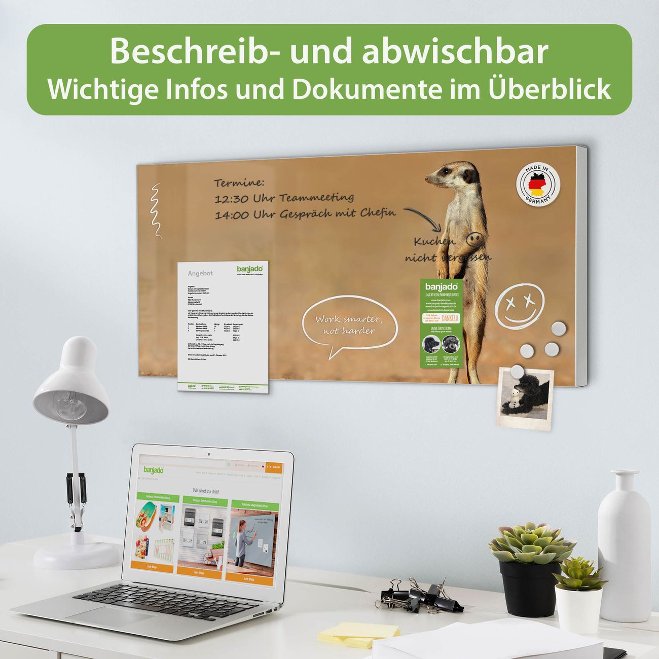 FUNKTION: Die banjado Magnettafel 78x37 cm im Design Motiv Henryk 2 vereint Funktionalität und modernes Wohndesign auf stilvolle Weise. Diese hochwertige Magnetwand aus Metall hilft Ihnen dabei, Notizen, Fotos, Termine, Einkaufslisten oder Rezepte übersichtlich zu organisieren. Als praktisches Memoboard sorgt sie für Struktur im Alltag und setzt gleichzeitig einen dekorativen Akzent an Ihrer Wand. DESIGN: Die Metalltafel besteht aus robustem, lackiertem Stahl und ist mit allen handelsüblichen Magneten nutzbar. Besonders praktisch ist die beschreibbare Oberfläche. Sie können die Magnettafel ganz einfach mit Kreidestiften beschriften und die Inhalte bei Bedarf mit einem feuchten Tuch wieder entfernen. So eignet sich das Memoboard ideal für Wochenpläne, Menüpläne, To Do Listen oder kreative Botschaften. DETAILS: Mit ihrem großzügigen Querformat von 78x37 cm bietet die Magnettafel ausreichend Platz für Ihre Organisation. Das Motiv Motiv Henryk 2 bringt eine warme, natürliche Optik in Küche, Flur, Büro oder Homeoffice und wirkt auch ohne Magnete oder Beschriftung wie ein modernes Wandbild. NUTZEN: Auf der Rückseite befinden sich vorgefertigte Löcher für eine schnelle und unkomplizierte Wandmontage. Jede banjado Magnettafel wird in Deutschland gefertigt und steht für Qualität, Langlebigkeit und liebevolle Verarbeitung. Dieses beschreibbare Memoboard ist die perfekte Kombination aus Metalltafel, Designobjekt und praktischer Magnetwand für Ihren Alltag. BANJADO: Wir sind ein kleines Team aus dem Herzen von Sachsen. Wir fertigen alle Artikel von Hand für Sie an, Sie erhalten keine preiswerte Importware. Auf Wunsch können Sie auch Ihr eigenes Foto auf die Magnettafel aufbringen, schreiben Sie uns an. Herzlichst, Ihr banjado-Team