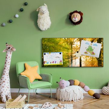 FUNKTION:  Die banjado Magnettafel mit Motiv Herbstwald Motiv bringt Ordnung in Ihr Zettelchaos. Fotos, Termine, Notizen oder Rezepte lassen Sich hier stilvoll mit Magneten ordnen, Sie behalten alles im Blick. An der Design Magnetwand halten alle handesüblichen Magnete. DESIGN:  Die Metall Pinnwand mit dem Motiv Motiv Herbstwald ist ein eleganter Begleiter im Alltag. Mit dieser Magnettafel haben Sie auch ohne Notizen und Magnete ein schönes Dekoelement. Das Format bietet Ihnen ausreichend Platz um alle wichtigen Informationen im Blick zu behalten. DETAILS: Die magnetische Pinnwand besteht aus silber-grau, weiß oder schwarz lackiertem Stahl. Sie hat eine Größe von 78cm x 37cm. Es befinden sich auf der Rückseite vorgefertigte Löcher die eine schnelle und unkomplizierte Anbringung ermöglichen. Das Motiv ist mit einem seidenmatten Laminat versehen und schützt so zusätzlich vor Kratzern. NUTZEN:  Sie können diese Magnettafel wunderbar als Wandbild nutzen, es halten alle handelsüblichen Magneten daran. Das Memoboard ist mit einem feuchten Lappen oder Schwamm abwischbar. Sie finden bei uns eine große Auswahl an passenden Magneten. BANJADO:  Wir sind ein kleines Team aus dem Herzen von Sachsen. Wir fertigen alle Artikel von Hand für Sie an, Sie erhalten keine preiswerte Importware. Auf Wunsch können Sie auch Ihr eigenes Foto auf die Magnettafel aufbringen, schreiben Sie uns an. Herzlichst, Ihr banjado-Team