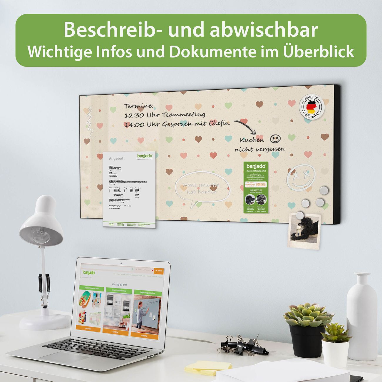 FUNKTION: Die banjado Magnettafel 78x37 cm im Design Motiv Herzen bunt vereint Funktionalität und modernes Wohndesign auf stilvolle Weise. Diese hochwertige Magnetwand aus Metall hilft Ihnen dabei, Notizen, Fotos, Termine, Einkaufslisten oder Rezepte übersichtlich zu organisieren. Als praktisches Memoboard sorgt sie für Struktur im Alltag und setzt gleichzeitig einen dekorativen Akzent an Ihrer Wand. DESIGN: Die Metalltafel besteht aus robustem, lackiertem Stahl und ist mit allen handelsüblichen Magneten nutzbar. Besonders praktisch ist die beschreibbare Oberfläche. Sie können die Magnettafel ganz einfach mit Kreidestiften beschriften und die Inhalte bei Bedarf mit einem feuchten Tuch wieder entfernen. So eignet sich das Memoboard ideal für Wochenpläne, Menüpläne, To Do Listen oder kreative Botschaften. DETAILS: Mit ihrem großzügigen Querformat von 78x37 cm bietet die Magnettafel ausreichend Platz für Ihre Organisation. Das Motiv Motiv Herzen bunt bringt eine warme, natürliche Optik in Küche, Flur, Büro oder Homeoffice und wirkt auch ohne Magnete oder Beschriftung wie ein modernes Wandbild. NUTZEN: Auf der Rückseite befinden sich vorgefertigte Löcher für eine schnelle und unkomplizierte Wandmontage. Jede banjado Magnettafel wird in Deutschland gefertigt und steht für Qualität, Langlebigkeit und liebevolle Verarbeitung. Dieses beschreibbare Memoboard ist die perfekte Kombination aus Metalltafel, Designobjekt und praktischer Magnetwand für Ihren Alltag. BANJADO: Wir sind ein kleines Team aus dem Herzen von Sachsen. Wir fertigen alle Artikel von Hand für Sie an, Sie erhalten keine preiswerte Importware. Auf Wunsch können Sie auch Ihr eigenes Foto auf die Magnettafel aufbringen, schreiben Sie uns an. Herzlichst, Ihr banjado-Team