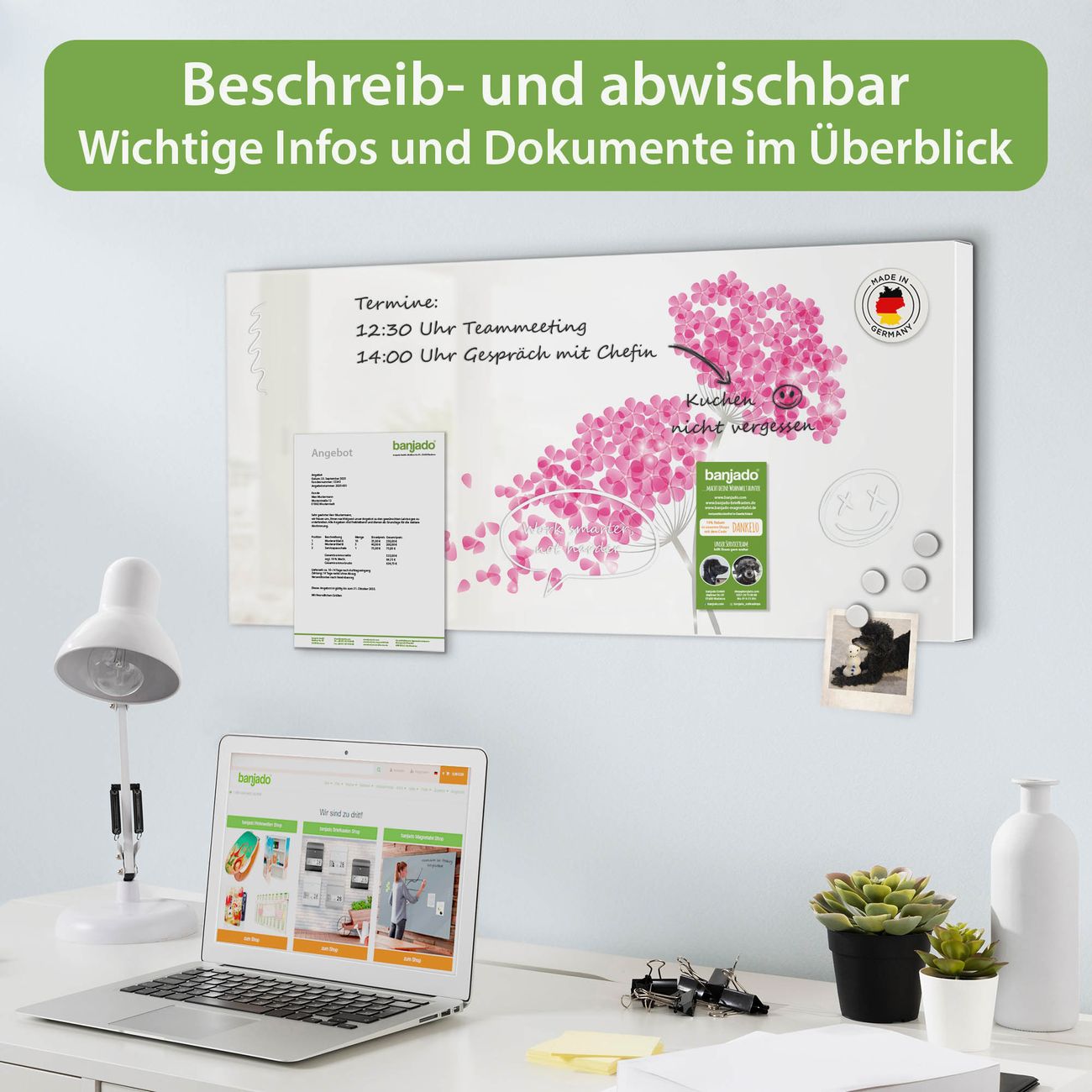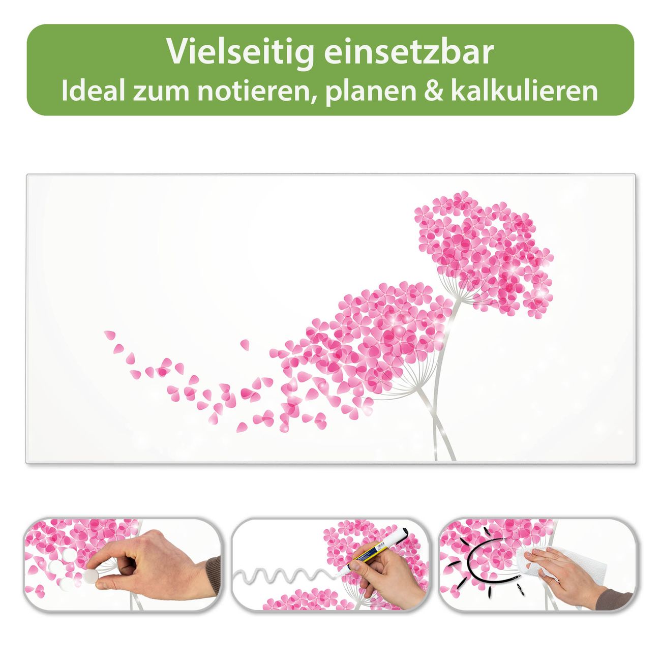FUNKTION: Die banjado Magnettafel 78x37 cm im Design Motiv Holunder Pink vereint Funktionalität und modernes Wohndesign auf stilvolle Weise. Diese hochwertige Magnetwand aus Metall hilft Ihnen dabei, Notizen, Fotos, Termine, Einkaufslisten oder Rezepte übersichtlich zu organisieren. Als praktisches Memoboard sorgt sie für Struktur im Alltag und setzt gleichzeitig einen dekorativen Akzent an Ihrer Wand. DESIGN: Die Metalltafel besteht aus robustem, lackiertem Stahl und ist mit allen handelsüblichen Magneten nutzbar. Besonders praktisch ist die beschreibbare Oberfläche. Sie können die Magnettafel ganz einfach mit Kreidestiften beschriften und die Inhalte bei Bedarf mit einem feuchten Tuch wieder entfernen. So eignet sich das Memoboard ideal für Wochenpläne, Menüpläne, To Do Listen oder kreative Botschaften. DETAILS: Mit ihrem großzügigen Querformat von 78x37 cm bietet die Magnettafel ausreichend Platz für Ihre Organisation. Das Motiv Motiv Holunder Pink bringt eine warme, natürliche Optik in Küche, Flur, Büro oder Homeoffice und wirkt auch ohne Magnete oder Beschriftung wie ein modernes Wandbild. NUTZEN: Auf der Rückseite befinden sich vorgefertigte Löcher für eine schnelle und unkomplizierte Wandmontage. Jede banjado Magnettafel wird in Deutschland gefertigt und steht für Qualität, Langlebigkeit und liebevolle Verarbeitung. Dieses beschreibbare Memoboard ist die perfekte Kombination aus Metalltafel, Designobjekt und praktischer Magnetwand für Ihren Alltag. BANJADO: Wir sind ein kleines Team aus dem Herzen von Sachsen. Wir fertigen alle Artikel von Hand für Sie an, Sie erhalten keine preiswerte Importware. Auf Wunsch können Sie auch Ihr eigenes Foto auf die Magnettafel aufbringen, schreiben Sie uns an. Herzlichst, Ihr banjado-Team