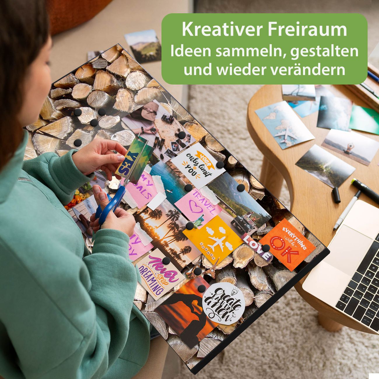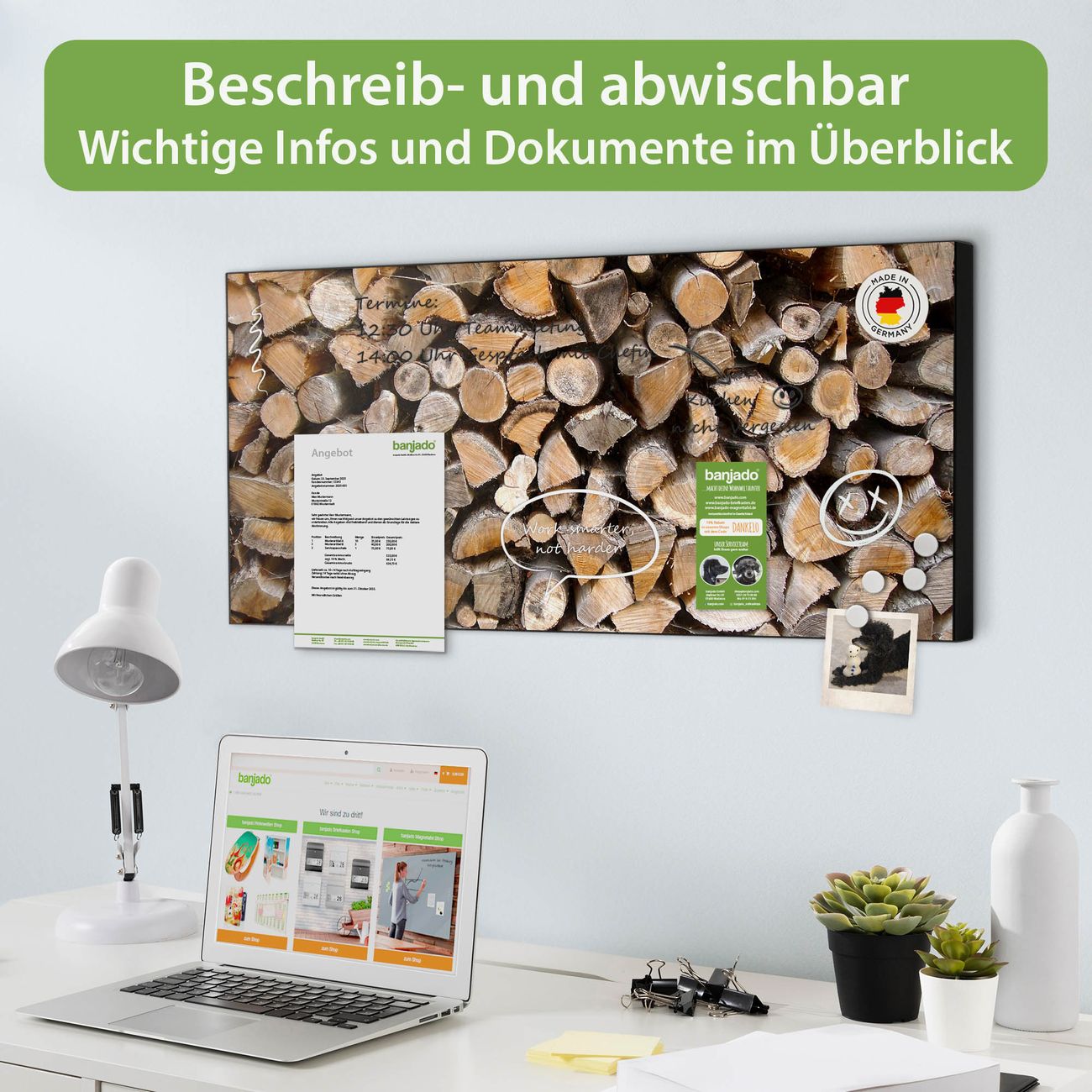 FUNKTION: Die banjado Magnettafel 78x37 cm im Design Motiv Holzstapel vereint Funktionalität und modernes Wohndesign auf stilvolle Weise. Diese hochwertige Magnetwand aus Metall hilft Ihnen dabei, Notizen, Fotos, Termine, Einkaufslisten oder Rezepte übersichtlich zu organisieren. Als praktisches Memoboard sorgt sie für Struktur im Alltag und setzt gleichzeitig einen dekorativen Akzent an Ihrer Wand. DESIGN: Die Metalltafel besteht aus robustem, lackiertem Stahl und ist mit allen handelsüblichen Magneten nutzbar. Besonders praktisch ist die beschreibbare Oberfläche. Sie können die Magnettafel ganz einfach mit Kreidestiften beschriften und die Inhalte bei Bedarf mit einem feuchten Tuch wieder entfernen. So eignet sich das Memoboard ideal für Wochenpläne, Menüpläne, To Do Listen oder kreative Botschaften. DETAILS: Mit ihrem großzügigen Querformat von 78x37 cm bietet die Magnettafel ausreichend Platz für Ihre Organisation. Das Motiv Motiv Holzstapel bringt eine warme, natürliche Optik in Küche, Flur, Büro oder Homeoffice und wirkt auch ohne Magnete oder Beschriftung wie ein modernes Wandbild. NUTZEN: Auf der Rückseite befinden sich vorgefertigte Löcher für eine schnelle und unkomplizierte Wandmontage. Jede banjado Magnettafel wird in Deutschland gefertigt und steht für Qualität, Langlebigkeit und liebevolle Verarbeitung. Dieses beschreibbare Memoboard ist die perfekte Kombination aus Metalltafel, Designobjekt und praktischer Magnetwand für Ihren Alltag. BANJADO: Wir sind ein kleines Team aus dem Herzen von Sachsen. Wir fertigen alle Artikel von Hand für Sie an, Sie erhalten keine preiswerte Importware. Auf Wunsch können Sie auch Ihr eigenes Foto auf die Magnettafel aufbringen, schreiben Sie uns an. Herzlichst, Ihr banjado-Team