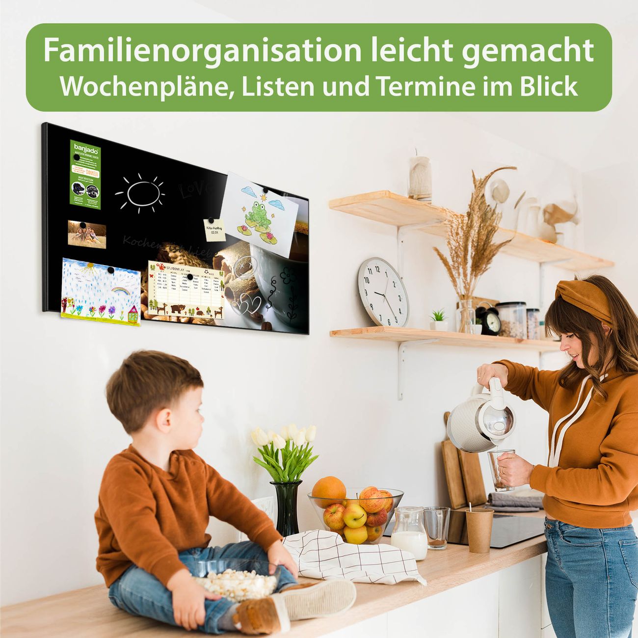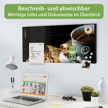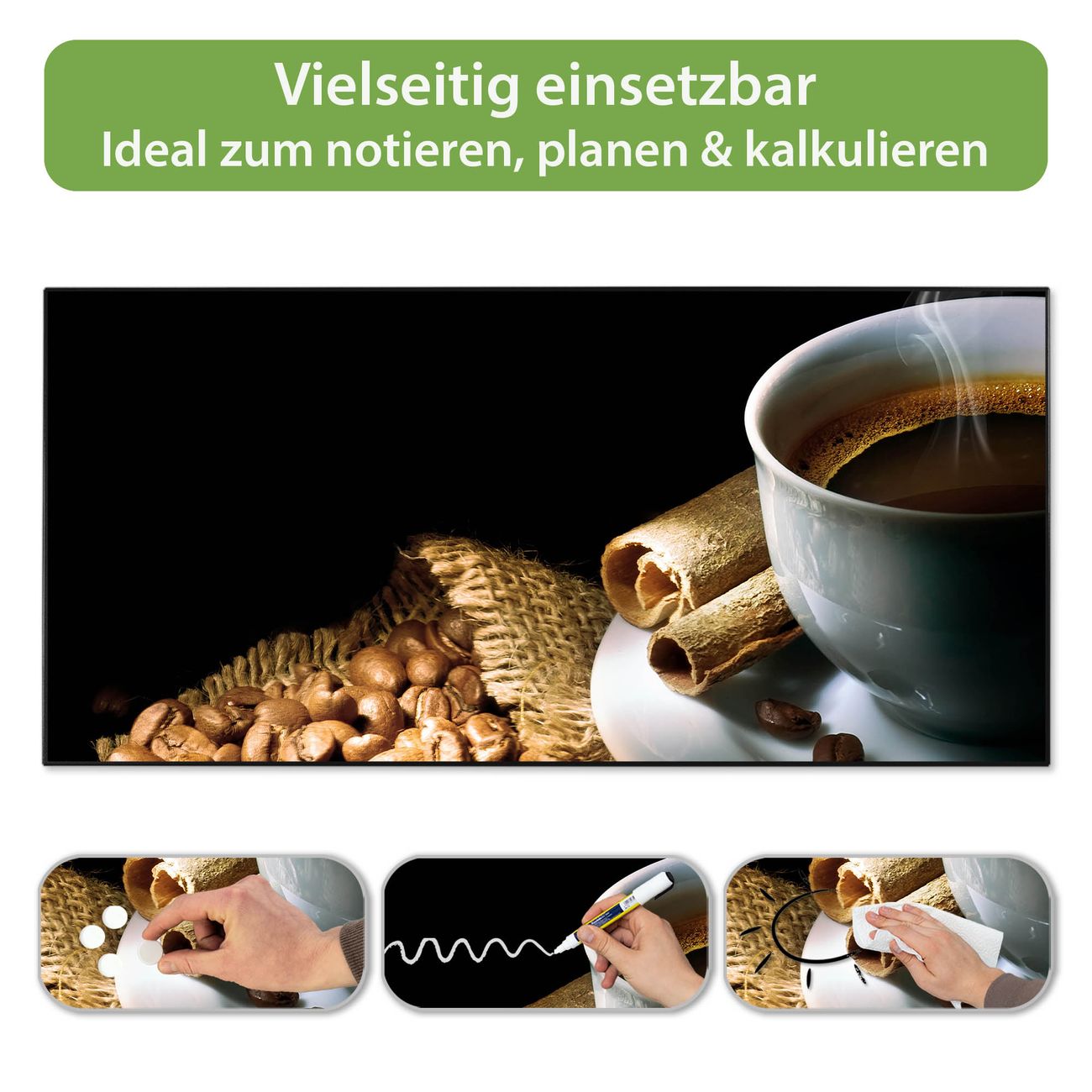 FUNKTION: Die banjado Magnettafel 78x37 cm im Design Motiv Hot Coffee vereint Funktionalität und modernes Wohndesign auf stilvolle Weise. Diese hochwertige Magnetwand aus Metall hilft Ihnen dabei, Notizen, Fotos, Termine, Einkaufslisten oder Rezepte übersichtlich zu organisieren. Als praktisches Memoboard sorgt sie für Struktur im Alltag und setzt gleichzeitig einen dekorativen Akzent an Ihrer Wand. DESIGN: Die Metalltafel besteht aus robustem, lackiertem Stahl und ist mit allen handelsüblichen Magneten nutzbar. Besonders praktisch ist die beschreibbare Oberfläche. Sie können die Magnettafel ganz einfach mit Kreidestiften beschriften und die Inhalte bei Bedarf mit einem feuchten Tuch wieder entfernen. So eignet sich das Memoboard ideal für Wochenpläne, Menüpläne, To Do Listen oder kreative Botschaften. DETAILS: Mit ihrem großzügigen Querformat von 78x37 cm bietet die Magnettafel ausreichend Platz für Ihre Organisation. Das Motiv Motiv Hot Coffee bringt eine warme, natürliche Optik in Küche, Flur, Büro oder Homeoffice und wirkt auch ohne Magnete oder Beschriftung wie ein modernes Wandbild. NUTZEN: Auf der Rückseite befinden sich vorgefertigte Löcher für eine schnelle und unkomplizierte Wandmontage. Jede banjado Magnettafel wird in Deutschland gefertigt und steht für Qualität, Langlebigkeit und liebevolle Verarbeitung. Dieses beschreibbare Memoboard ist die perfekte Kombination aus Metalltafel, Designobjekt und praktischer Magnetwand für Ihren Alltag. BANJADO: Wir sind ein kleines Team aus dem Herzen von Sachsen. Wir fertigen alle Artikel von Hand für Sie an, Sie erhalten keine preiswerte Importware. Auf Wunsch können Sie auch Ihr eigenes Foto auf die Magnettafel aufbringen, schreiben Sie uns an. Herzlichst, Ihr banjado-Team