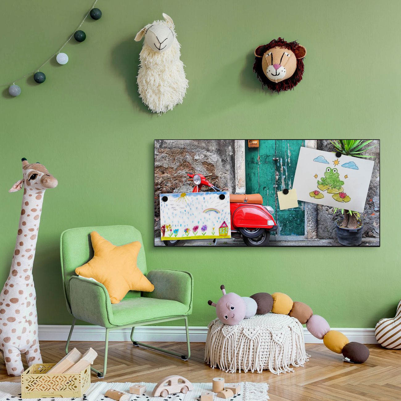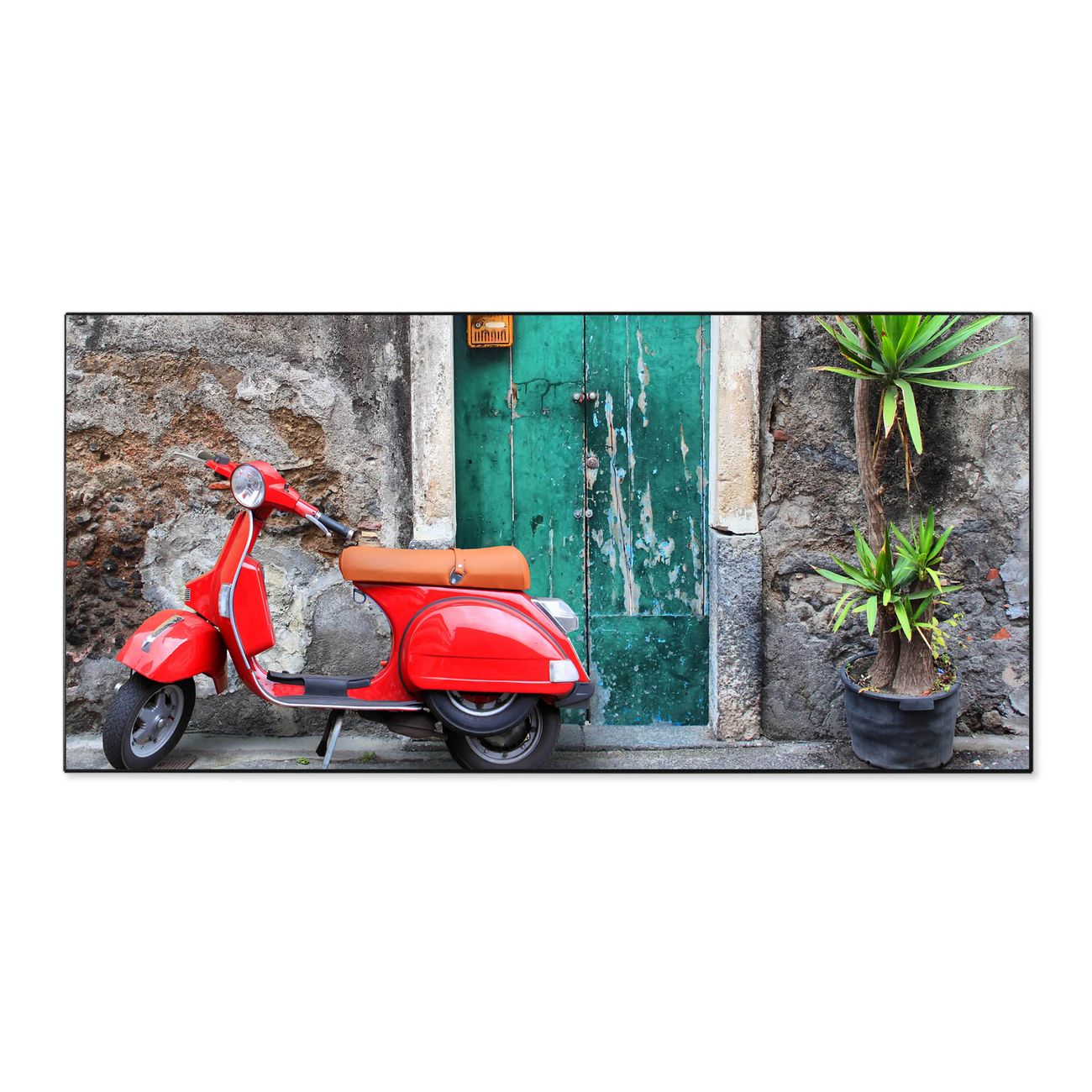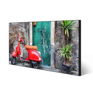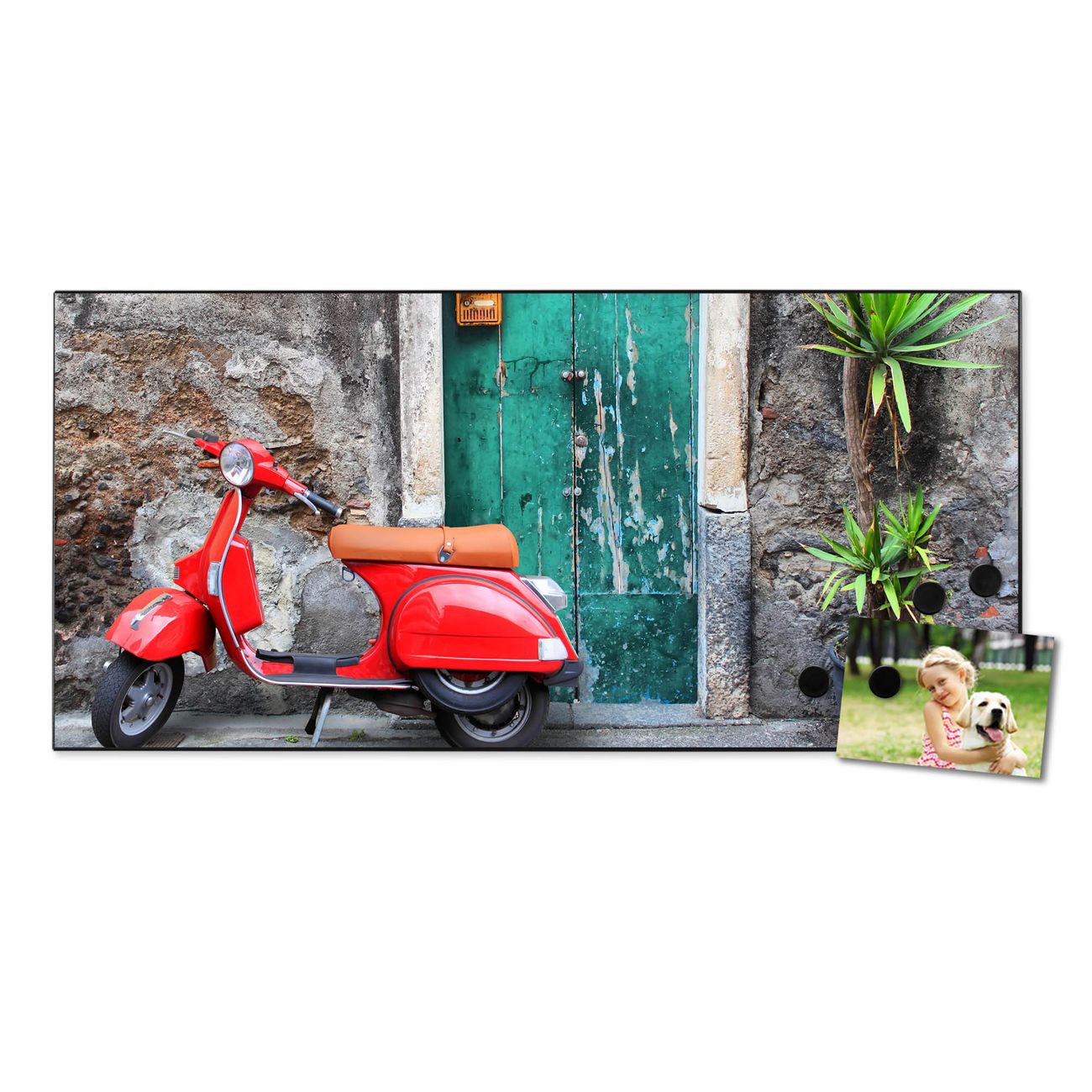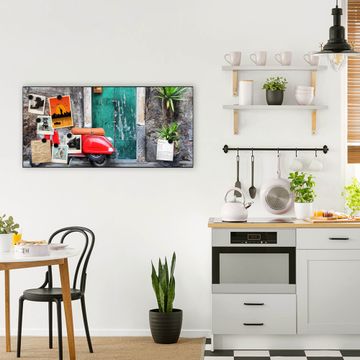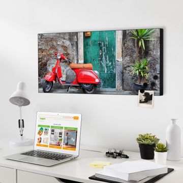 FUNKTION:  Die banjado Magnettafel mit Motiv Italienischer Roller Motiv bringt Ordnung in Ihr Zettelchaos. Fotos, Termine, Notizen oder Rezepte lassen Sich hier stilvoll mit Magneten ordnen, Sie behalten alles im Blick. An der Design Magnetwand halten alle handesüblichen Magnete. DESIGN:  Die Metall Pinnwand mit dem Motiv Motiv Italienischer Roller ist ein eleganter Begleiter im Alltag. Mit dieser Magnettafel haben Sie auch ohne Notizen und Magnete ein schönes Dekoelement. Das Format bietet Ihnen ausreichend Platz um alle wichtigen Informationen im Blick zu behalten. DETAILS: Die magnetische Pinnwand besteht aus silber-grau, weiß oder schwarz lackiertem Stahl. Sie hat eine Größe von 78cm x 37cm. Es befinden sich auf der Rückseite vorgefertigte Löcher die eine schnelle und unkomplizierte Anbringung ermöglichen. Das Motiv ist mit einem seidenmatten Laminat versehen und schützt so zusätzlich vor Kratzern. NUTZEN:  Sie können diese Magnettafel wunderbar als Wandbild nutzen, es halten alle handelsüblichen Magneten daran. Das Memoboard ist mit einem feuchten Lappen oder Schwamm abwischbar. Sie finden bei uns eine große Auswahl an passenden Magneten. BANJADO:  Wir sind ein kleines Team aus dem Herzen von Sachsen. Wir fertigen alle Artikel von Hand für Sie an, Sie erhalten keine preiswerte Importware. Auf Wunsch können Sie auch Ihr eigenes Foto auf die Magnettafel aufbringen, schreiben Sie uns an. Herzlichst, Ihr banjado-Team