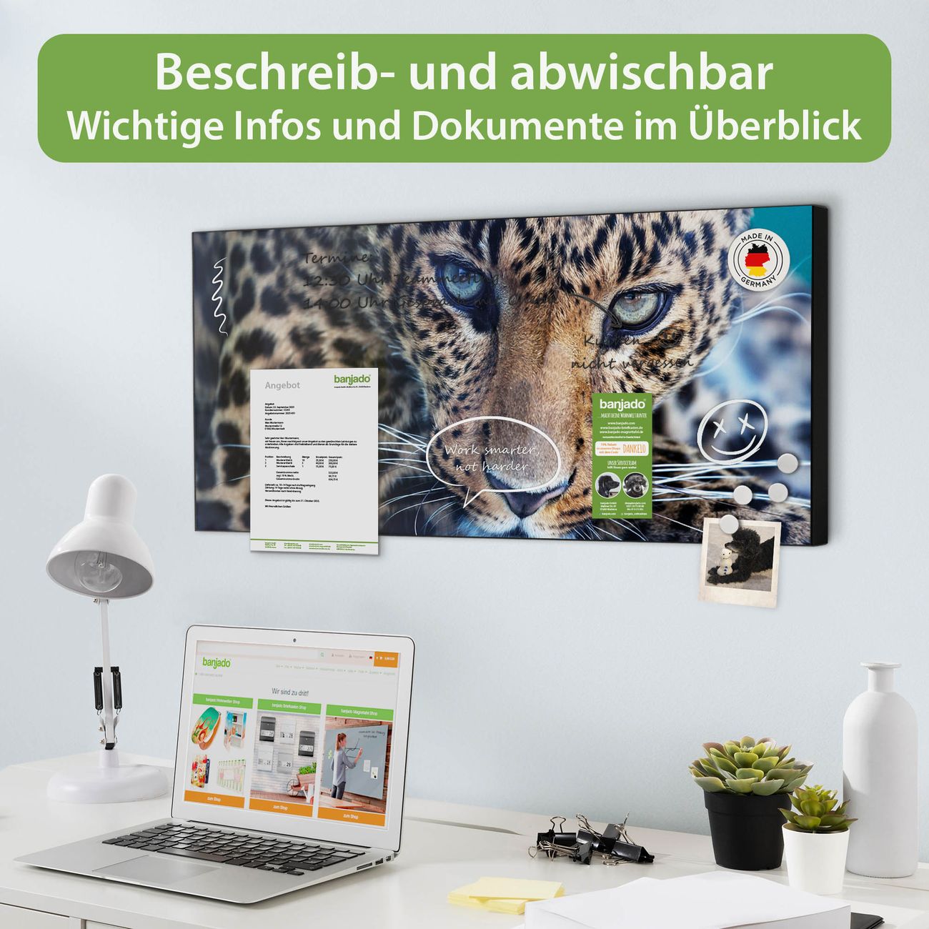 FUNKTION: Die banjado Magnettafel 78x37 cm im Design Motiv Jarmilla vereint Funktionalität und modernes Wohndesign auf stilvolle Weise. Diese hochwertige Magnetwand aus Metall hilft Ihnen dabei, Notizen, Fotos, Termine, Einkaufslisten oder Rezepte übersichtlich zu organisieren. Als praktisches Memoboard sorgt sie für Struktur im Alltag und setzt gleichzeitig einen dekorativen Akzent an Ihrer Wand. DESIGN: Die Metalltafel besteht aus robustem, lackiertem Stahl und ist mit allen handelsüblichen Magneten nutzbar. Besonders praktisch ist die beschreibbare Oberfläche. Sie können die Magnettafel ganz einfach mit Kreidestiften beschriften und die Inhalte bei Bedarf mit einem feuchten Tuch wieder entfernen. So eignet sich das Memoboard ideal für Wochenpläne, Menüpläne, To Do Listen oder kreative Botschaften. DETAILS: Mit ihrem großzügigen Querformat von 78x37 cm bietet die Magnettafel ausreichend Platz für Ihre Organisation. Das Motiv Motiv Jarmilla bringt eine warme, natürliche Optik in Küche, Flur, Büro oder Homeoffice und wirkt auch ohne Magnete oder Beschriftung wie ein modernes Wandbild. NUTZEN: Auf der Rückseite befinden sich vorgefertigte Löcher für eine schnelle und unkomplizierte Wandmontage. Jede banjado Magnettafel wird in Deutschland gefertigt und steht für Qualität, Langlebigkeit und liebevolle Verarbeitung. Dieses beschreibbare Memoboard ist die perfekte Kombination aus Metalltafel, Designobjekt und praktischer Magnetwand für Ihren Alltag. BANJADO: Wir sind ein kleines Team aus dem Herzen von Sachsen. Wir fertigen alle Artikel von Hand für Sie an, Sie erhalten keine preiswerte Importware. Auf Wunsch können Sie auch Ihr eigenes Foto auf die Magnettafel aufbringen, schreiben Sie uns an. Herzlichst, Ihr banjado-Team
