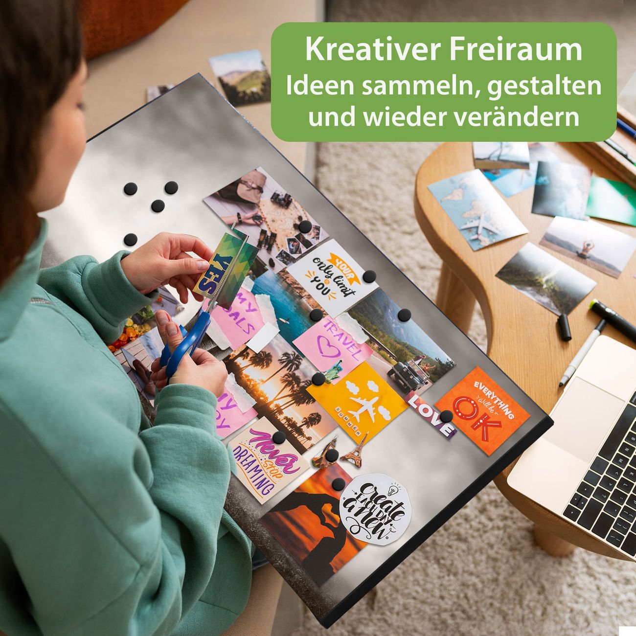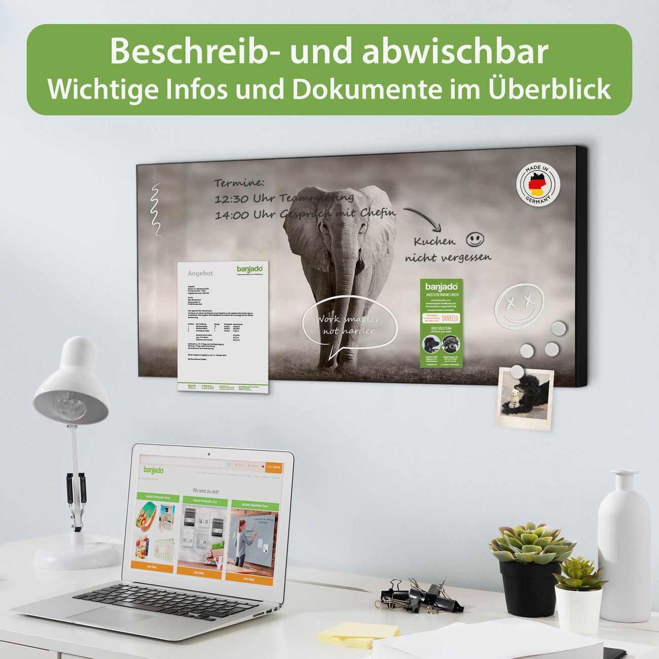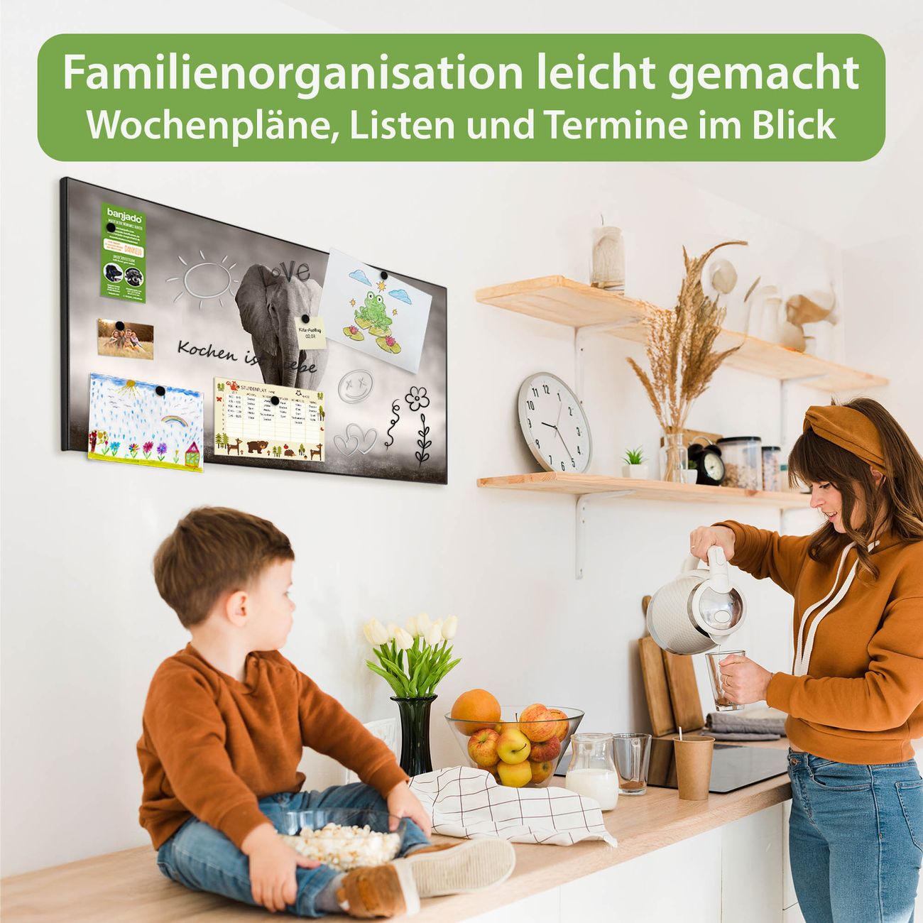 FUNKTION: Die banjado Magnettafel 78x37 cm im Design Motiv Joseline vereint Funktionalität und modernes Wohndesign auf stilvolle Weise. Diese hochwertige Magnetwand aus Metall hilft Ihnen dabei, Notizen, Fotos, Termine, Einkaufslisten oder Rezepte übersichtlich zu organisieren. Als praktisches Memoboard sorgt sie für Struktur im Alltag und setzt gleichzeitig einen dekorativen Akzent an Ihrer Wand. DESIGN: Die Metalltafel besteht aus robustem, lackiertem Stahl und ist mit allen handelsüblichen Magneten nutzbar. Besonders praktisch ist die beschreibbare Oberfläche. Sie können die Magnettafel ganz einfach mit Kreidestiften beschriften und die Inhalte bei Bedarf mit einem feuchten Tuch wieder entfernen. So eignet sich das Memoboard ideal für Wochenpläne, Menüpläne, To Do Listen oder kreative Botschaften. DETAILS: Mit ihrem großzügigen Querformat von 78x37 cm bietet die Magnettafel ausreichend Platz für Ihre Organisation. Das Motiv Motiv Joseline bringt eine warme, natürliche Optik in Küche, Flur, Büro oder Homeoffice und wirkt auch ohne Magnete oder Beschriftung wie ein modernes Wandbild. NUTZEN: Auf der Rückseite befinden sich vorgefertigte Löcher für eine schnelle und unkomplizierte Wandmontage. Jede banjado Magnettafel wird in Deutschland gefertigt und steht für Qualität, Langlebigkeit und liebevolle Verarbeitung. Dieses beschreibbare Memoboard ist die perfekte Kombination aus Metalltafel, Designobjekt und praktischer Magnetwand für Ihren Alltag. BANJADO: Wir sind ein kleines Team aus dem Herzen von Sachsen. Wir fertigen alle Artikel von Hand für Sie an, Sie erhalten keine preiswerte Importware. Auf Wunsch können Sie auch Ihr eigenes Foto auf die Magnettafel aufbringen, schreiben Sie uns an. Herzlichst, Ihr banjado-Team