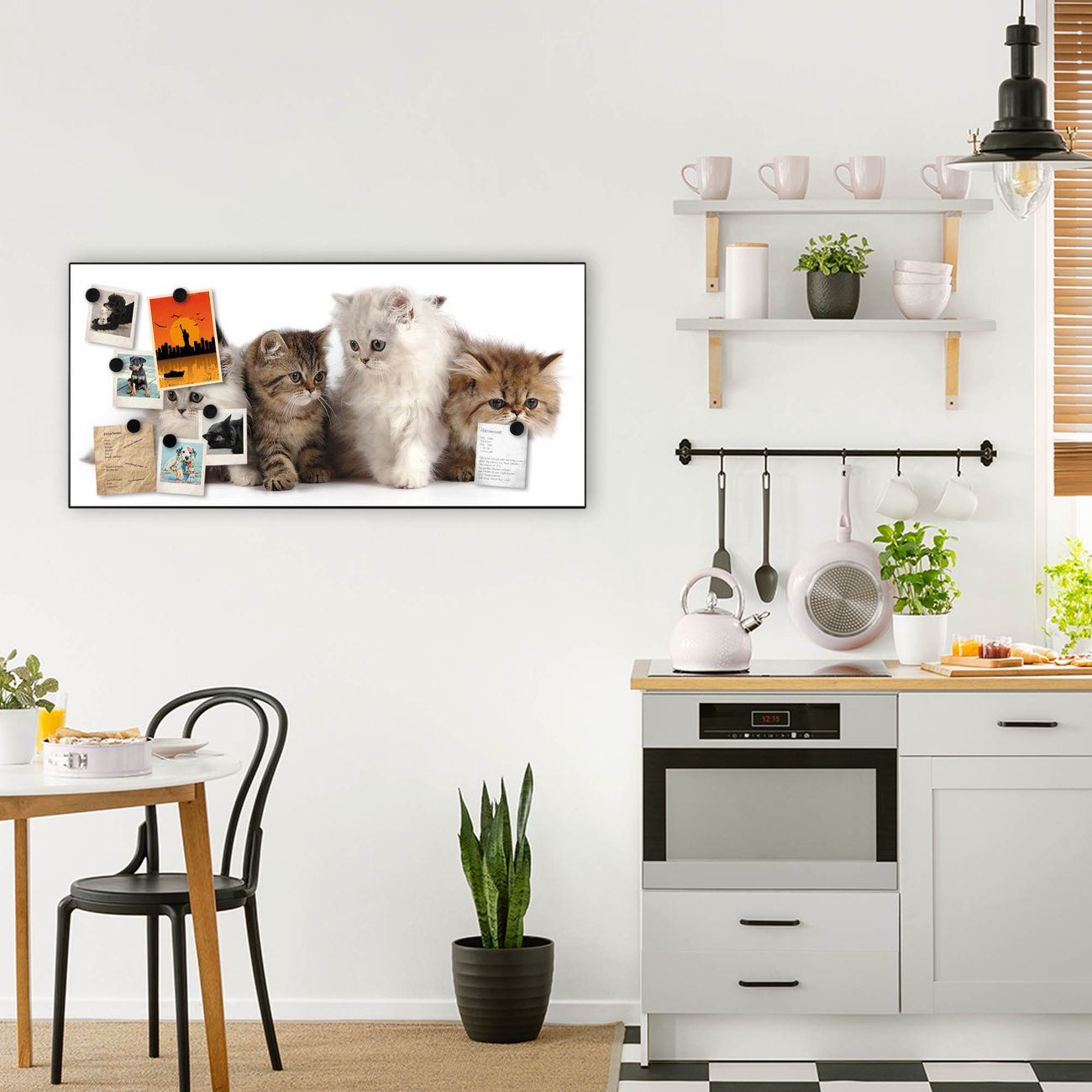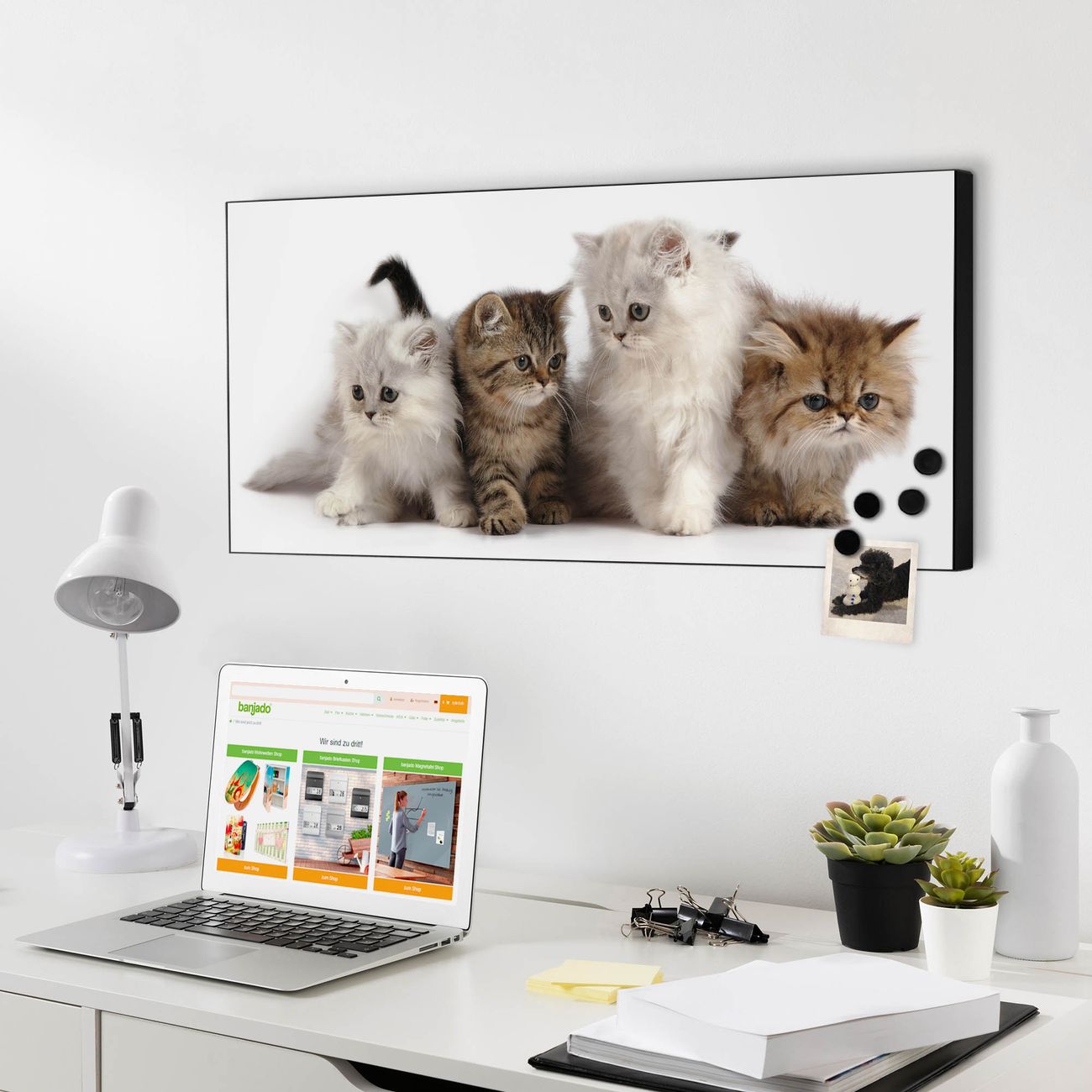 FUNKTION:  Die banjado Magnettafel mit Motiv Kaetzchen Motiv bringt Ordnung in Ihr Zettelchaos. Fotos, Termine, Notizen oder Rezepte lassen Sich hier stilvoll mit Magneten ordnen, Sie behalten alles im Blick. An der Design Magnetwand halten alle handesüblichen Magnete. DESIGN:  Die Metall Pinnwand mit dem Motiv Motiv Kaetzchen ist ein eleganter Begleiter im Alltag. Mit dieser Magnettafel haben Sie auch ohne Notizen und Magnete ein schönes Dekoelement. Das Format bietet Ihnen ausreichend Platz um alle wichtigen Informationen im Blick zu behalten. DETAILS: Die magnetische Pinnwand besteht aus silber-grau, weiß oder schwarz lackiertem Stahl. Sie hat eine Größe von 78cm x 37cm. Es befinden sich auf der Rückseite vorgefertigte Löcher die eine schnelle und unkomplizierte Anbringung ermöglichen. Das Motiv ist mit einem seidenmatten Laminat versehen und schützt so zusätzlich vor Kratzern. NUTZEN:  Sie können diese Magnettafel wunderbar als Wandbild nutzen, es halten alle handelsüblichen Magneten daran. Das Memoboard ist mit einem feuchten Lappen oder Schwamm abwischbar. Sie finden bei uns eine große Auswahl an passenden Magneten. BANJADO:  Wir sind ein kleines Team aus dem Herzen von Sachsen. Wir fertigen alle Artikel von Hand für Sie an, Sie erhalten keine preiswerte Importware. Auf Wunsch können Sie auch Ihr eigenes Foto auf die Magnettafel aufbringen, schreiben Sie uns an. Herzlichst, Ihr banjado-Team