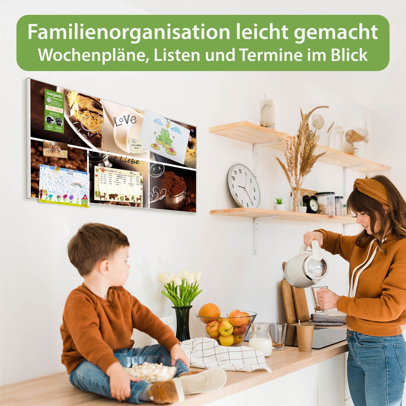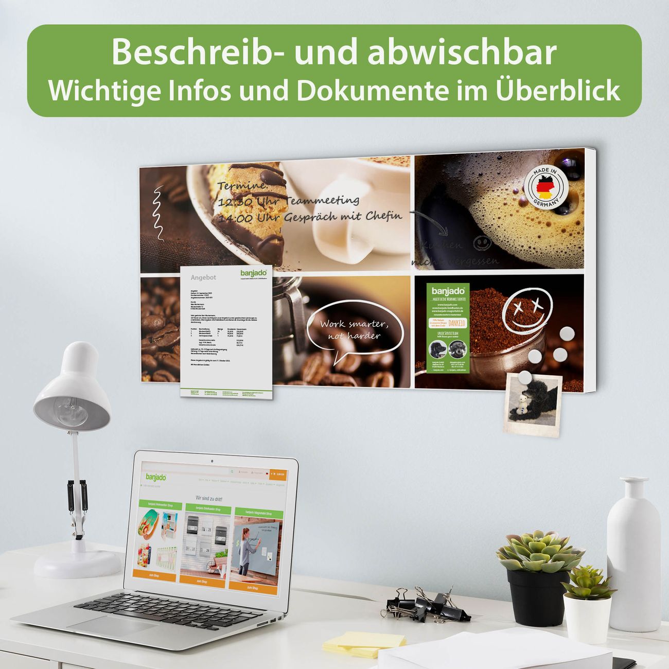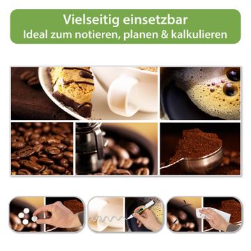 FUNKTION: Die banjado Magnettafel 78x37 cm im Design Motiv Kaffee&Schokolade vereint Funktionalität und modernes Wohndesign auf stilvolle Weise. Diese hochwertige Magnetwand aus Metall hilft Ihnen dabei, Notizen, Fotos, Termine, Einkaufslisten oder Rezepte übersichtlich zu organisieren. Als praktisches Memoboard sorgt sie für Struktur im Alltag und setzt gleichzeitig einen dekorativen Akzent an Ihrer Wand. DESIGN: Die Metalltafel besteht aus robustem, lackiertem Stahl und ist mit allen handelsüblichen Magneten nutzbar. Besonders praktisch ist die beschreibbare Oberfläche. Sie können die Magnettafel ganz einfach mit Kreidestiften beschriften und die Inhalte bei Bedarf mit einem feuchten Tuch wieder entfernen. So eignet sich das Memoboard ideal für Wochenpläne, Menüpläne, To Do Listen oder kreative Botschaften. DETAILS: Mit ihrem großzügigen Querformat von 78x37 cm bietet die Magnettafel ausreichend Platz für Ihre Organisation. Das Motiv Motiv Kaffee&Schokolade bringt eine warme, natürliche Optik in Küche, Flur, Büro oder Homeoffice und wirkt auch ohne Magnete oder Beschriftung wie ein modernes Wandbild. NUTZEN: Auf der Rückseite befinden sich vorgefertigte Löcher für eine schnelle und unkomplizierte Wandmontage. Jede banjado Magnettafel wird in Deutschland gefertigt und steht für Qualität, Langlebigkeit und liebevolle Verarbeitung. Dieses beschreibbare Memoboard ist die perfekte Kombination aus Metalltafel, Designobjekt und praktischer Magnetwand für Ihren Alltag. BANJADO: Wir sind ein kleines Team aus dem Herzen von Sachsen. Wir fertigen alle Artikel von Hand für Sie an, Sie erhalten keine preiswerte Importware. Auf Wunsch können Sie auch Ihr eigenes Foto auf die Magnettafel aufbringen, schreiben Sie uns an. Herzlichst, Ihr banjado-Team