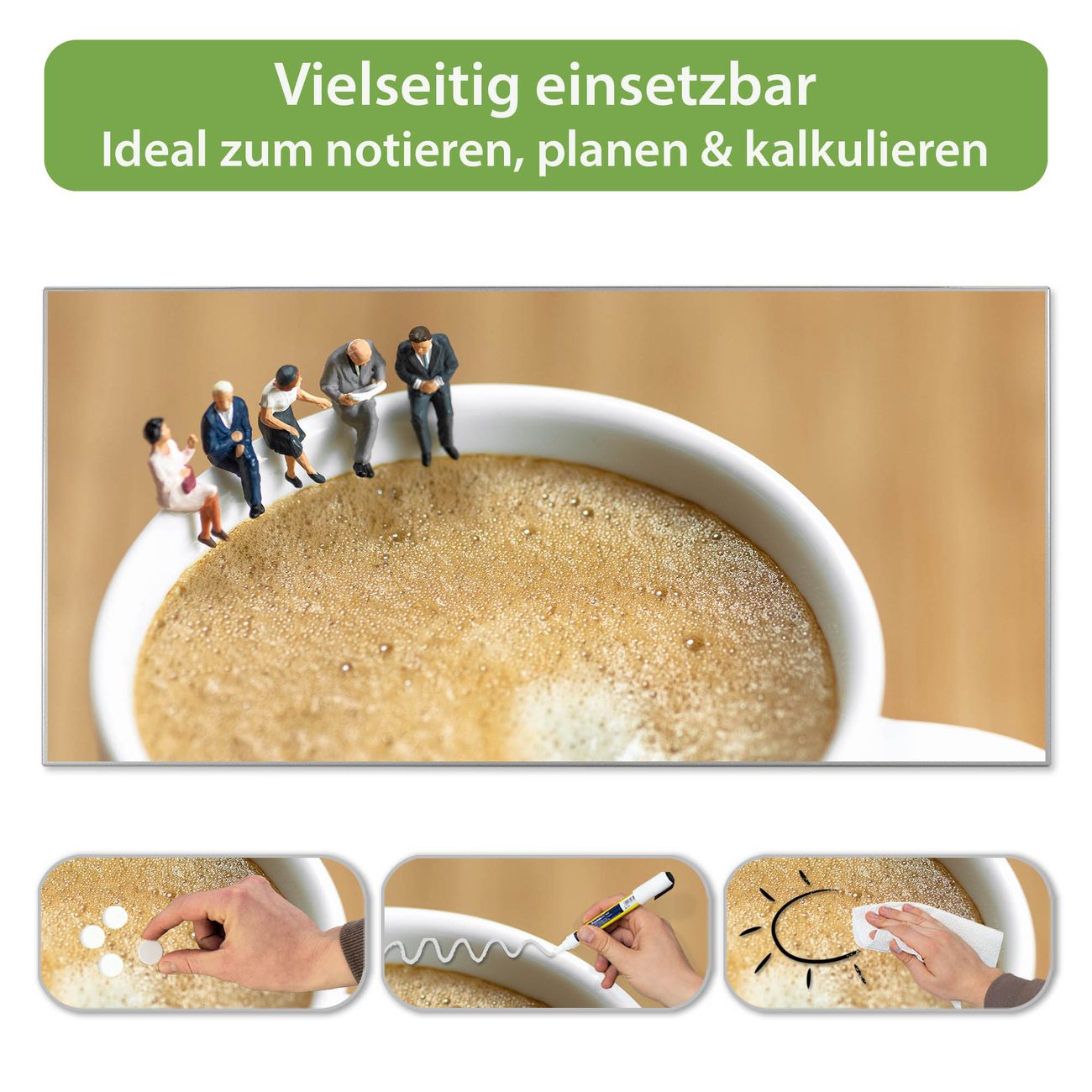 FUNKTION: Die banjado Magnettafel 78x37 cm im Design Motiv Kaffeepause vereint Funktionalität und modernes Wohndesign auf stilvolle Weise. Diese hochwertige Magnetwand aus Metall hilft Ihnen dabei, Notizen, Fotos, Termine, Einkaufslisten oder Rezepte übersichtlich zu organisieren. Als praktisches Memoboard sorgt sie für Struktur im Alltag und setzt gleichzeitig einen dekorativen Akzent an Ihrer Wand. DESIGN: Die Metalltafel besteht aus robustem, lackiertem Stahl und ist mit allen handelsüblichen Magneten nutzbar. Besonders praktisch ist die beschreibbare Oberfläche. Sie können die Magnettafel ganz einfach mit Kreidestiften beschriften und die Inhalte bei Bedarf mit einem feuchten Tuch wieder entfernen. So eignet sich das Memoboard ideal für Wochenpläne, Menüpläne, To Do Listen oder kreative Botschaften. DETAILS: Mit ihrem großzügigen Querformat von 78x37 cm bietet die Magnettafel ausreichend Platz für Ihre Organisation. Das Motiv Motiv Kaffeepause bringt eine warme, natürliche Optik in Küche, Flur, Büro oder Homeoffice und wirkt auch ohne Magnete oder Beschriftung wie ein modernes Wandbild. NUTZEN: Auf der Rückseite befinden sich vorgefertigte Löcher für eine schnelle und unkomplizierte Wandmontage. Jede banjado Magnettafel wird in Deutschland gefertigt und steht für Qualität, Langlebigkeit und liebevolle Verarbeitung. Dieses beschreibbare Memoboard ist die perfekte Kombination aus Metalltafel, Designobjekt und praktischer Magnetwand für Ihren Alltag. BANJADO: Wir sind ein kleines Team aus dem Herzen von Sachsen. Wir fertigen alle Artikel von Hand für Sie an, Sie erhalten keine preiswerte Importware. Auf Wunsch können Sie auch Ihr eigenes Foto auf die Magnettafel aufbringen, schreiben Sie uns an. Herzlichst, Ihr banjado-Team