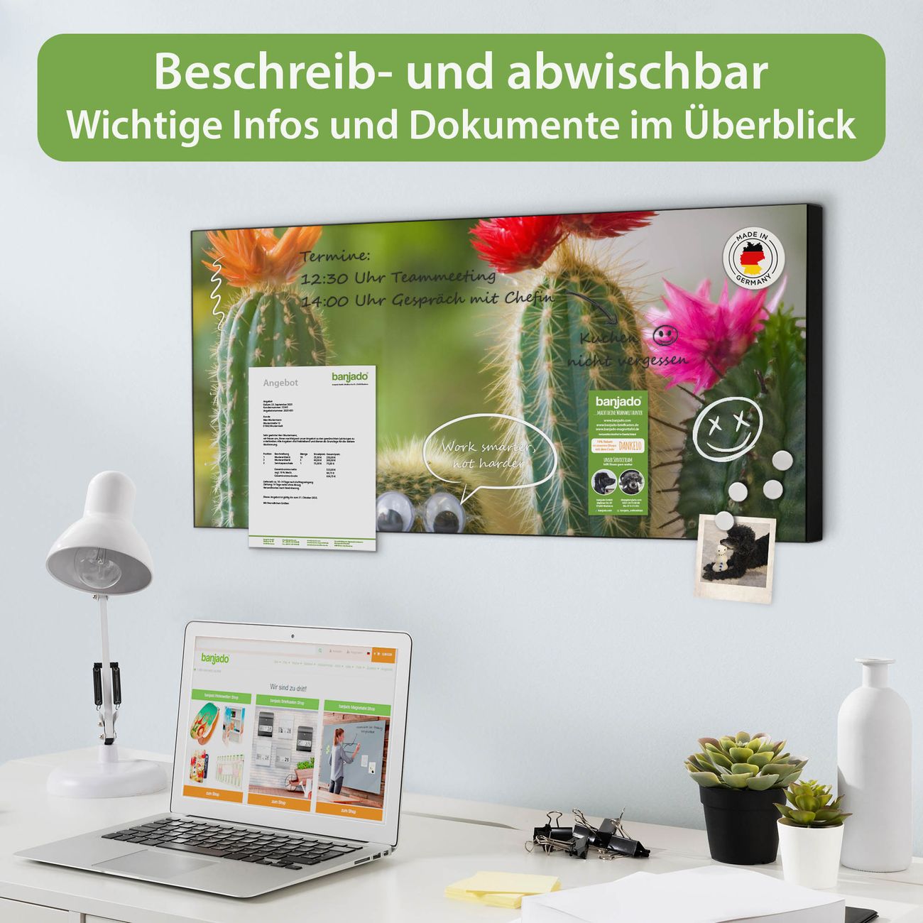 FUNKTION: Die banjado Magnettafel 78x37 cm im Design Motiv Kakteen vereint Funktionalität und modernes Wohndesign auf stilvolle Weise. Diese hochwertige Magnetwand aus Metall hilft Ihnen dabei, Notizen, Fotos, Termine, Einkaufslisten oder Rezepte übersichtlich zu organisieren. Als praktisches Memoboard sorgt sie für Struktur im Alltag und setzt gleichzeitig einen dekorativen Akzent an Ihrer Wand. DESIGN: Die Metalltafel besteht aus robustem, lackiertem Stahl und ist mit allen handelsüblichen Magneten nutzbar. Besonders praktisch ist die beschreibbare Oberfläche. Sie können die Magnettafel ganz einfach mit Kreidestiften beschriften und die Inhalte bei Bedarf mit einem feuchten Tuch wieder entfernen. So eignet sich das Memoboard ideal für Wochenpläne, Menüpläne, To Do Listen oder kreative Botschaften. DETAILS: Mit ihrem großzügigen Querformat von 78x37 cm bietet die Magnettafel ausreichend Platz für Ihre Organisation. Das Motiv Motiv Kakteen bringt eine warme, natürliche Optik in Küche, Flur, Büro oder Homeoffice und wirkt auch ohne Magnete oder Beschriftung wie ein modernes Wandbild. NUTZEN: Auf der Rückseite befinden sich vorgefertigte Löcher für eine schnelle und unkomplizierte Wandmontage. Jede banjado Magnettafel wird in Deutschland gefertigt und steht für Qualität, Langlebigkeit und liebevolle Verarbeitung. Dieses beschreibbare Memoboard ist die perfekte Kombination aus Metalltafel, Designobjekt und praktischer Magnetwand für Ihren Alltag. BANJADO: Wir sind ein kleines Team aus dem Herzen von Sachsen. Wir fertigen alle Artikel von Hand für Sie an, Sie erhalten keine preiswerte Importware. Auf Wunsch können Sie auch Ihr eigenes Foto auf die Magnettafel aufbringen, schreiben Sie uns an. Herzlichst, Ihr banjado-Team