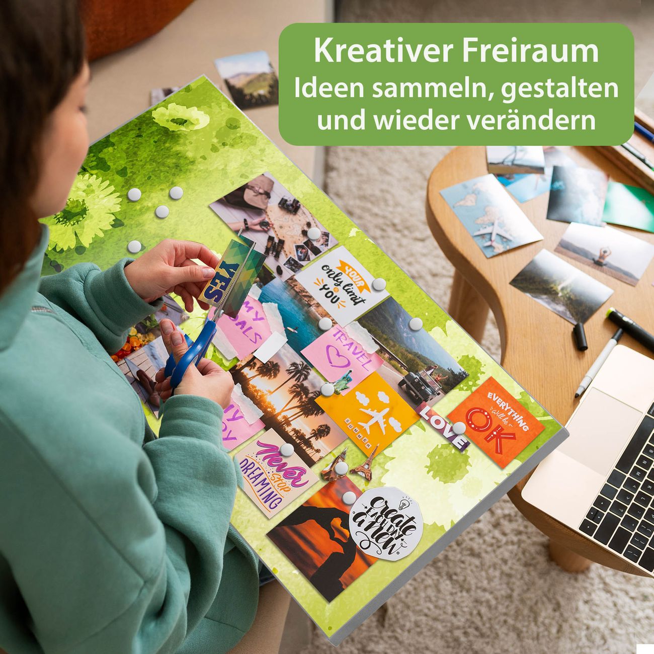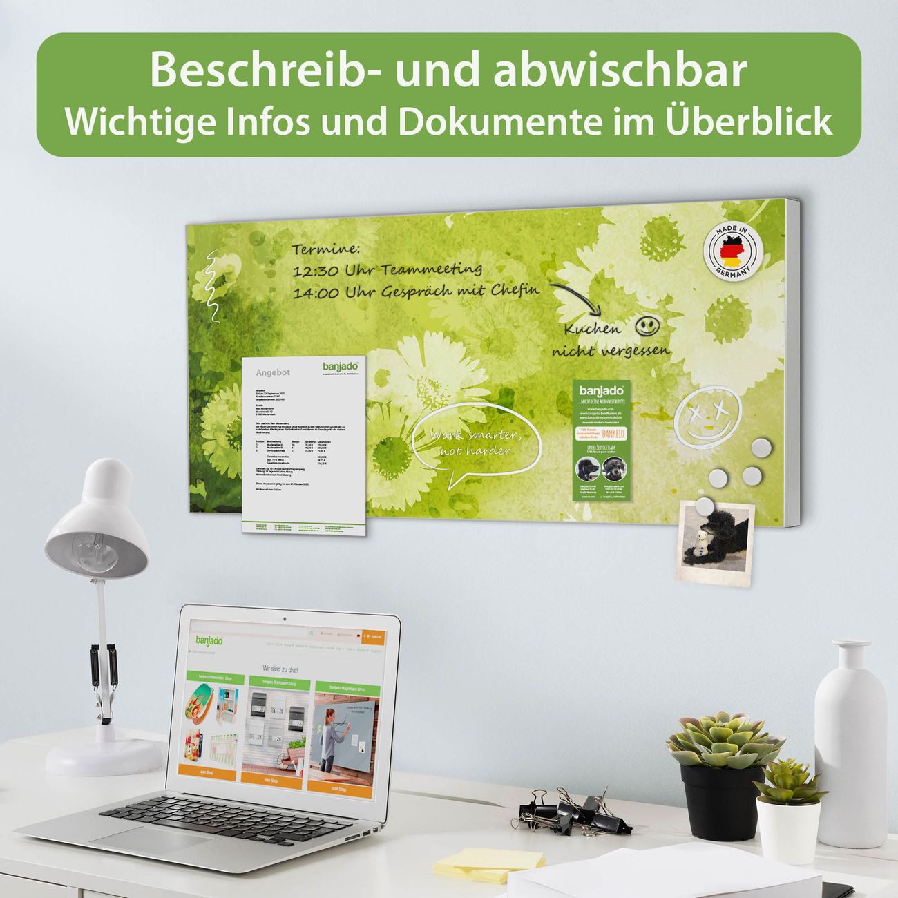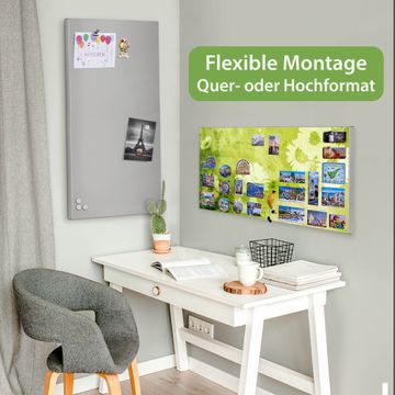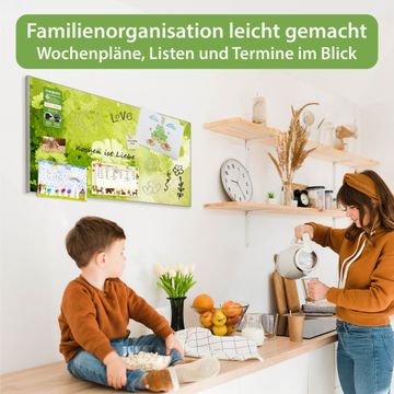 FUNKTION: Die banjado Magnettafel 78x37 cm im Design Motiv Kamille Grün vereint Funktionalität und modernes Wohndesign auf stilvolle Weise. Diese hochwertige Magnetwand aus Metall hilft Ihnen dabei, Notizen, Fotos, Termine, Einkaufslisten oder Rezepte übersichtlich zu organisieren. Als praktisches Memoboard sorgt sie für Struktur im Alltag und setzt gleichzeitig einen dekorativen Akzent an Ihrer Wand. DESIGN: Die Metalltafel besteht aus robustem, lackiertem Stahl und ist mit allen handelsüblichen Magneten nutzbar. Besonders praktisch ist die beschreibbare Oberfläche. Sie können die Magnettafel ganz einfach mit Kreidestiften beschriften und die Inhalte bei Bedarf mit einem feuchten Tuch wieder entfernen. So eignet sich das Memoboard ideal für Wochenpläne, Menüpläne, To Do Listen oder kreative Botschaften. DETAILS: Mit ihrem großzügigen Querformat von 78x37 cm bietet die Magnettafel ausreichend Platz für Ihre Organisation. Das Motiv Motiv Kamille Grün bringt eine warme, natürliche Optik in Küche, Flur, Büro oder Homeoffice und wirkt auch ohne Magnete oder Beschriftung wie ein modernes Wandbild. NUTZEN: Auf der Rückseite befinden sich vorgefertigte Löcher für eine schnelle und unkomplizierte Wandmontage. Jede banjado Magnettafel wird in Deutschland gefertigt und steht für Qualität, Langlebigkeit und liebevolle Verarbeitung. Dieses beschreibbare Memoboard ist die perfekte Kombination aus Metalltafel, Designobjekt und praktischer Magnetwand für Ihren Alltag. BANJADO: Wir sind ein kleines Team aus dem Herzen von Sachsen. Wir fertigen alle Artikel von Hand für Sie an, Sie erhalten keine preiswerte Importware. Auf Wunsch können Sie auch Ihr eigenes Foto auf die Magnettafel aufbringen, schreiben Sie uns an. Herzlichst, Ihr banjado-Team