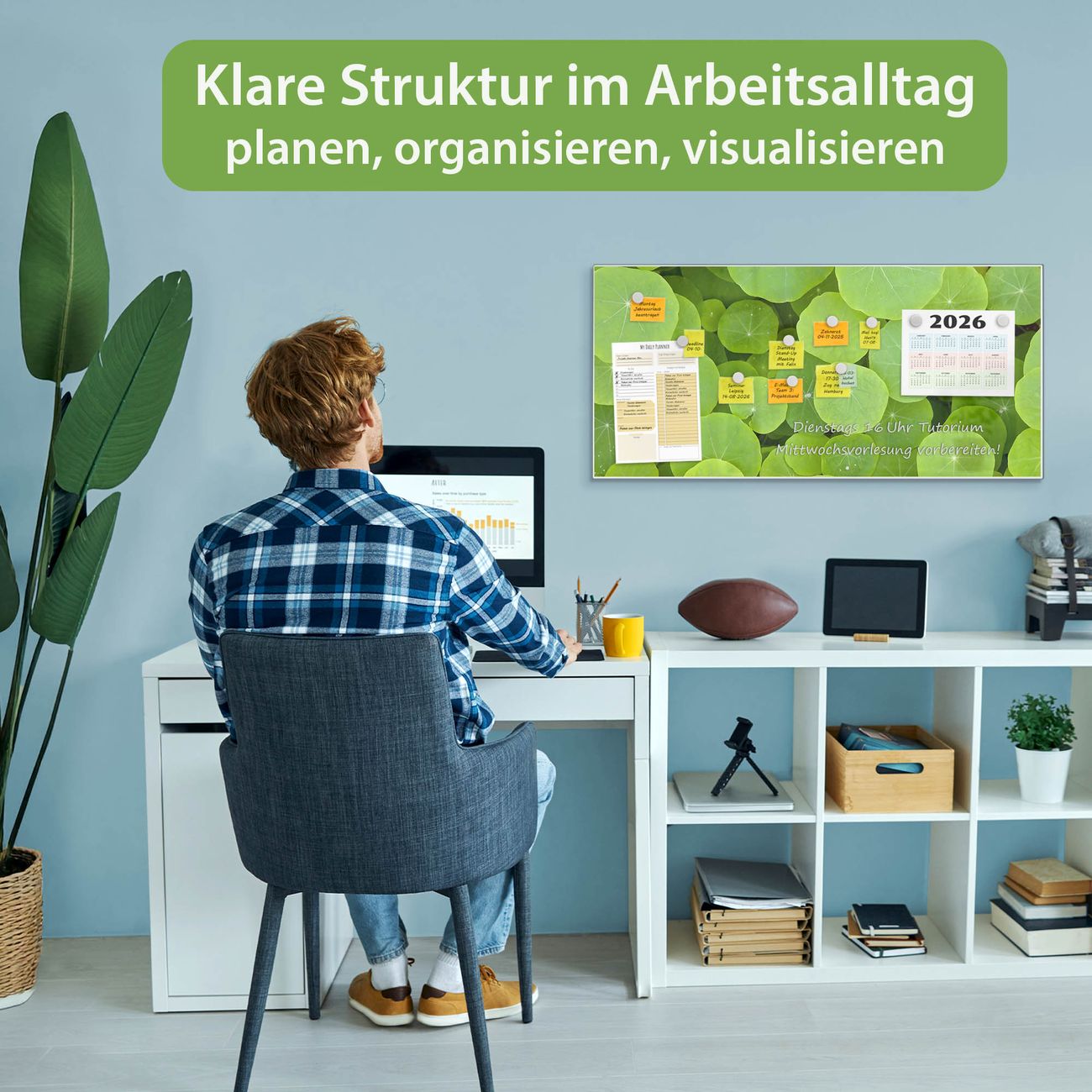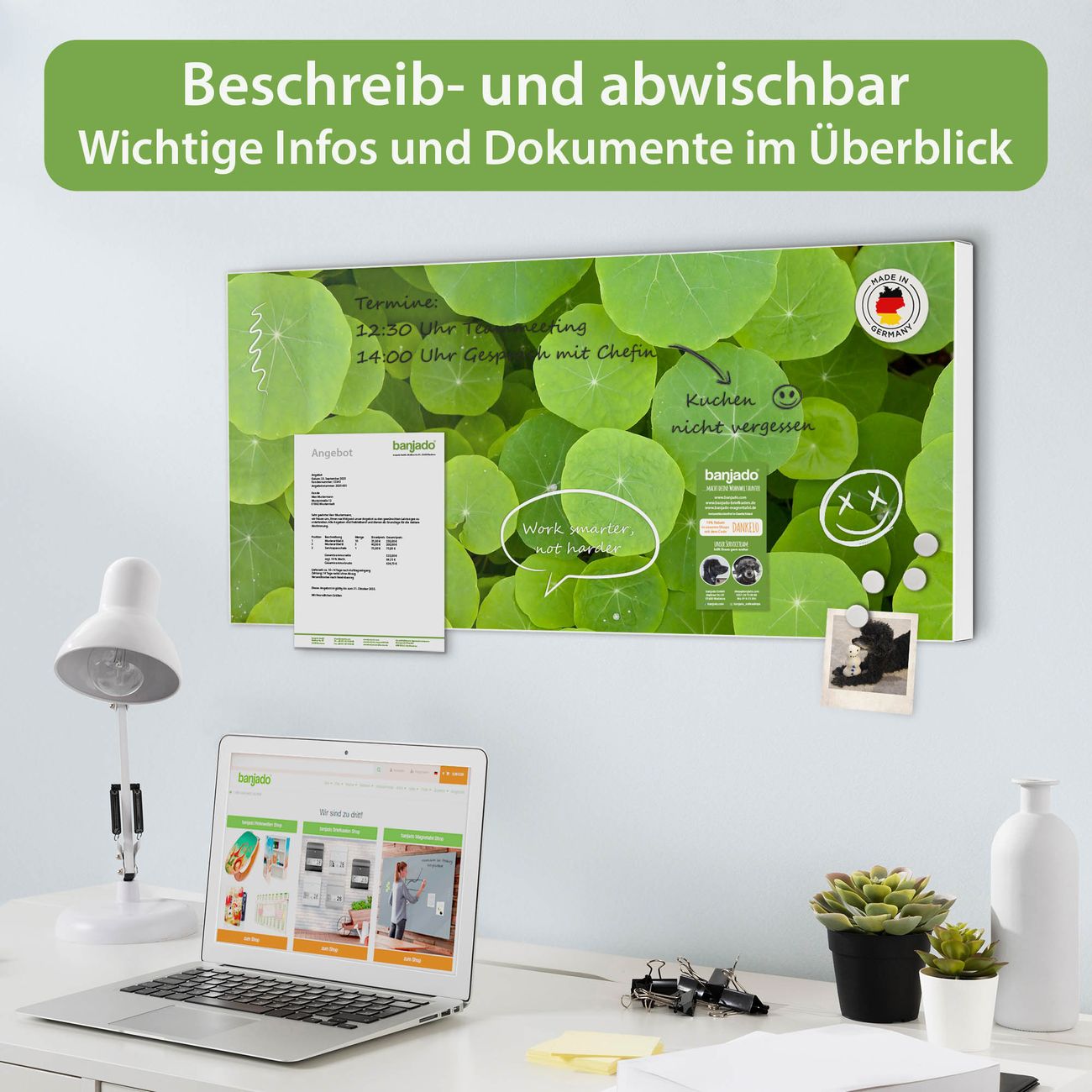 FUNKTION: Die banjado Magnettafel 78x37 cm im Design Motiv Kapuzinerkresse vereint Funktionalität und modernes Wohndesign auf stilvolle Weise. Diese hochwertige Magnetwand aus Metall hilft Ihnen dabei, Notizen, Fotos, Termine, Einkaufslisten oder Rezepte übersichtlich zu organisieren. Als praktisches Memoboard sorgt sie für Struktur im Alltag und setzt gleichzeitig einen dekorativen Akzent an Ihrer Wand. DESIGN: Die Metalltafel besteht aus robustem, lackiertem Stahl und ist mit allen handelsüblichen Magneten nutzbar. Besonders praktisch ist die beschreibbare Oberfläche. Sie können die Magnettafel ganz einfach mit Kreidestiften beschriften und die Inhalte bei Bedarf mit einem feuchten Tuch wieder entfernen. So eignet sich das Memoboard ideal für Wochenpläne, Menüpläne, To Do Listen oder kreative Botschaften. DETAILS: Mit ihrem großzügigen Querformat von 78x37 cm bietet die Magnettafel ausreichend Platz für Ihre Organisation. Das Motiv Motiv Kapuzinerkresse bringt eine warme, natürliche Optik in Küche, Flur, Büro oder Homeoffice und wirkt auch ohne Magnete oder Beschriftung wie ein modernes Wandbild. NUTZEN: Auf der Rückseite befinden sich vorgefertigte Löcher für eine schnelle und unkomplizierte Wandmontage. Jede banjado Magnettafel wird in Deutschland gefertigt und steht für Qualität, Langlebigkeit und liebevolle Verarbeitung. Dieses beschreibbare Memoboard ist die perfekte Kombination aus Metalltafel, Designobjekt und praktischer Magnetwand für Ihren Alltag. BANJADO: Wir sind ein kleines Team aus dem Herzen von Sachsen. Wir fertigen alle Artikel von Hand für Sie an, Sie erhalten keine preiswerte Importware. Auf Wunsch können Sie auch Ihr eigenes Foto auf die Magnettafel aufbringen, schreiben Sie uns an. Herzlichst, Ihr banjado-Team