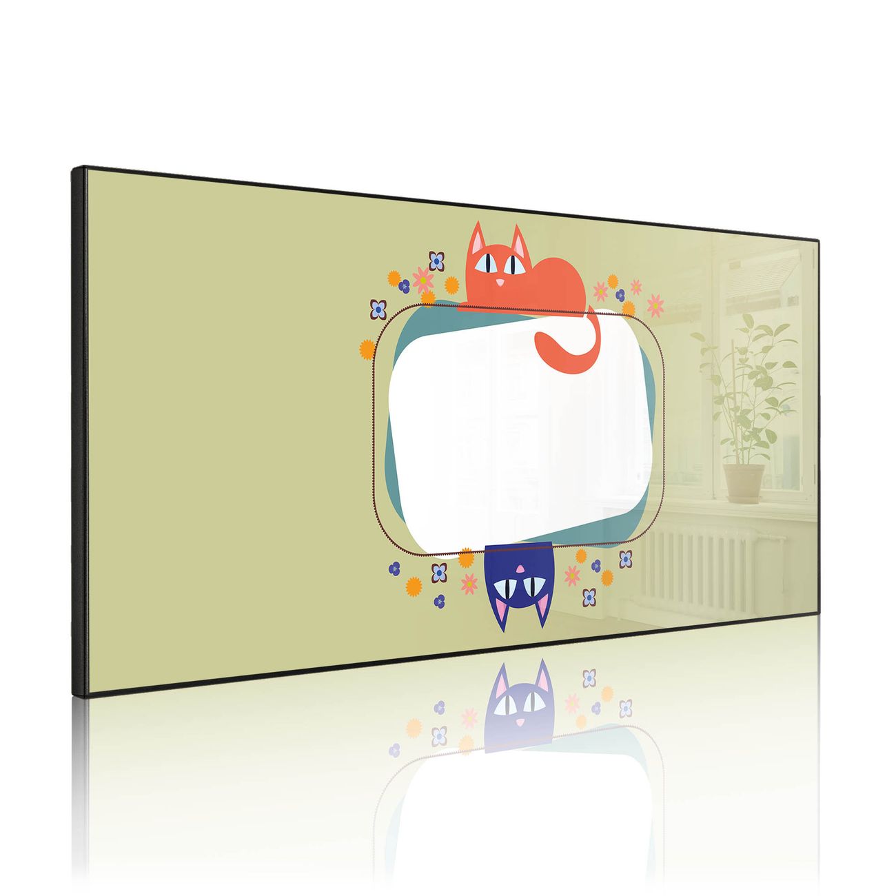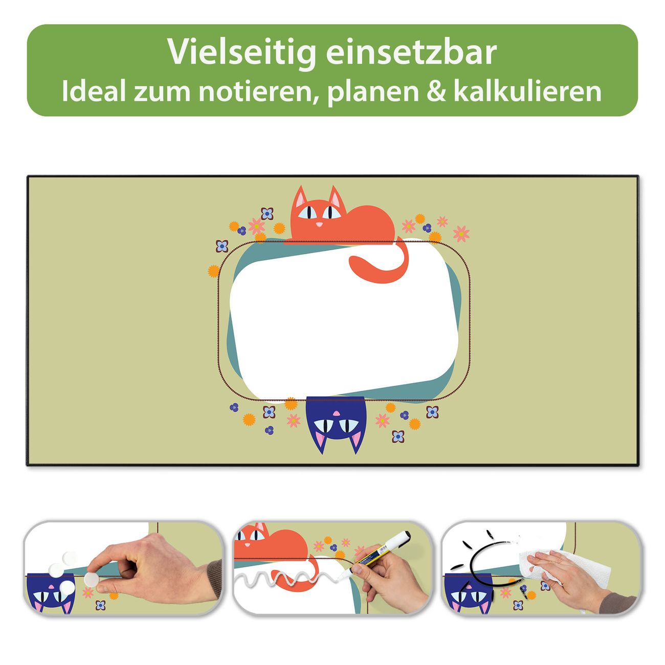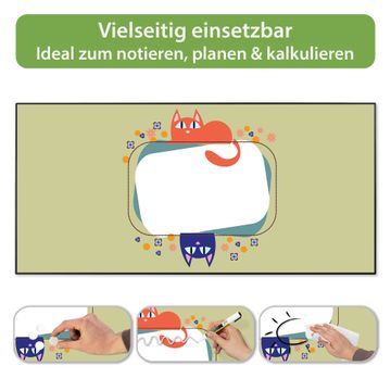 FUNKTION: Die banjado Magnettafel 78x37 cm im Design Motiv Karikatur Katzen vereint Funktionalität und modernes Wohndesign auf stilvolle Weise. Diese hochwertige Magnetwand aus Metall hilft Ihnen dabei, Notizen, Fotos, Termine, Einkaufslisten oder Rezepte übersichtlich zu organisieren. Als praktisches Memoboard sorgt sie für Struktur im Alltag und setzt gleichzeitig einen dekorativen Akzent an Ihrer Wand. DESIGN: Die Metalltafel besteht aus robustem, lackiertem Stahl und ist mit allen handelsüblichen Magneten nutzbar. Besonders praktisch ist die beschreibbare Oberfläche. Sie können die Magnettafel ganz einfach mit Kreidestiften beschriften und die Inhalte bei Bedarf mit einem feuchten Tuch wieder entfernen. So eignet sich das Memoboard ideal für Wochenpläne, Menüpläne, To Do Listen oder kreative Botschaften. DETAILS: Mit ihrem großzügigen Querformat von 78x37 cm bietet die Magnettafel ausreichend Platz für Ihre Organisation. Das Motiv Motiv Karikatur Katzen bringt eine warme, natürliche Optik in Küche, Flur, Büro oder Homeoffice und wirkt auch ohne Magnete oder Beschriftung wie ein modernes Wandbild. NUTZEN: Auf der Rückseite befinden sich vorgefertigte Löcher für eine schnelle und unkomplizierte Wandmontage. Jede banjado Magnettafel wird in Deutschland gefertigt und steht für Qualität, Langlebigkeit und liebevolle Verarbeitung. Dieses beschreibbare Memoboard ist die perfekte Kombination aus Metalltafel, Designobjekt und praktischer Magnetwand für Ihren Alltag. BANJADO: Wir sind ein kleines Team aus dem Herzen von Sachsen. Wir fertigen alle Artikel von Hand für Sie an, Sie erhalten keine preiswerte Importware. Auf Wunsch können Sie auch Ihr eigenes Foto auf die Magnettafel aufbringen, schreiben Sie uns an. Herzlichst, Ihr banjado-Team