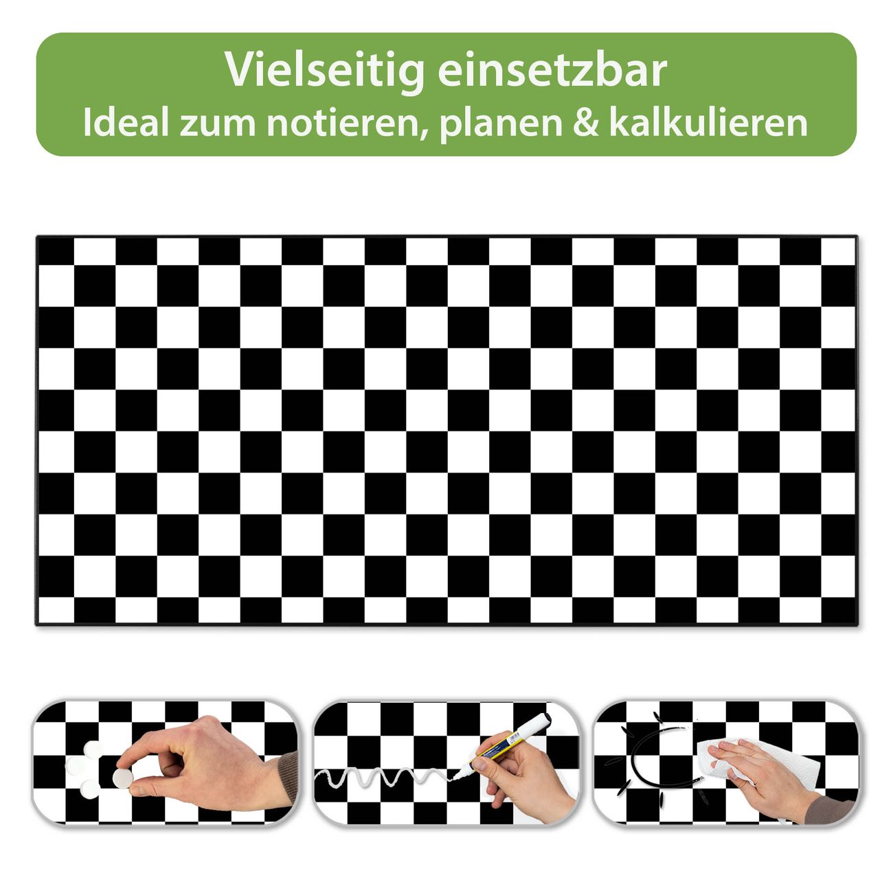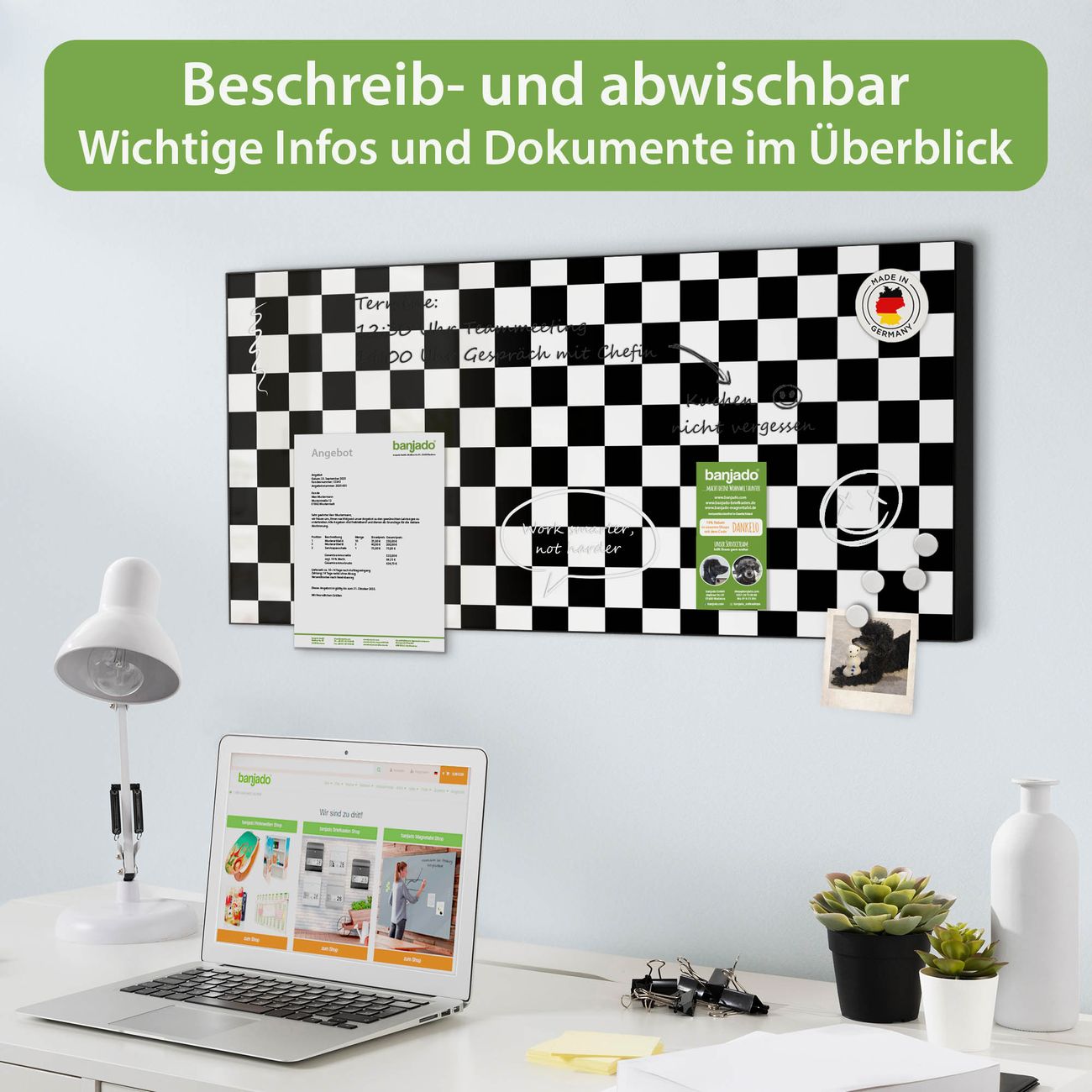 FUNKTION: Die banjado Magnettafel 78x37 cm im Design Motiv Karo Schwarz vereint Funktionalität und modernes Wohndesign auf stilvolle Weise. Diese hochwertige Magnetwand aus Metall hilft Ihnen dabei, Notizen, Fotos, Termine, Einkaufslisten oder Rezepte übersichtlich zu organisieren. Als praktisches Memoboard sorgt sie für Struktur im Alltag und setzt gleichzeitig einen dekorativen Akzent an Ihrer Wand. DESIGN: Die Metalltafel besteht aus robustem, lackiertem Stahl und ist mit allen handelsüblichen Magneten nutzbar. Besonders praktisch ist die beschreibbare Oberfläche. Sie können die Magnettafel ganz einfach mit Kreidestiften beschriften und die Inhalte bei Bedarf mit einem feuchten Tuch wieder entfernen. So eignet sich das Memoboard ideal für Wochenpläne, Menüpläne, To Do Listen oder kreative Botschaften. DETAILS: Mit ihrem großzügigen Querformat von 78x37 cm bietet die Magnettafel ausreichend Platz für Ihre Organisation. Das Motiv Motiv Karo Schwarz bringt eine warme, natürliche Optik in Küche, Flur, Büro oder Homeoffice und wirkt auch ohne Magnete oder Beschriftung wie ein modernes Wandbild. NUTZEN: Auf der Rückseite befinden sich vorgefertigte Löcher für eine schnelle und unkomplizierte Wandmontage. Jede banjado Magnettafel wird in Deutschland gefertigt und steht für Qualität, Langlebigkeit und liebevolle Verarbeitung. Dieses beschreibbare Memoboard ist die perfekte Kombination aus Metalltafel, Designobjekt und praktischer Magnetwand für Ihren Alltag. BANJADO: Wir sind ein kleines Team aus dem Herzen von Sachsen. Wir fertigen alle Artikel von Hand für Sie an, Sie erhalten keine preiswerte Importware. Auf Wunsch können Sie auch Ihr eigenes Foto auf die Magnettafel aufbringen, schreiben Sie uns an. Herzlichst, Ihr banjado-Team