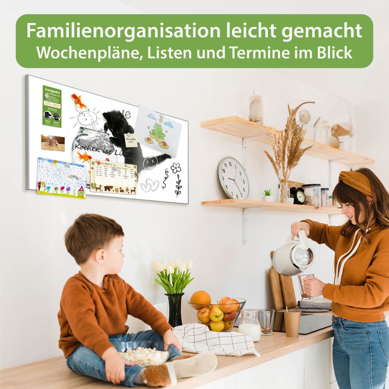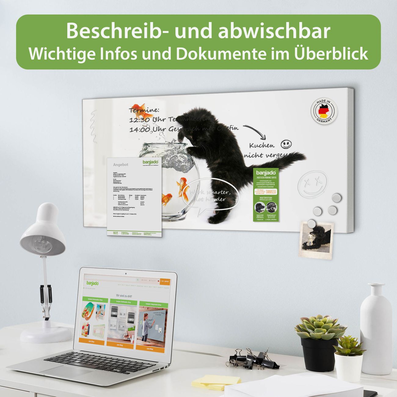 FUNKTION: Die banjado Magnettafel 78x37 cm im Design Motiv Katze Und Fisch vereint Funktionalität und modernes Wohndesign auf stilvolle Weise. Diese hochwertige Magnetwand aus Metall hilft Ihnen dabei, Notizen, Fotos, Termine, Einkaufslisten oder Rezepte übersichtlich zu organisieren. Als praktisches Memoboard sorgt sie für Struktur im Alltag und setzt gleichzeitig einen dekorativen Akzent an Ihrer Wand. DESIGN: Die Metalltafel besteht aus robustem, lackiertem Stahl und ist mit allen handelsüblichen Magneten nutzbar. Besonders praktisch ist die beschreibbare Oberfläche. Sie können die Magnettafel ganz einfach mit Kreidestiften beschriften und die Inhalte bei Bedarf mit einem feuchten Tuch wieder entfernen. So eignet sich das Memoboard ideal für Wochenpläne, Menüpläne, To Do Listen oder kreative Botschaften. DETAILS: Mit ihrem großzügigen Querformat von 78x37 cm bietet die Magnettafel ausreichend Platz für Ihre Organisation. Das Motiv Motiv Katze Und Fisch bringt eine warme, natürliche Optik in Küche, Flur, Büro oder Homeoffice und wirkt auch ohne Magnete oder Beschriftung wie ein modernes Wandbild. NUTZEN: Auf der Rückseite befinden sich vorgefertigte Löcher für eine schnelle und unkomplizierte Wandmontage. Jede banjado Magnettafel wird in Deutschland gefertigt und steht für Qualität, Langlebigkeit und liebevolle Verarbeitung. Dieses beschreibbare Memoboard ist die perfekte Kombination aus Metalltafel, Designobjekt und praktischer Magnetwand für Ihren Alltag. BANJADO: Wir sind ein kleines Team aus dem Herzen von Sachsen. Wir fertigen alle Artikel von Hand für Sie an, Sie erhalten keine preiswerte Importware. Auf Wunsch können Sie auch Ihr eigenes Foto auf die Magnettafel aufbringen, schreiben Sie uns an. Herzlichst, Ihr banjado-Team