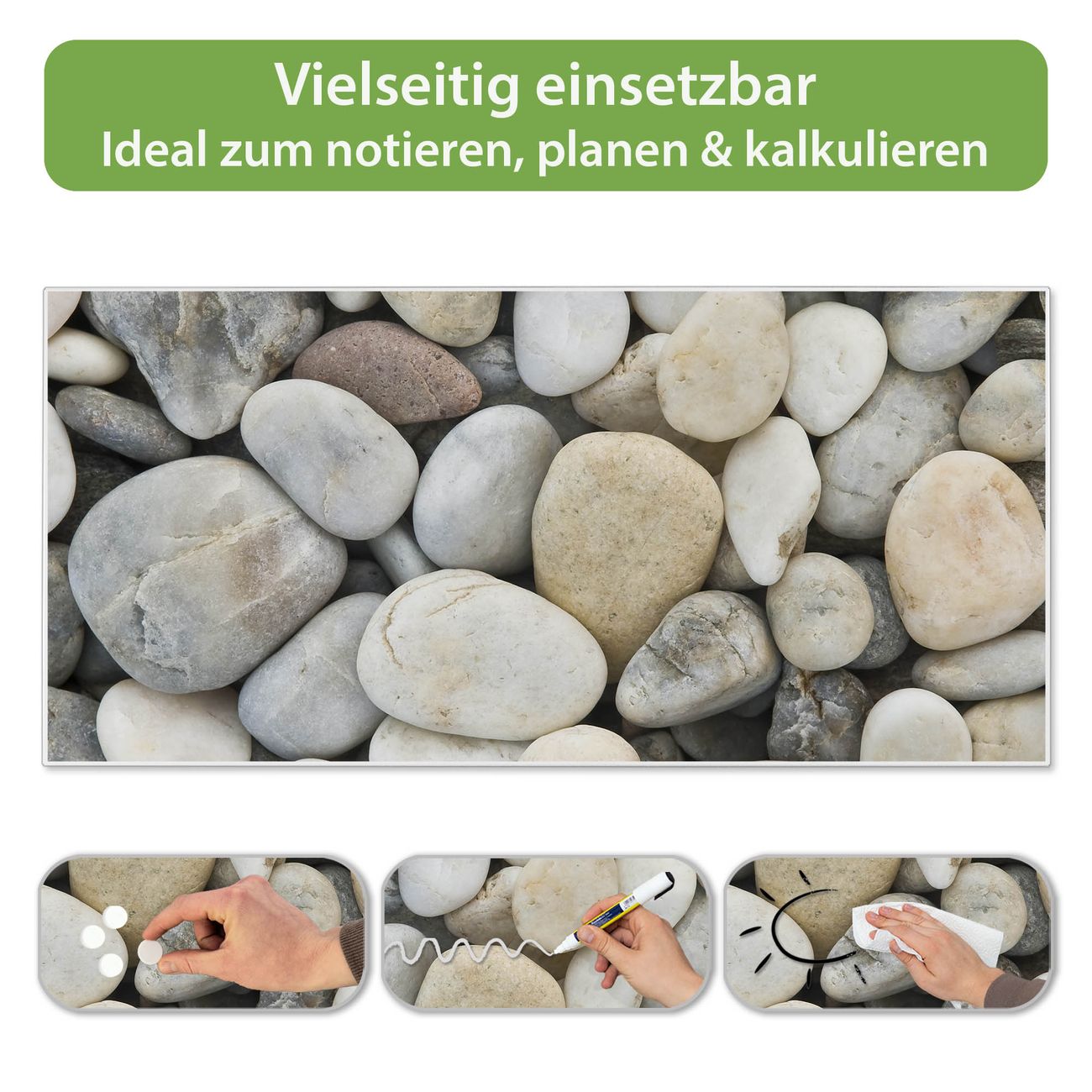 FUNKTION: Die banjado Magnettafel 78x37 cm im Design Motiv Kieselsteine vereint Funktionalität und modernes Wohndesign auf stilvolle Weise. Diese hochwertige Magnetwand aus Metall hilft Ihnen dabei, Notizen, Fotos, Termine, Einkaufslisten oder Rezepte übersichtlich zu organisieren. Als praktisches Memoboard sorgt sie für Struktur im Alltag und setzt gleichzeitig einen dekorativen Akzent an Ihrer Wand. DESIGN: Die Metalltafel besteht aus robustem, lackiertem Stahl und ist mit allen handelsüblichen Magneten nutzbar. Besonders praktisch ist die beschreibbare Oberfläche. Sie können die Magnettafel ganz einfach mit Kreidestiften beschriften und die Inhalte bei Bedarf mit einem feuchten Tuch wieder entfernen. So eignet sich das Memoboard ideal für Wochenpläne, Menüpläne, To Do Listen oder kreative Botschaften. DETAILS: Mit ihrem großzügigen Querformat von 78x37 cm bietet die Magnettafel ausreichend Platz für Ihre Organisation. Das Motiv Motiv Kieselsteine bringt eine warme, natürliche Optik in Küche, Flur, Büro oder Homeoffice und wirkt auch ohne Magnete oder Beschriftung wie ein modernes Wandbild. NUTZEN: Auf der Rückseite befinden sich vorgefertigte Löcher für eine schnelle und unkomplizierte Wandmontage. Jede banjado Magnettafel wird in Deutschland gefertigt und steht für Qualität, Langlebigkeit und liebevolle Verarbeitung. Dieses beschreibbare Memoboard ist die perfekte Kombination aus Metalltafel, Designobjekt und praktischer Magnetwand für Ihren Alltag. BANJADO: Wir sind ein kleines Team aus dem Herzen von Sachsen. Wir fertigen alle Artikel von Hand für Sie an, Sie erhalten keine preiswerte Importware. Auf Wunsch können Sie auch Ihr eigenes Foto auf die Magnettafel aufbringen, schreiben Sie uns an. Herzlichst, Ihr banjado-Team