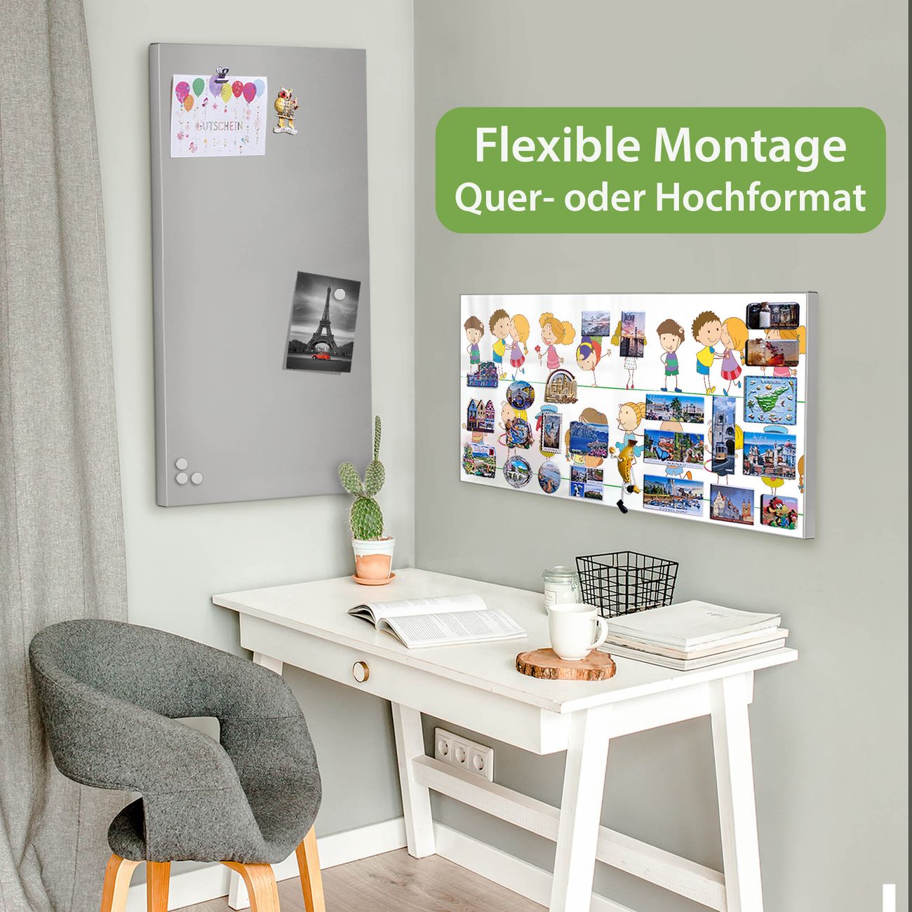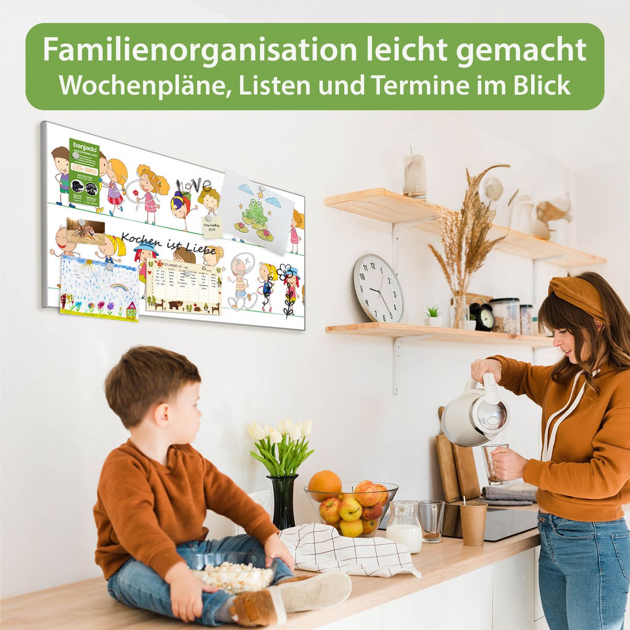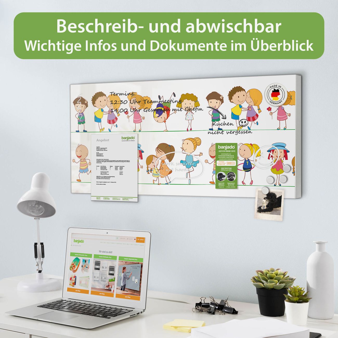 FUNKTION: Die banjado Magnettafel 78x37 cm im Design Motiv Kinder vereint Funktionalität und modernes Wohndesign auf stilvolle Weise. Diese hochwertige Magnetwand aus Metall hilft Ihnen dabei, Notizen, Fotos, Termine, Einkaufslisten oder Rezepte übersichtlich zu organisieren. Als praktisches Memoboard sorgt sie für Struktur im Alltag und setzt gleichzeitig einen dekorativen Akzent an Ihrer Wand. DESIGN: Die Metalltafel besteht aus robustem, lackiertem Stahl und ist mit allen handelsüblichen Magneten nutzbar. Besonders praktisch ist die beschreibbare Oberfläche. Sie können die Magnettafel ganz einfach mit Kreidestiften beschriften und die Inhalte bei Bedarf mit einem feuchten Tuch wieder entfernen. So eignet sich das Memoboard ideal für Wochenpläne, Menüpläne, To Do Listen oder kreative Botschaften. DETAILS: Mit ihrem großzügigen Querformat von 78x37 cm bietet die Magnettafel ausreichend Platz für Ihre Organisation. Das Motiv Motiv Kinder bringt eine warme, natürliche Optik in Küche, Flur, Büro oder Homeoffice und wirkt auch ohne Magnete oder Beschriftung wie ein modernes Wandbild. NUTZEN: Auf der Rückseite befinden sich vorgefertigte Löcher für eine schnelle und unkomplizierte Wandmontage. Jede banjado Magnettafel wird in Deutschland gefertigt und steht für Qualität, Langlebigkeit und liebevolle Verarbeitung. Dieses beschreibbare Memoboard ist die perfekte Kombination aus Metalltafel, Designobjekt und praktischer Magnetwand für Ihren Alltag. BANJADO: Wir sind ein kleines Team aus dem Herzen von Sachsen. Wir fertigen alle Artikel von Hand für Sie an, Sie erhalten keine preiswerte Importware. Auf Wunsch können Sie auch Ihr eigenes Foto auf die Magnettafel aufbringen, schreiben Sie uns an. Herzlichst, Ihr banjado-Team