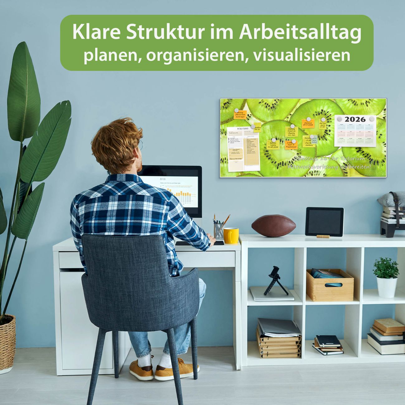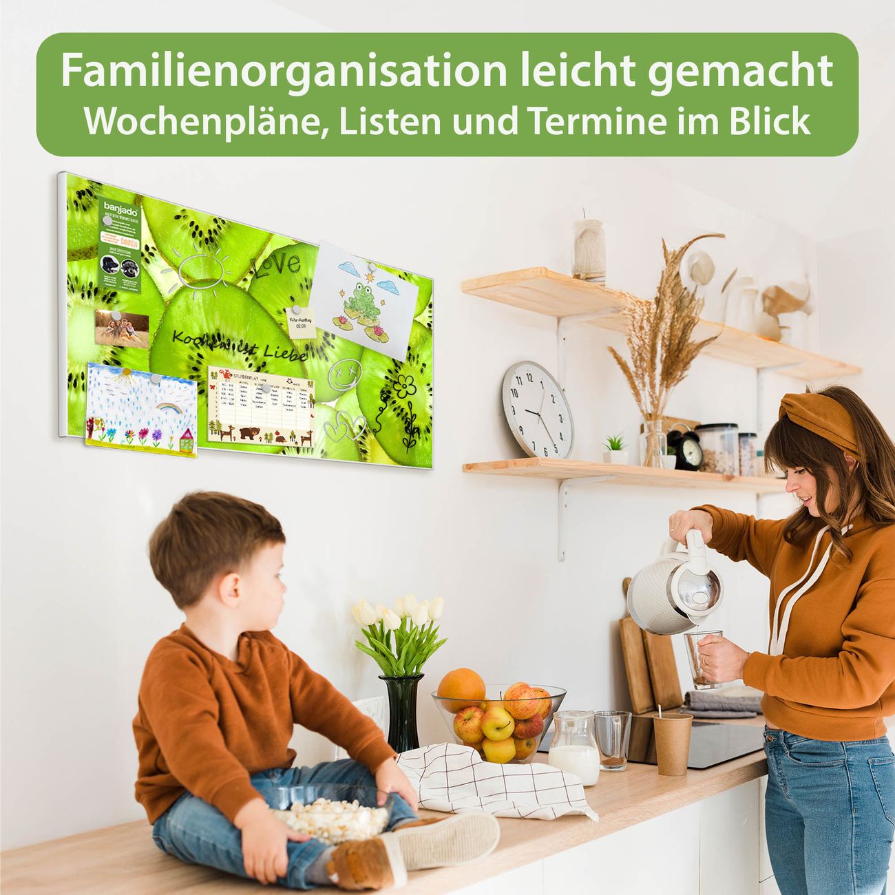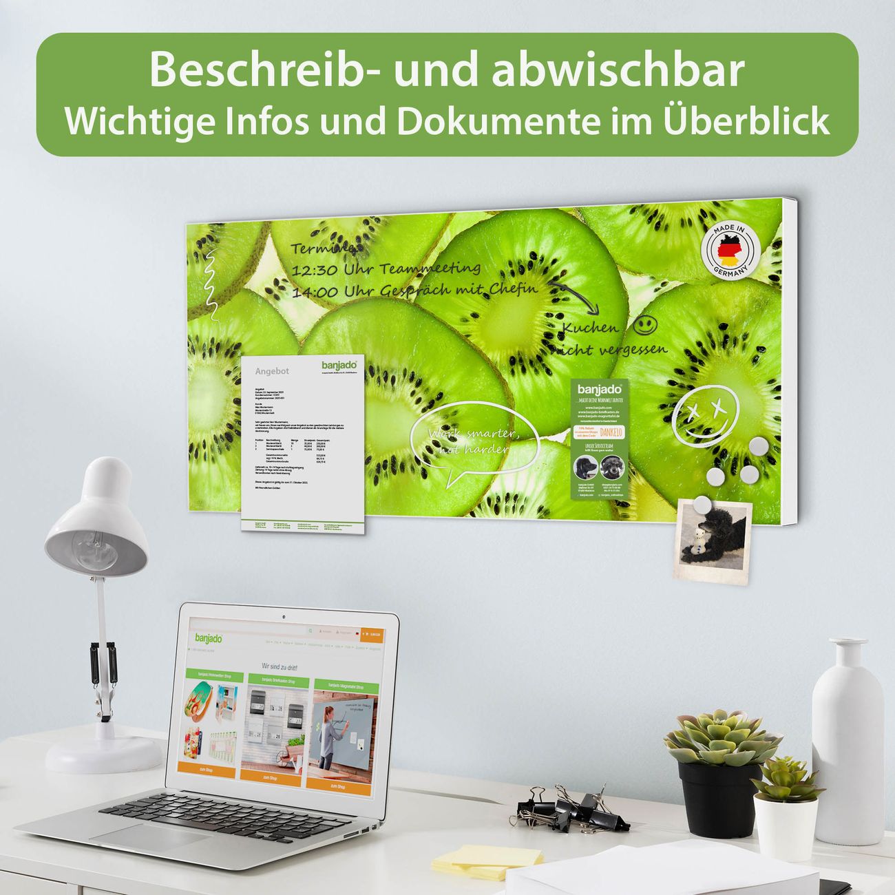 FUNKTION: Die banjado Magnettafel 78x37 cm im Design Motiv Kiwi vereint Funktionalität und modernes Wohndesign auf stilvolle Weise. Diese hochwertige Magnetwand aus Metall hilft Ihnen dabei, Notizen, Fotos, Termine, Einkaufslisten oder Rezepte übersichtlich zu organisieren. Als praktisches Memoboard sorgt sie für Struktur im Alltag und setzt gleichzeitig einen dekorativen Akzent an Ihrer Wand. DESIGN: Die Metalltafel besteht aus robustem, lackiertem Stahl und ist mit allen handelsüblichen Magneten nutzbar. Besonders praktisch ist die beschreibbare Oberfläche. Sie können die Magnettafel ganz einfach mit Kreidestiften beschriften und die Inhalte bei Bedarf mit einem feuchten Tuch wieder entfernen. So eignet sich das Memoboard ideal für Wochenpläne, Menüpläne, To Do Listen oder kreative Botschaften. DETAILS: Mit ihrem großzügigen Querformat von 78x37 cm bietet die Magnettafel ausreichend Platz für Ihre Organisation. Das Motiv Motiv Kiwi bringt eine warme, natürliche Optik in Küche, Flur, Büro oder Homeoffice und wirkt auch ohne Magnete oder Beschriftung wie ein modernes Wandbild. NUTZEN: Auf der Rückseite befinden sich vorgefertigte Löcher für eine schnelle und unkomplizierte Wandmontage. Jede banjado Magnettafel wird in Deutschland gefertigt und steht für Qualität, Langlebigkeit und liebevolle Verarbeitung. Dieses beschreibbare Memoboard ist die perfekte Kombination aus Metalltafel, Designobjekt und praktischer Magnetwand für Ihren Alltag. BANJADO: Wir sind ein kleines Team aus dem Herzen von Sachsen. Wir fertigen alle Artikel von Hand für Sie an, Sie erhalten keine preiswerte Importware. Auf Wunsch können Sie auch Ihr eigenes Foto auf die Magnettafel aufbringen, schreiben Sie uns an. Herzlichst, Ihr banjado-Team
