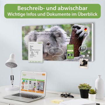 FUNKTION: Die banjado Magnettafel 78x37 cm im Design Motiv Koala vereint Funktionalität und modernes Wohndesign auf stilvolle Weise. Diese hochwertige Magnetwand aus Metall hilft Ihnen dabei, Notizen, Fotos, Termine, Einkaufslisten oder Rezepte übersichtlich zu organisieren. Als praktisches Memoboard sorgt sie für Struktur im Alltag und setzt gleichzeitig einen dekorativen Akzent an Ihrer Wand. DESIGN: Die Metalltafel besteht aus robustem, lackiertem Stahl und ist mit allen handelsüblichen Magneten nutzbar. Besonders praktisch ist die beschreibbare Oberfläche. Sie können die Magnettafel ganz einfach mit Kreidestiften beschriften und die Inhalte bei Bedarf mit einem feuchten Tuch wieder entfernen. So eignet sich das Memoboard ideal für Wochenpläne, Menüpläne, To Do Listen oder kreative Botschaften. DETAILS: Mit ihrem großzügigen Querformat von 78x37 cm bietet die Magnettafel ausreichend Platz für Ihre Organisation. Das Motiv Motiv Koala bringt eine warme, natürliche Optik in Küche, Flur, Büro oder Homeoffice und wirkt auch ohne Magnete oder Beschriftung wie ein modernes Wandbild. NUTZEN: Auf der Rückseite befinden sich vorgefertigte Löcher für eine schnelle und unkomplizierte Wandmontage. Jede banjado Magnettafel wird in Deutschland gefertigt und steht für Qualität, Langlebigkeit und liebevolle Verarbeitung. Dieses beschreibbare Memoboard ist die perfekte Kombination aus Metalltafel, Designobjekt und praktischer Magnetwand für Ihren Alltag. BANJADO: Wir sind ein kleines Team aus dem Herzen von Sachsen. Wir fertigen alle Artikel von Hand für Sie an, Sie erhalten keine preiswerte Importware. Auf Wunsch können Sie auch Ihr eigenes Foto auf die Magnettafel aufbringen, schreiben Sie uns an. Herzlichst, Ihr banjado-Team