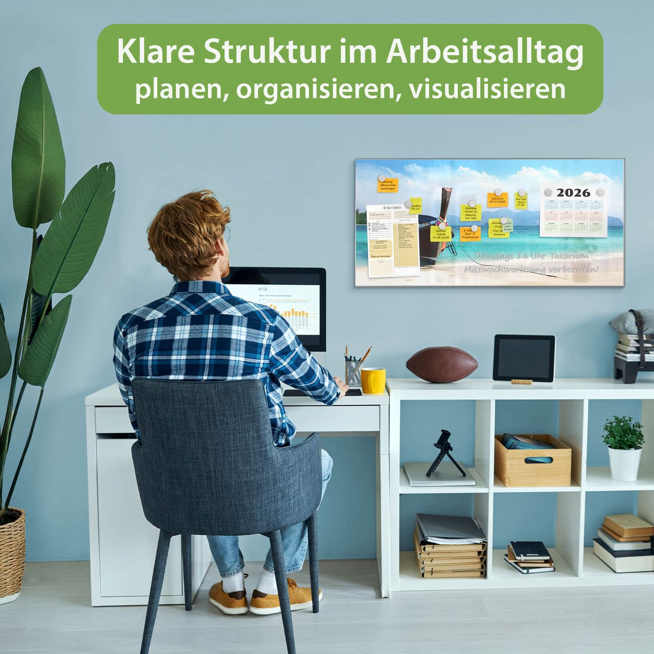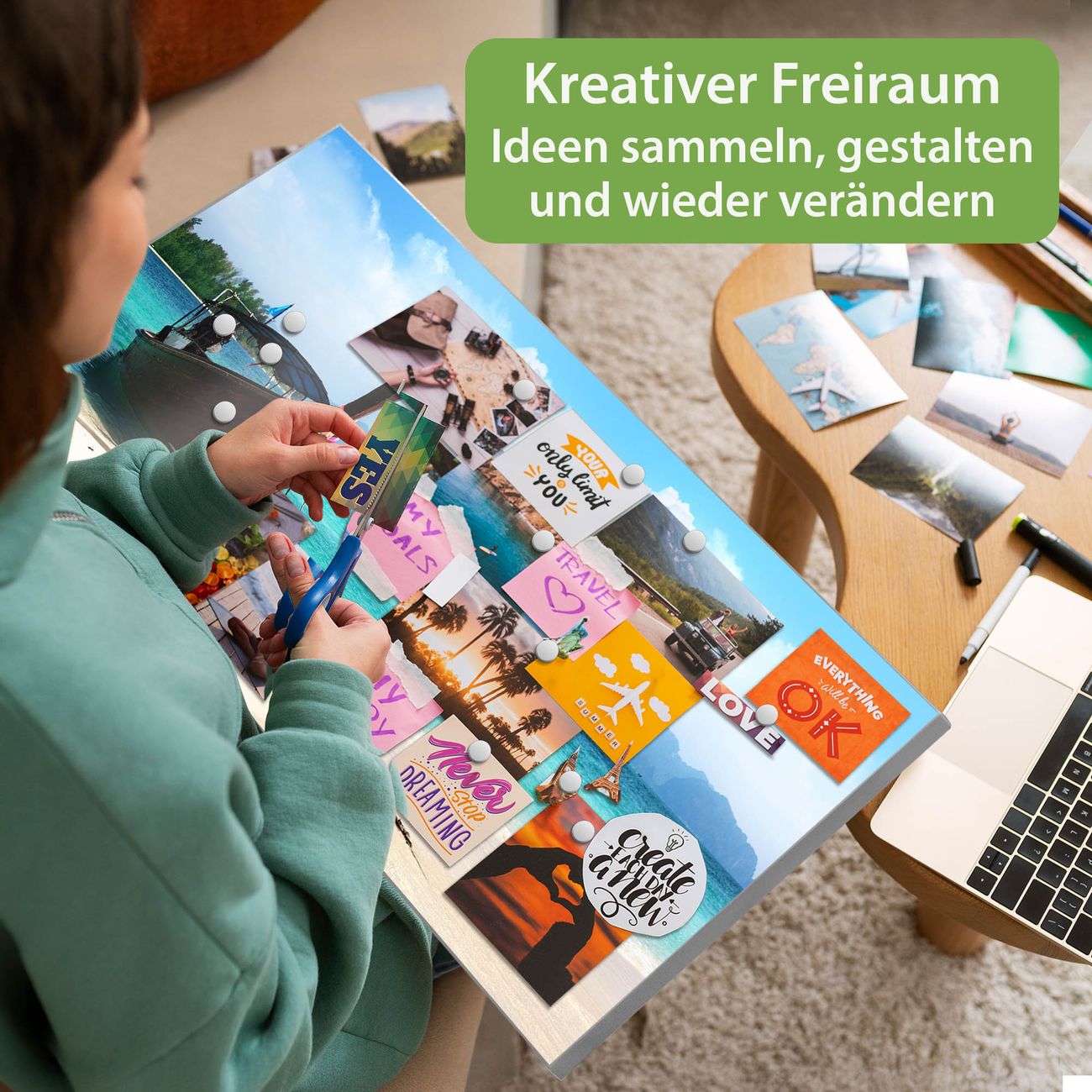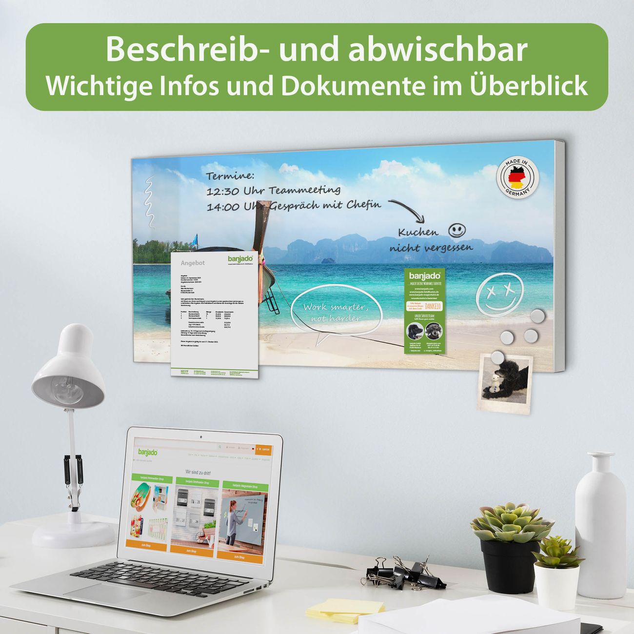 FUNKTION: Die banjado Magnettafel 78x37 cm im Design Motiv Koh Poda vereint Funktionalität und modernes Wohndesign auf stilvolle Weise. Diese hochwertige Magnetwand aus Metall hilft Ihnen dabei, Notizen, Fotos, Termine, Einkaufslisten oder Rezepte übersichtlich zu organisieren. Als praktisches Memoboard sorgt sie für Struktur im Alltag und setzt gleichzeitig einen dekorativen Akzent an Ihrer Wand. DESIGN: Die Metalltafel besteht aus robustem, lackiertem Stahl und ist mit allen handelsüblichen Magneten nutzbar. Besonders praktisch ist die beschreibbare Oberfläche. Sie können die Magnettafel ganz einfach mit Kreidestiften beschriften und die Inhalte bei Bedarf mit einem feuchten Tuch wieder entfernen. So eignet sich das Memoboard ideal für Wochenpläne, Menüpläne, To Do Listen oder kreative Botschaften. DETAILS: Mit ihrem großzügigen Querformat von 78x37 cm bietet die Magnettafel ausreichend Platz für Ihre Organisation. Das Motiv Motiv Koh Poda bringt eine warme, natürliche Optik in Küche, Flur, Büro oder Homeoffice und wirkt auch ohne Magnete oder Beschriftung wie ein modernes Wandbild. NUTZEN: Auf der Rückseite befinden sich vorgefertigte Löcher für eine schnelle und unkomplizierte Wandmontage. Jede banjado Magnettafel wird in Deutschland gefertigt und steht für Qualität, Langlebigkeit und liebevolle Verarbeitung. Dieses beschreibbare Memoboard ist die perfekte Kombination aus Metalltafel, Designobjekt und praktischer Magnetwand für Ihren Alltag. BANJADO: Wir sind ein kleines Team aus dem Herzen von Sachsen. Wir fertigen alle Artikel von Hand für Sie an, Sie erhalten keine preiswerte Importware. Auf Wunsch können Sie auch Ihr eigenes Foto auf die Magnettafel aufbringen, schreiben Sie uns an. Herzlichst, Ihr banjado-Team