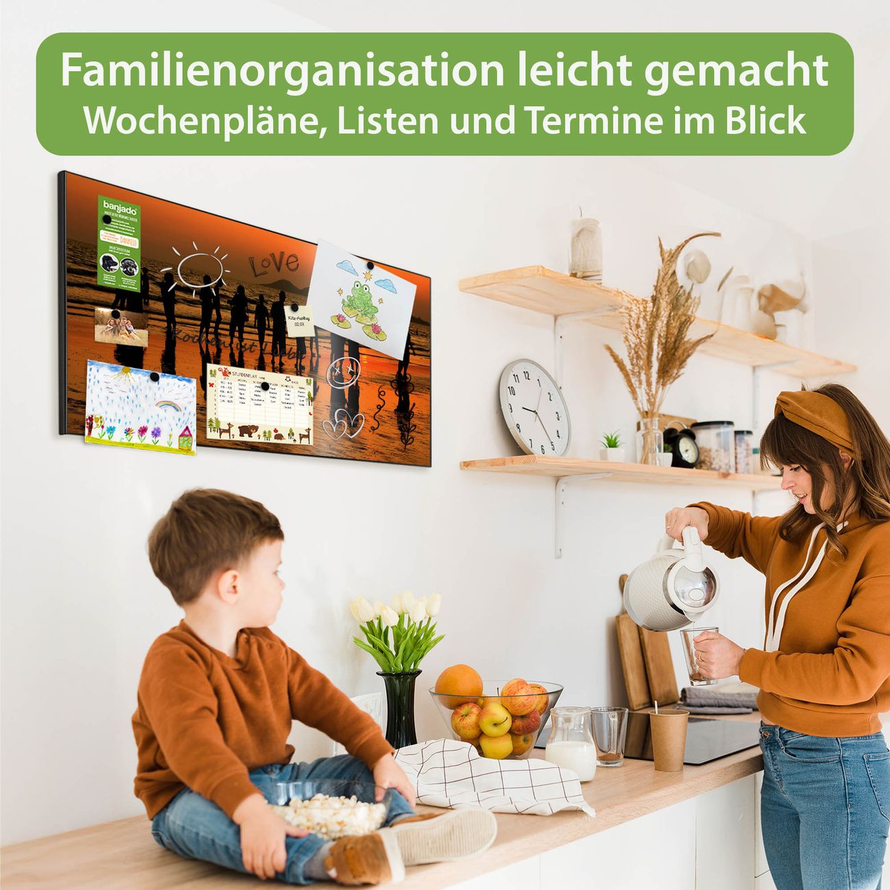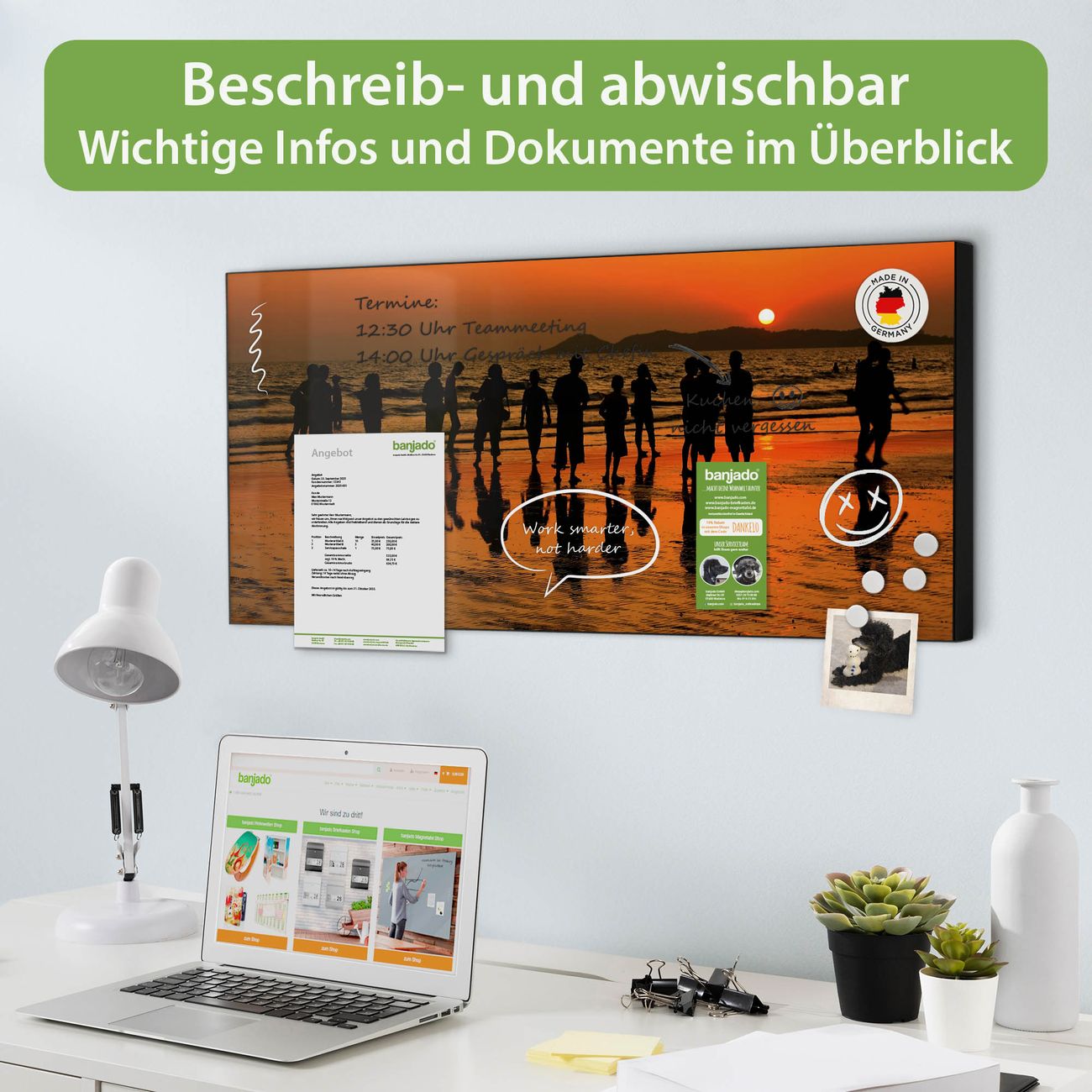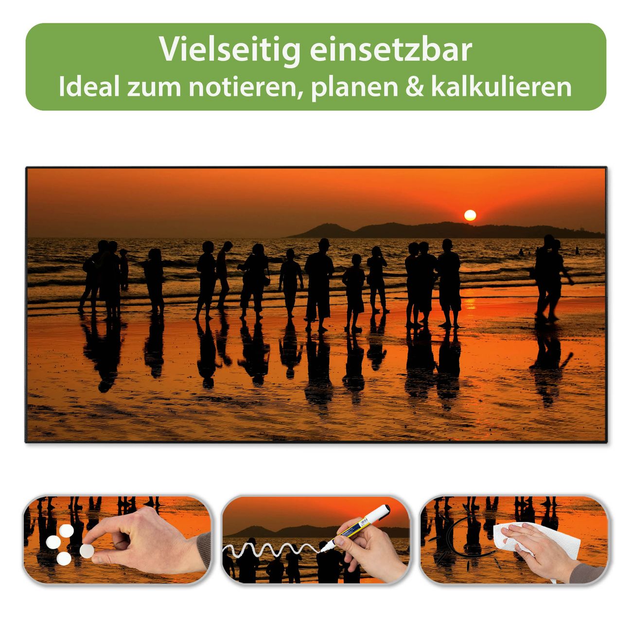 FUNKTION: Die banjado Magnettafel 78x37 cm im Design Motiv Koh Samet Beach vereint Funktionalität und modernes Wohndesign auf stilvolle Weise. Diese hochwertige Magnetwand aus Metall hilft Ihnen dabei, Notizen, Fotos, Termine, Einkaufslisten oder Rezepte übersichtlich zu organisieren. Als praktisches Memoboard sorgt sie für Struktur im Alltag und setzt gleichzeitig einen dekorativen Akzent an Ihrer Wand. DESIGN: Die Metalltafel besteht aus robustem, lackiertem Stahl und ist mit allen handelsüblichen Magneten nutzbar. Besonders praktisch ist die beschreibbare Oberfläche. Sie können die Magnettafel ganz einfach mit Kreidestiften beschriften und die Inhalte bei Bedarf mit einem feuchten Tuch wieder entfernen. So eignet sich das Memoboard ideal für Wochenpläne, Menüpläne, To Do Listen oder kreative Botschaften. DETAILS: Mit ihrem großzügigen Querformat von 78x37 cm bietet die Magnettafel ausreichend Platz für Ihre Organisation. Das Motiv Motiv Koh Samet Beach bringt eine warme, natürliche Optik in Küche, Flur, Büro oder Homeoffice und wirkt auch ohne Magnete oder Beschriftung wie ein modernes Wandbild. NUTZEN: Auf der Rückseite befinden sich vorgefertigte Löcher für eine schnelle und unkomplizierte Wandmontage. Jede banjado Magnettafel wird in Deutschland gefertigt und steht für Qualität, Langlebigkeit und liebevolle Verarbeitung. Dieses beschreibbare Memoboard ist die perfekte Kombination aus Metalltafel, Designobjekt und praktischer Magnetwand für Ihren Alltag. BANJADO: Wir sind ein kleines Team aus dem Herzen von Sachsen. Wir fertigen alle Artikel von Hand für Sie an, Sie erhalten keine preiswerte Importware. Auf Wunsch können Sie auch Ihr eigenes Foto auf die Magnettafel aufbringen, schreiben Sie uns an. Herzlichst, Ihr banjado-Team