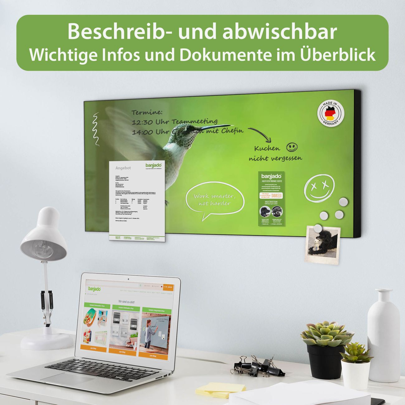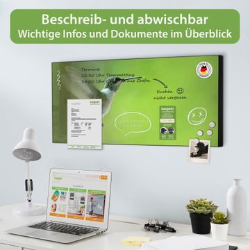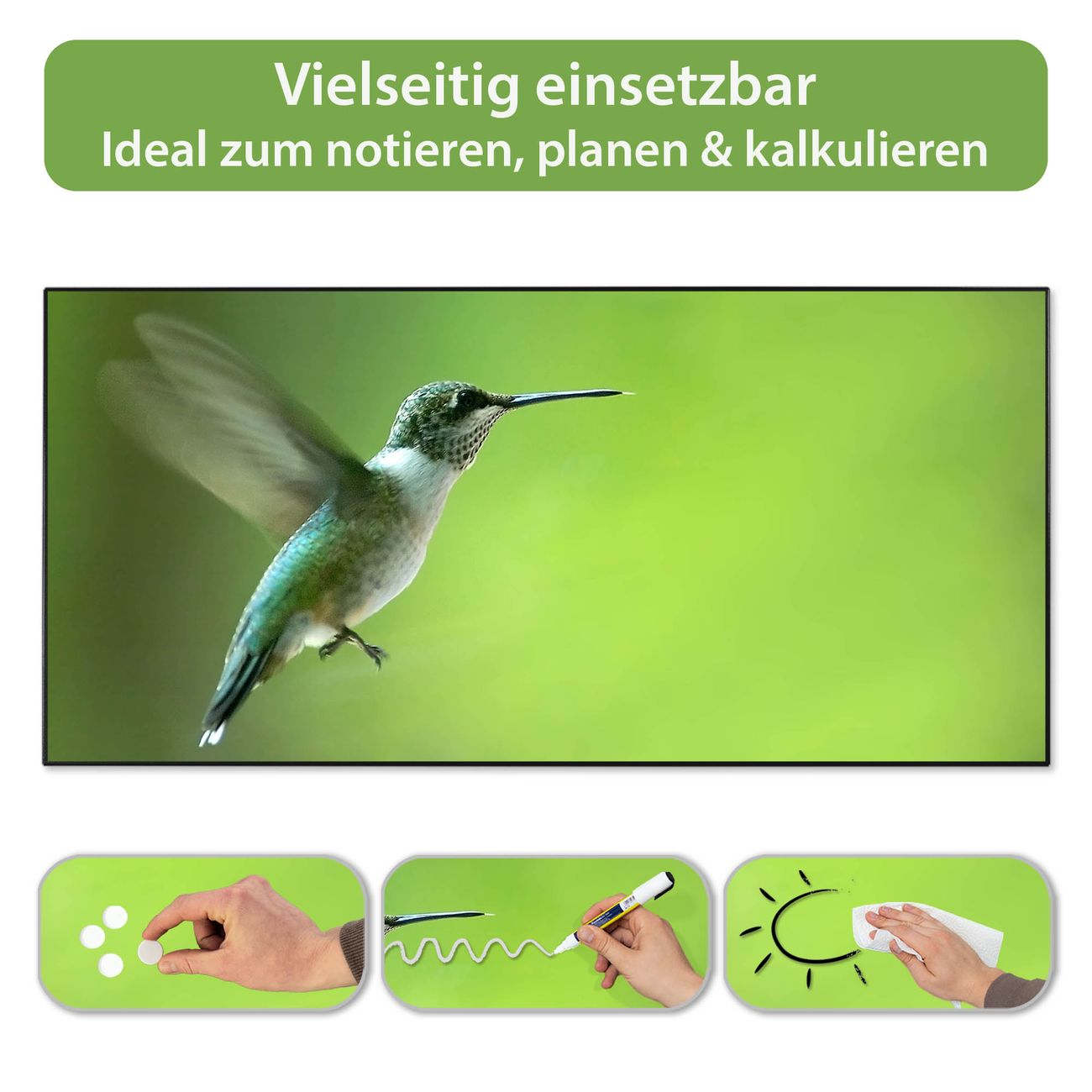 FUNKTION: Die banjado Magnettafel 78x37 cm im Design Motiv Kolibri vereint Funktionalität und modernes Wohndesign auf stilvolle Weise. Diese hochwertige Magnetwand aus Metall hilft Ihnen dabei, Notizen, Fotos, Termine, Einkaufslisten oder Rezepte übersichtlich zu organisieren. Als praktisches Memoboard sorgt sie für Struktur im Alltag und setzt gleichzeitig einen dekorativen Akzent an Ihrer Wand. DESIGN: Die Metalltafel besteht aus robustem, lackiertem Stahl und ist mit allen handelsüblichen Magneten nutzbar. Besonders praktisch ist die beschreibbare Oberfläche. Sie können die Magnettafel ganz einfach mit Kreidestiften beschriften und die Inhalte bei Bedarf mit einem feuchten Tuch wieder entfernen. So eignet sich das Memoboard ideal für Wochenpläne, Menüpläne, To Do Listen oder kreative Botschaften. DETAILS: Mit ihrem großzügigen Querformat von 78x37 cm bietet die Magnettafel ausreichend Platz für Ihre Organisation. Das Motiv Motiv Kolibri bringt eine warme, natürliche Optik in Küche, Flur, Büro oder Homeoffice und wirkt auch ohne Magnete oder Beschriftung wie ein modernes Wandbild. NUTZEN: Auf der Rückseite befinden sich vorgefertigte Löcher für eine schnelle und unkomplizierte Wandmontage. Jede banjado Magnettafel wird in Deutschland gefertigt und steht für Qualität, Langlebigkeit und liebevolle Verarbeitung. Dieses beschreibbare Memoboard ist die perfekte Kombination aus Metalltafel, Designobjekt und praktischer Magnetwand für Ihren Alltag. BANJADO: Wir sind ein kleines Team aus dem Herzen von Sachsen. Wir fertigen alle Artikel von Hand für Sie an, Sie erhalten keine preiswerte Importware. Auf Wunsch können Sie auch Ihr eigenes Foto auf die Magnettafel aufbringen, schreiben Sie uns an. Herzlichst, Ihr banjado-Team