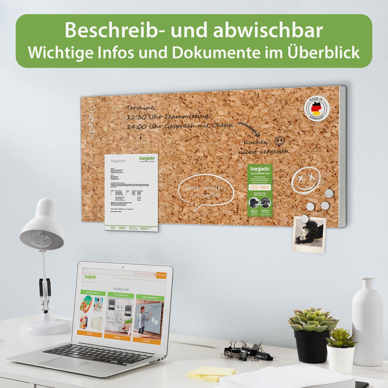 FUNKTION: Die banjado Magnettafel 78x37 cm im Design Motiv Kork vereint Funktionalität und modernes Wohndesign auf stilvolle Weise. Diese hochwertige Magnetwand aus Metall hilft Ihnen dabei, Notizen, Fotos, Termine, Einkaufslisten oder Rezepte übersichtlich zu organisieren. Als praktisches Memoboard sorgt sie für Struktur im Alltag und setzt gleichzeitig einen dekorativen Akzent an Ihrer Wand. DESIGN: Die Metalltafel besteht aus robustem, lackiertem Stahl und ist mit allen handelsüblichen Magneten nutzbar. Besonders praktisch ist die beschreibbare Oberfläche. Sie können die Magnettafel ganz einfach mit Kreidestiften beschriften und die Inhalte bei Bedarf mit einem feuchten Tuch wieder entfernen. So eignet sich das Memoboard ideal für Wochenpläne, Menüpläne, To Do Listen oder kreative Botschaften. DETAILS: Mit ihrem großzügigen Querformat von 78x37 cm bietet die Magnettafel ausreichend Platz für Ihre Organisation. Das Motiv Motiv Kork bringt eine warme, natürliche Optik in Küche, Flur, Büro oder Homeoffice und wirkt auch ohne Magnete oder Beschriftung wie ein modernes Wandbild. NUTZEN: Auf der Rückseite befinden sich vorgefertigte Löcher für eine schnelle und unkomplizierte Wandmontage. Jede banjado Magnettafel wird in Deutschland gefertigt und steht für Qualität, Langlebigkeit und liebevolle Verarbeitung. Dieses beschreibbare Memoboard ist die perfekte Kombination aus Metalltafel, Designobjekt und praktischer Magnetwand für Ihren Alltag. BANJADO: Wir sind ein kleines Team aus dem Herzen von Sachsen. Wir fertigen alle Artikel von Hand für Sie an, Sie erhalten keine preiswerte Importware. Auf Wunsch können Sie auch Ihr eigenes Foto auf die Magnettafel aufbringen, schreiben Sie uns an. Herzlichst, Ihr banjado-Team